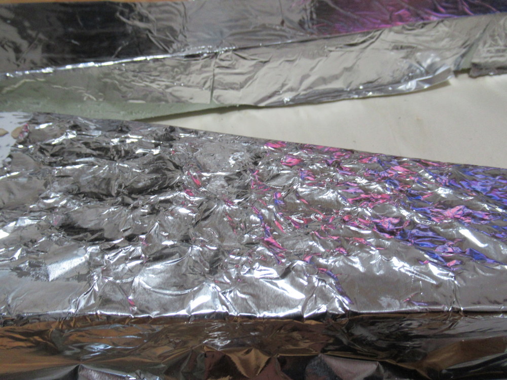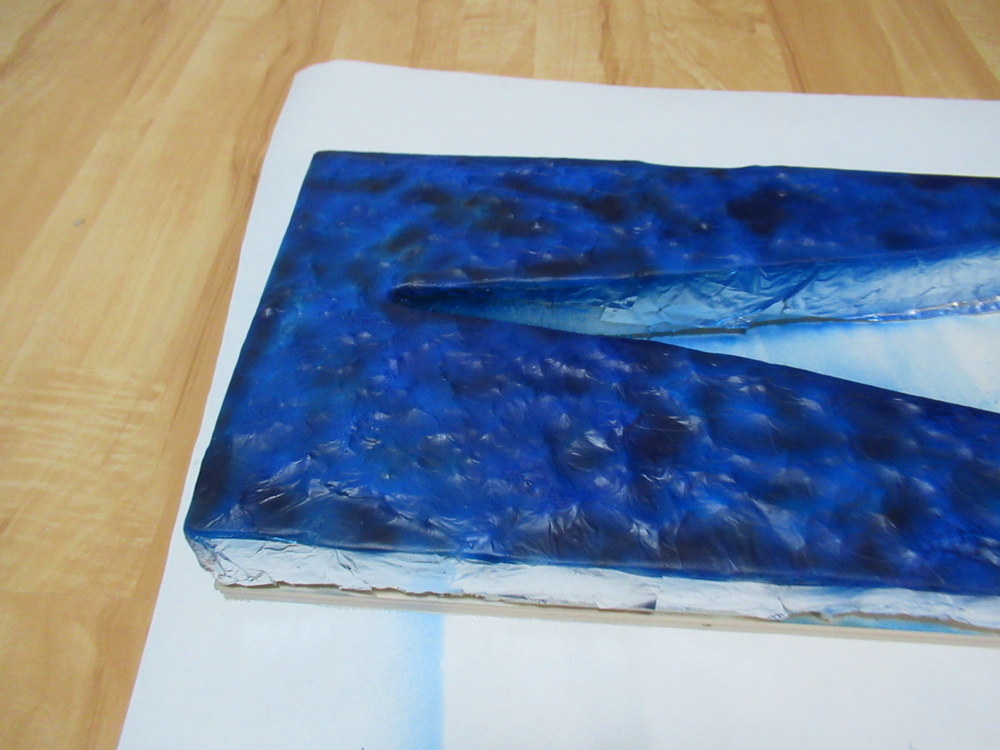 ( 2/1) eingepinselt . Dann das Alufolie auflegen und fest andrücken . Hier entstehen schon kleine Falten und Unebenheiten ( Was ggf als stilles Gewässer schon durch geht )