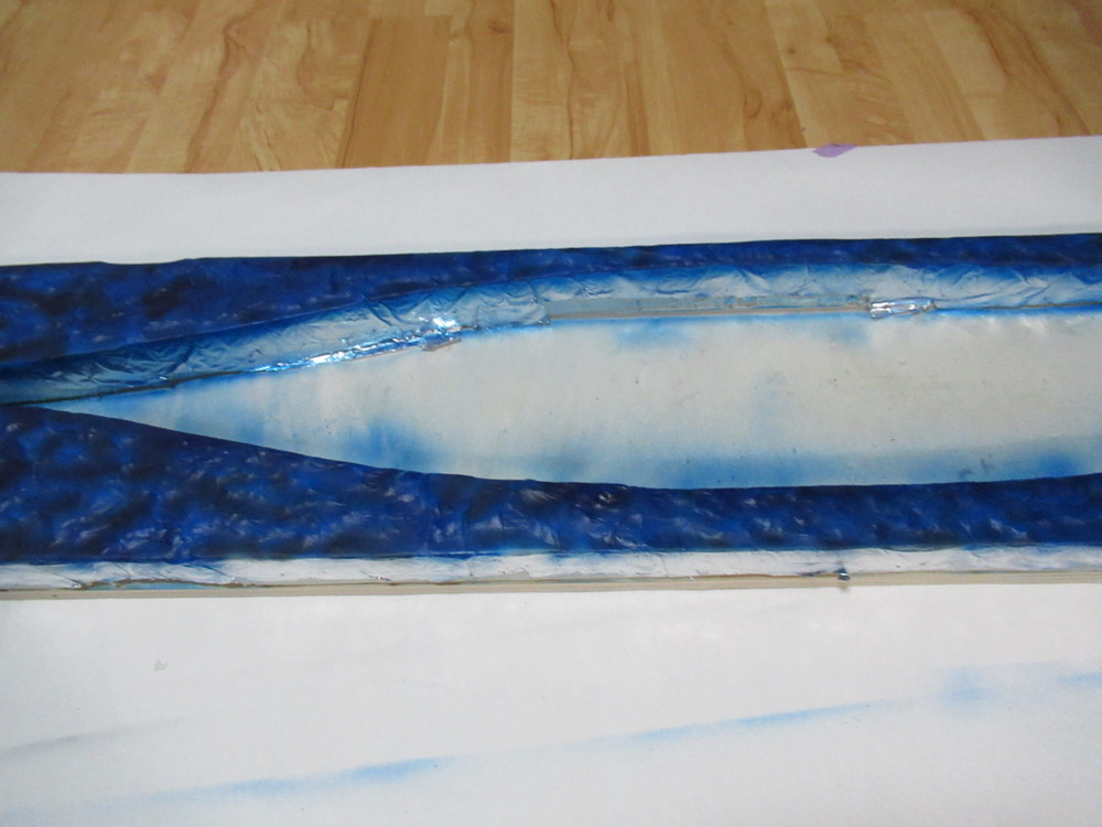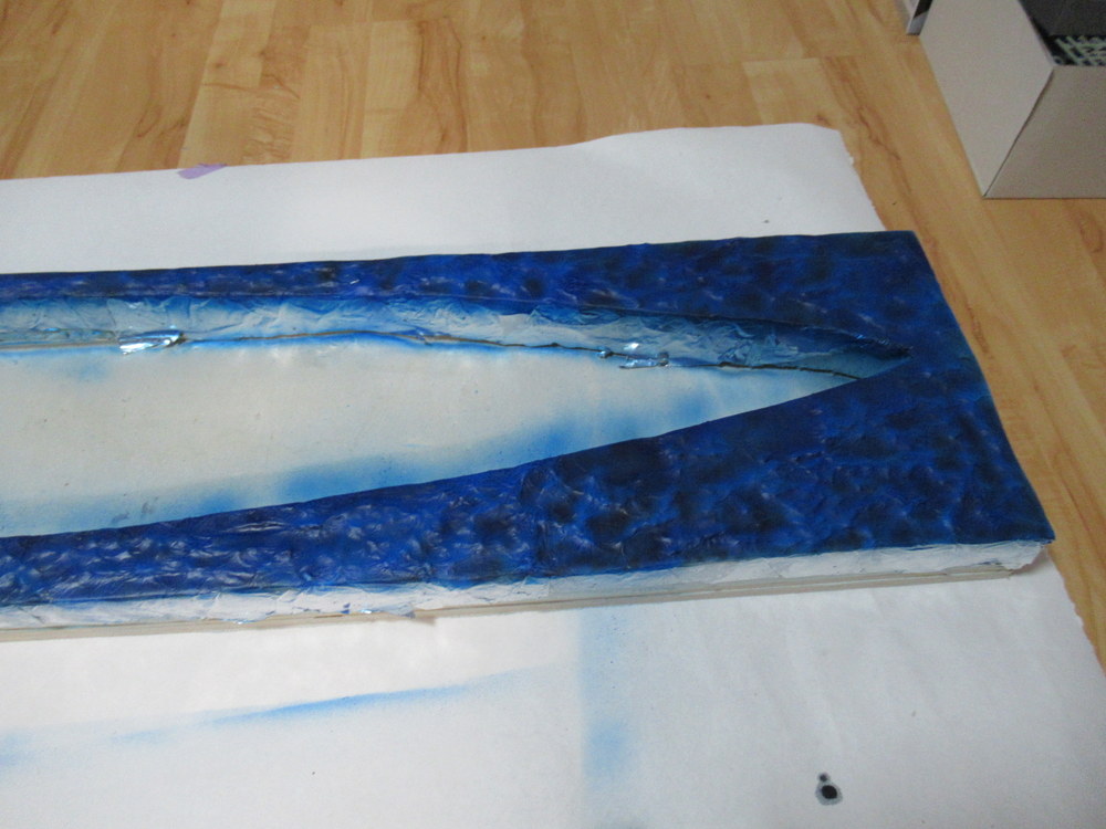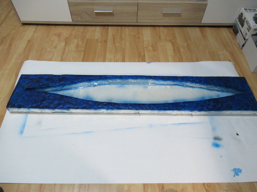 Bevor man diese aufklebt , sollte man überlegen , wie stark der Wellengang sein soll . Für etwas stärkeren Wellengang kann man dann kleinere Alustreifen nehmen und die zusammenknutscheln und die Form der Welle bestimmen . Da kann man beliebig viel und Größe machen . Je nachdem wie das Wasser sein soll .