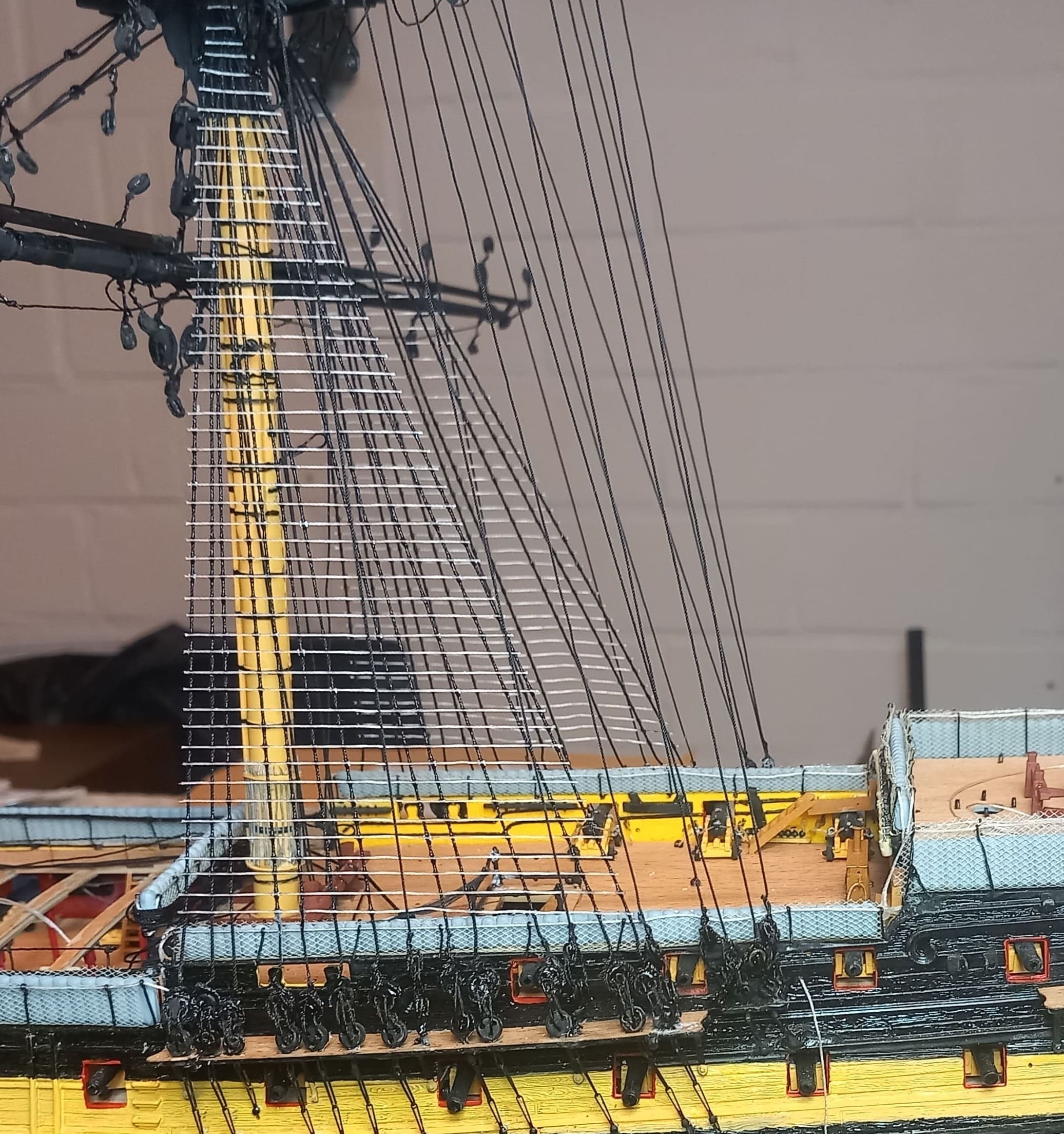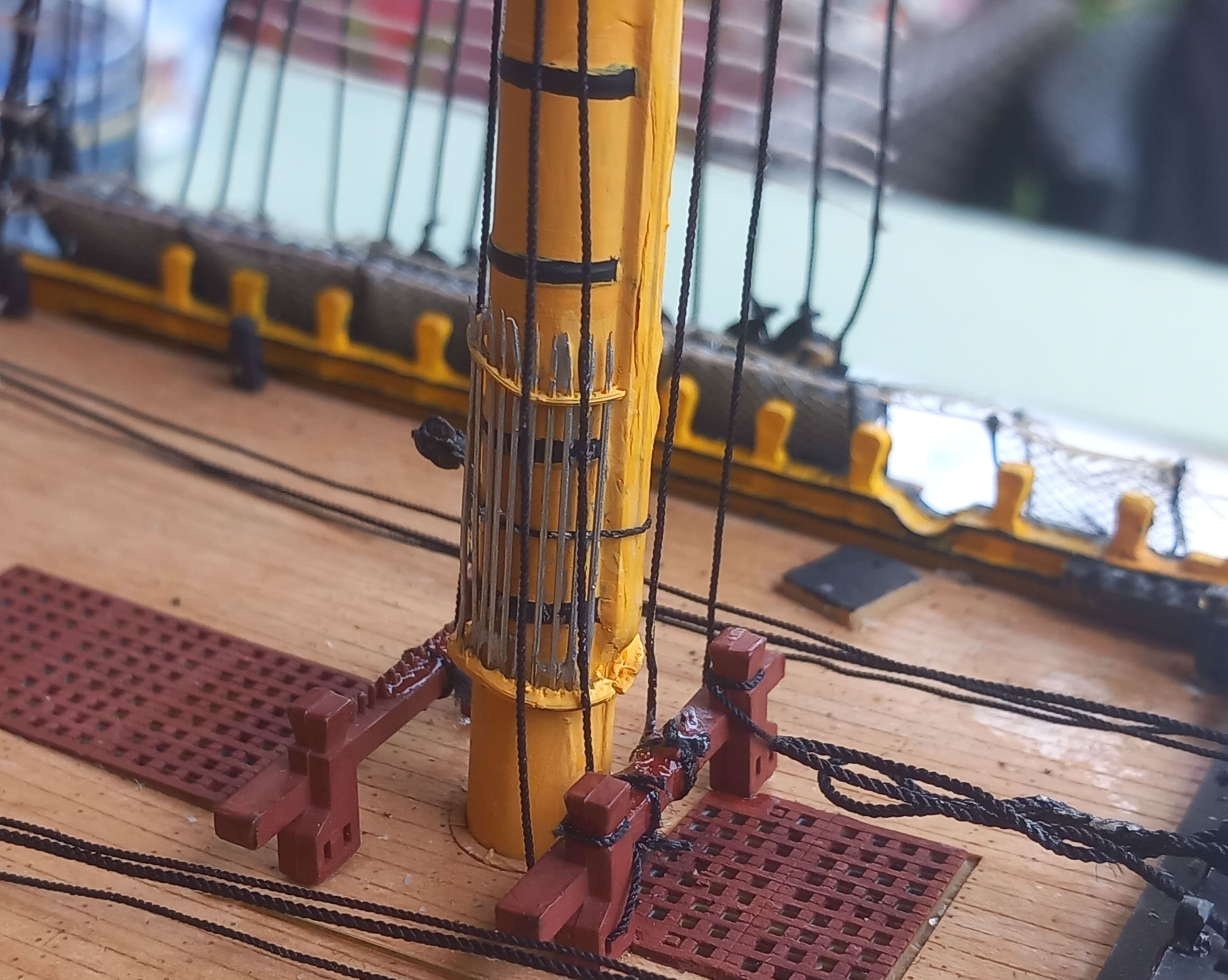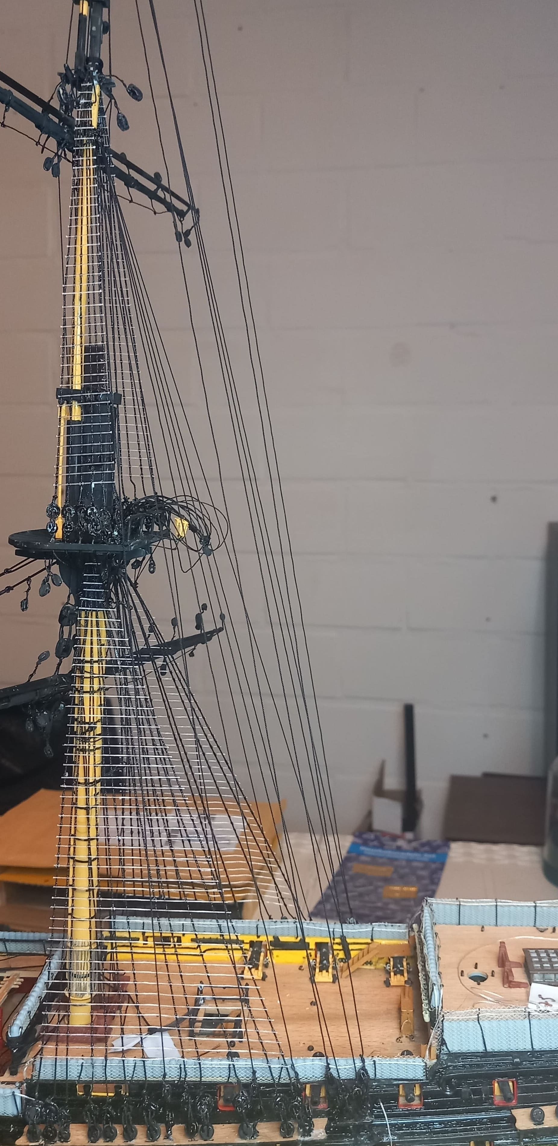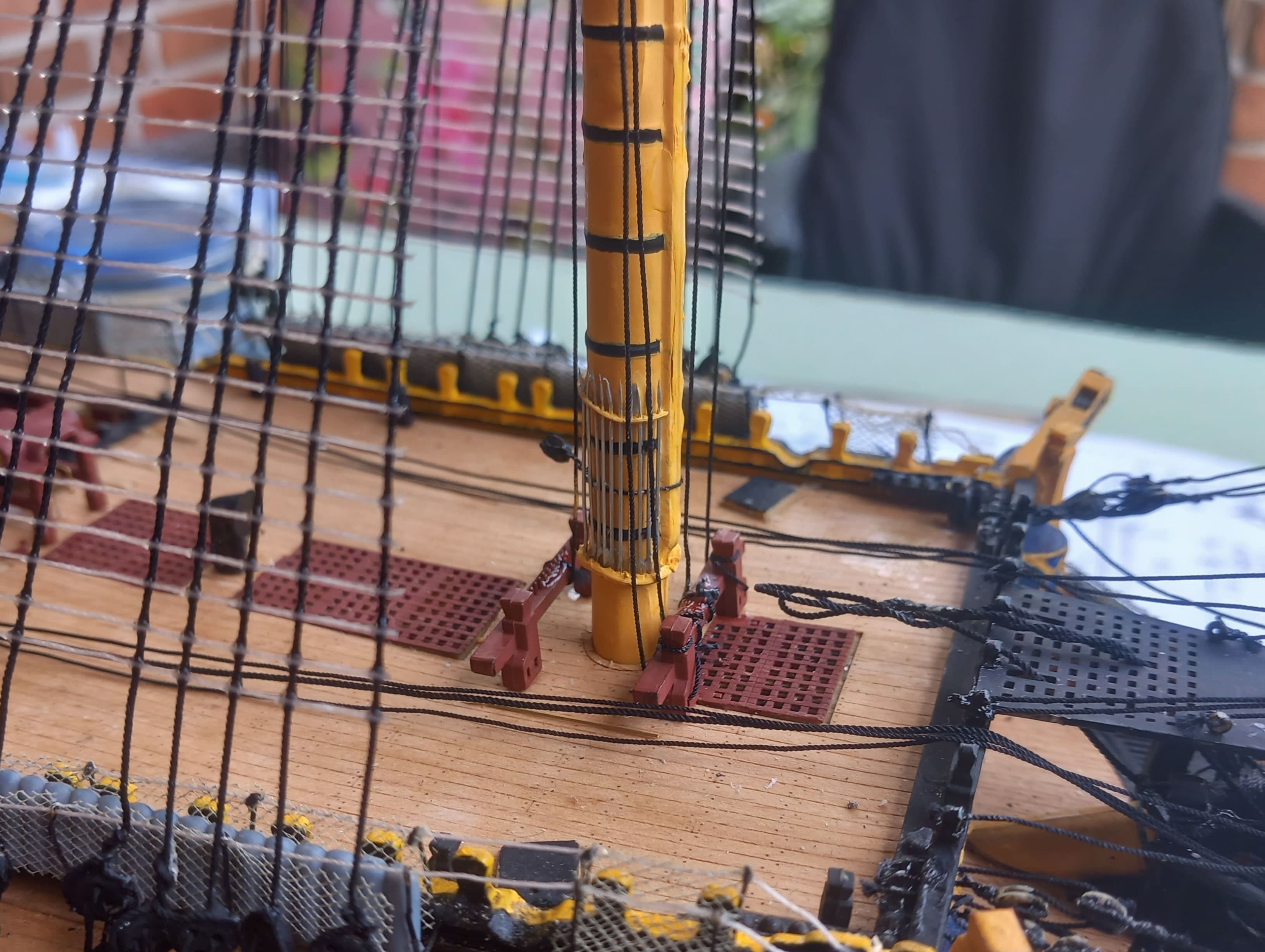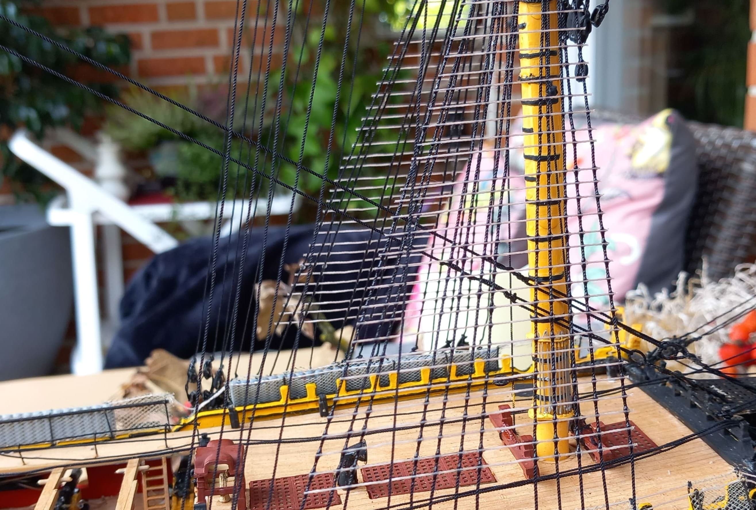 Bin jetzt mit dem Hauptmast vorläufig fertig. Die Jungfern sind eingedreht, die Taue von den Rüstbrettern gezogen.