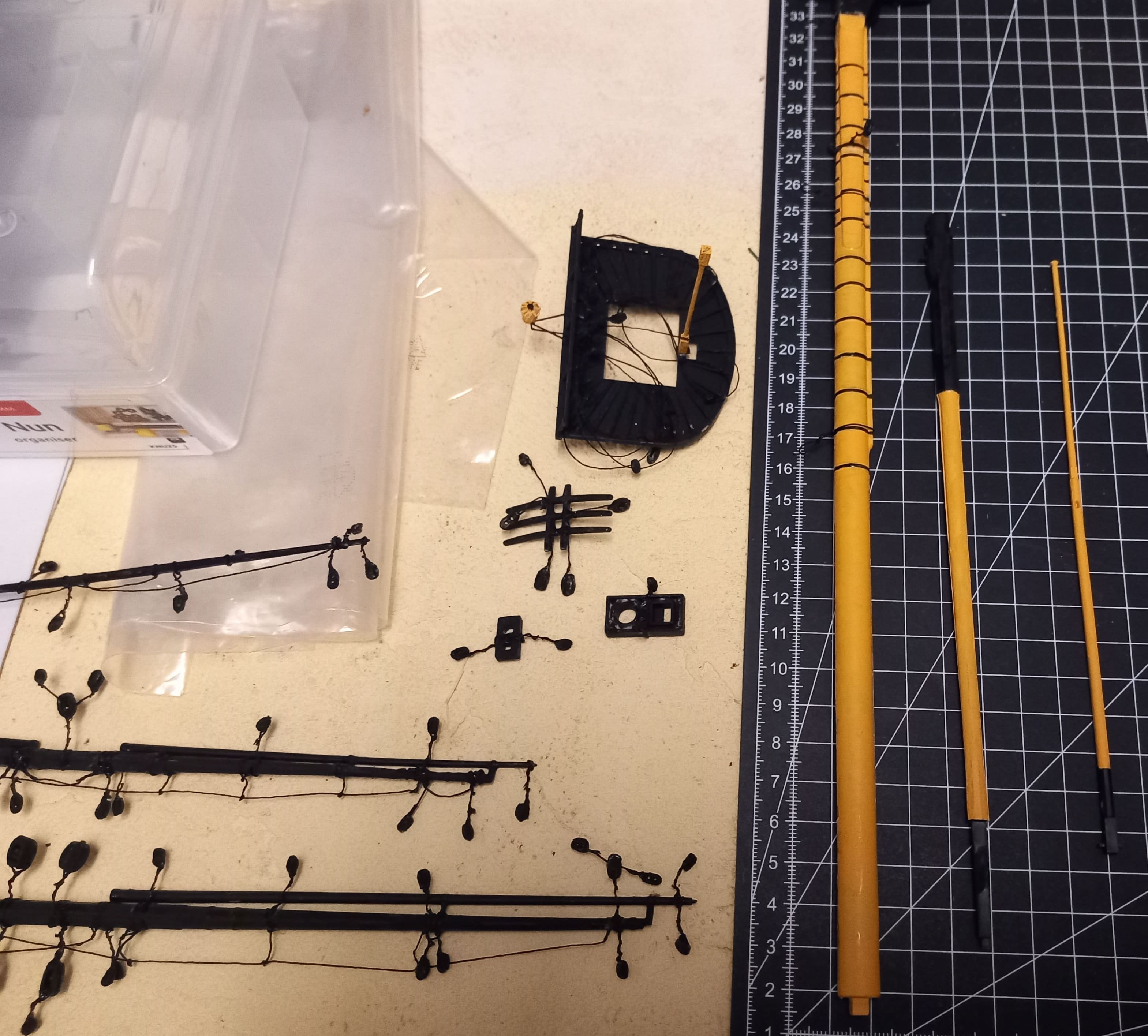 Die Vorbereitungen am Hauptmast sind abgeschlossen. Blöcke, Rollen, Fußpferde und die Lampe sind angebracht. Auch die Enterspieße habe ich diesmal vor dem Aufstellen angebracht.