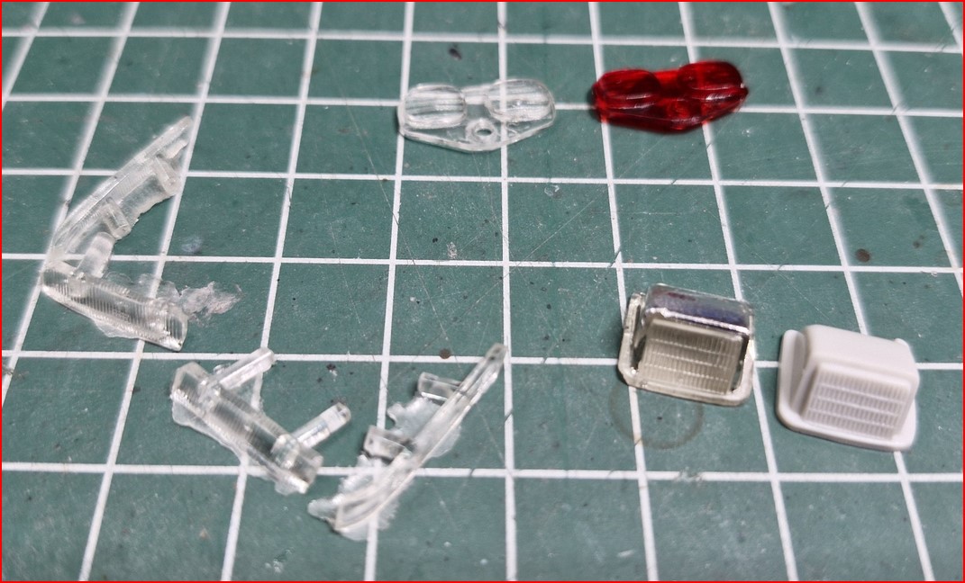 Bei der Silbernen: nur die Bohrungen verschlossen und bemalt. Erster Versuch in 06/1999. Bei der Grünen habe ich dann den Hintergrund mit BMF belegt. Die Klarteile am Rand mit schwarz bemalt. Die stellte ich 10/2021 fertig. Bei der Blauen anstatt BMF habe ich Blech von einem Teelicht zugeschnitten und hinterlegt. Zusätzlich hatte ich die Hauptscheinwerfer nachgegossen und eine Rückleuchte. Das war dieses Jahr im Juni. Die Teile sahen dann so aus: 2021: Bei dem Umbau des Chevy zum GMC ist der Grill komplett selbst gemacht. Hier sieht man auch, wie klar das Material ist. Die Rückleuchten sind auch selbst gemacht (recht wie aus dem Bausatz)
