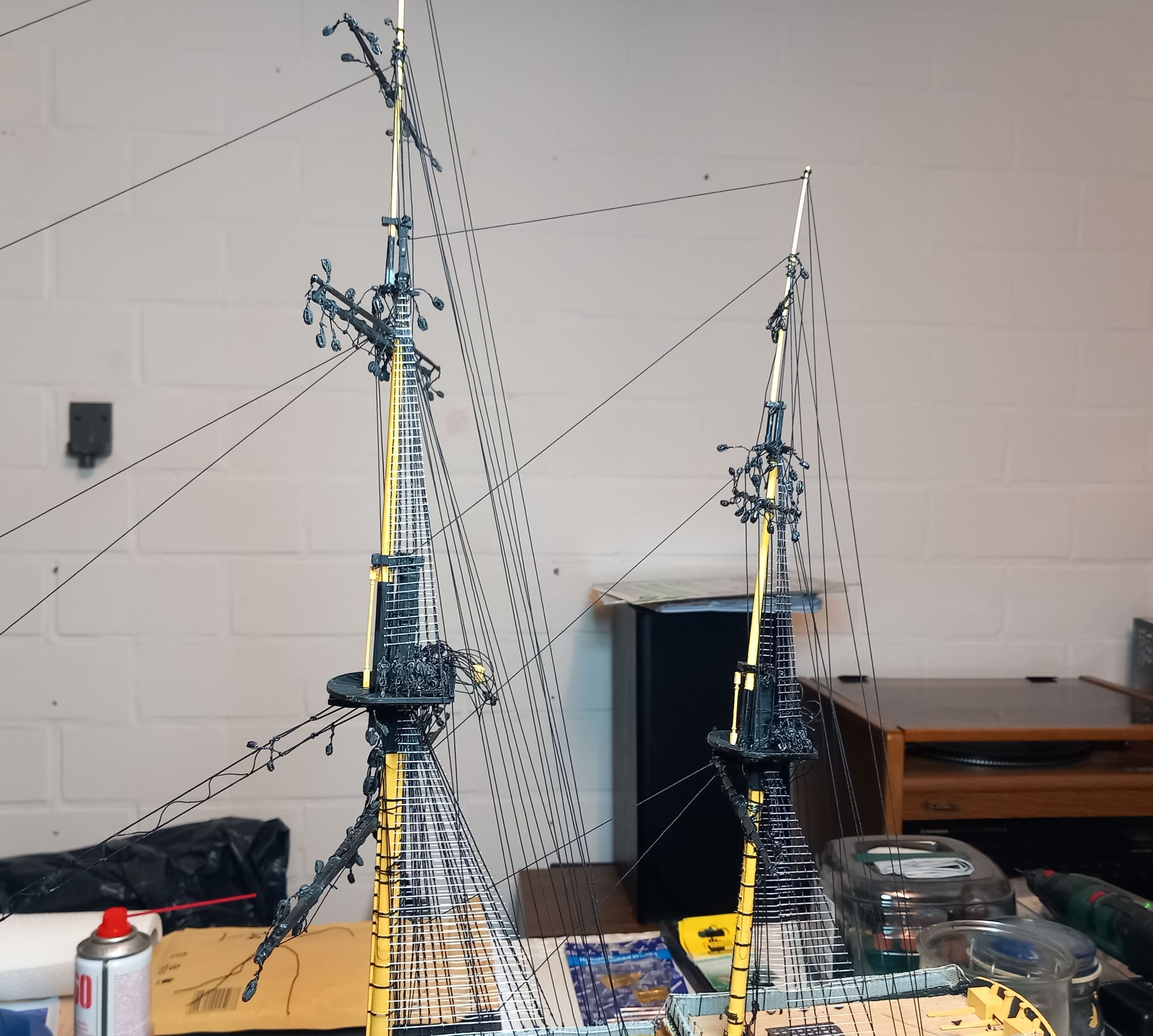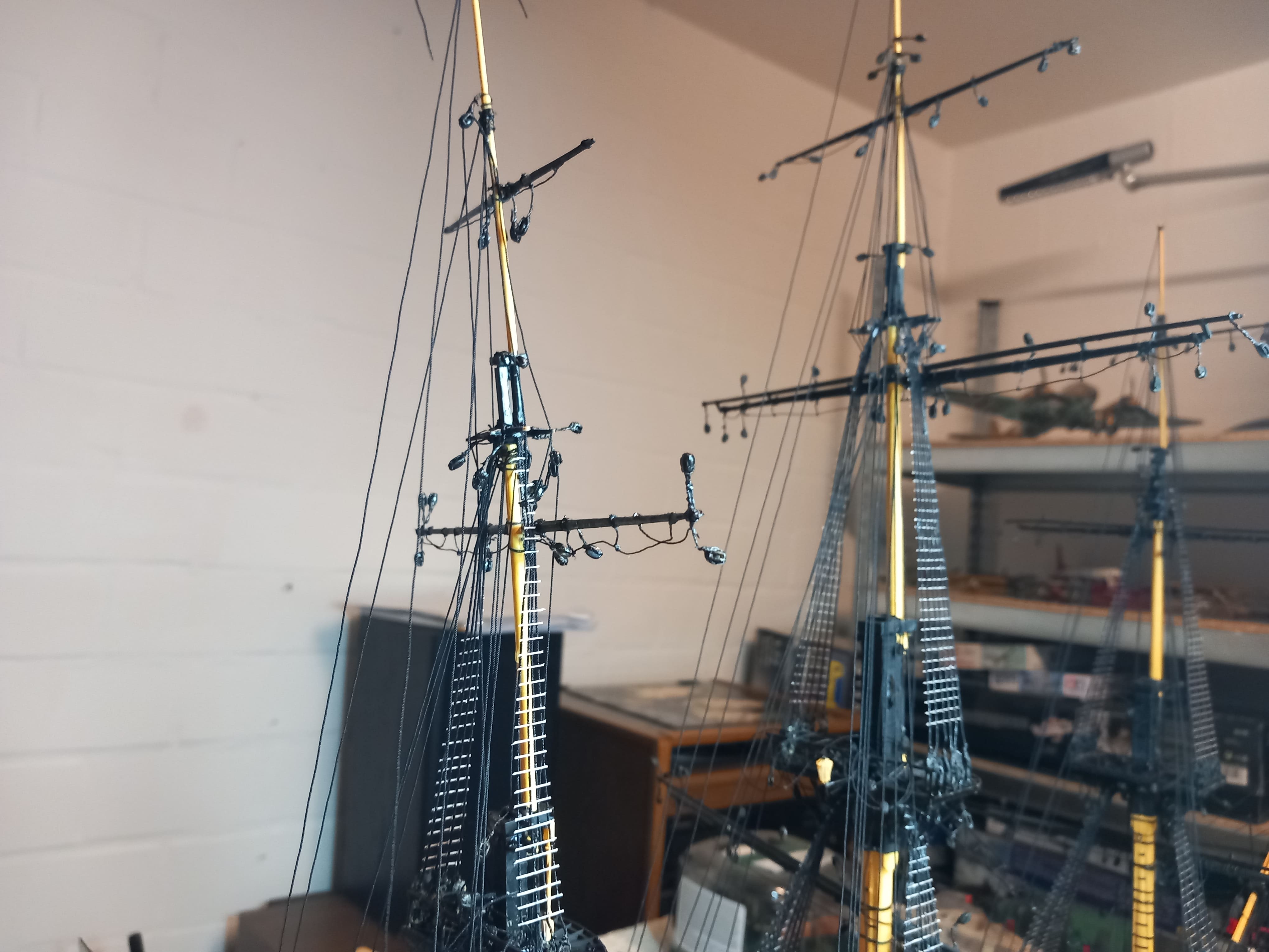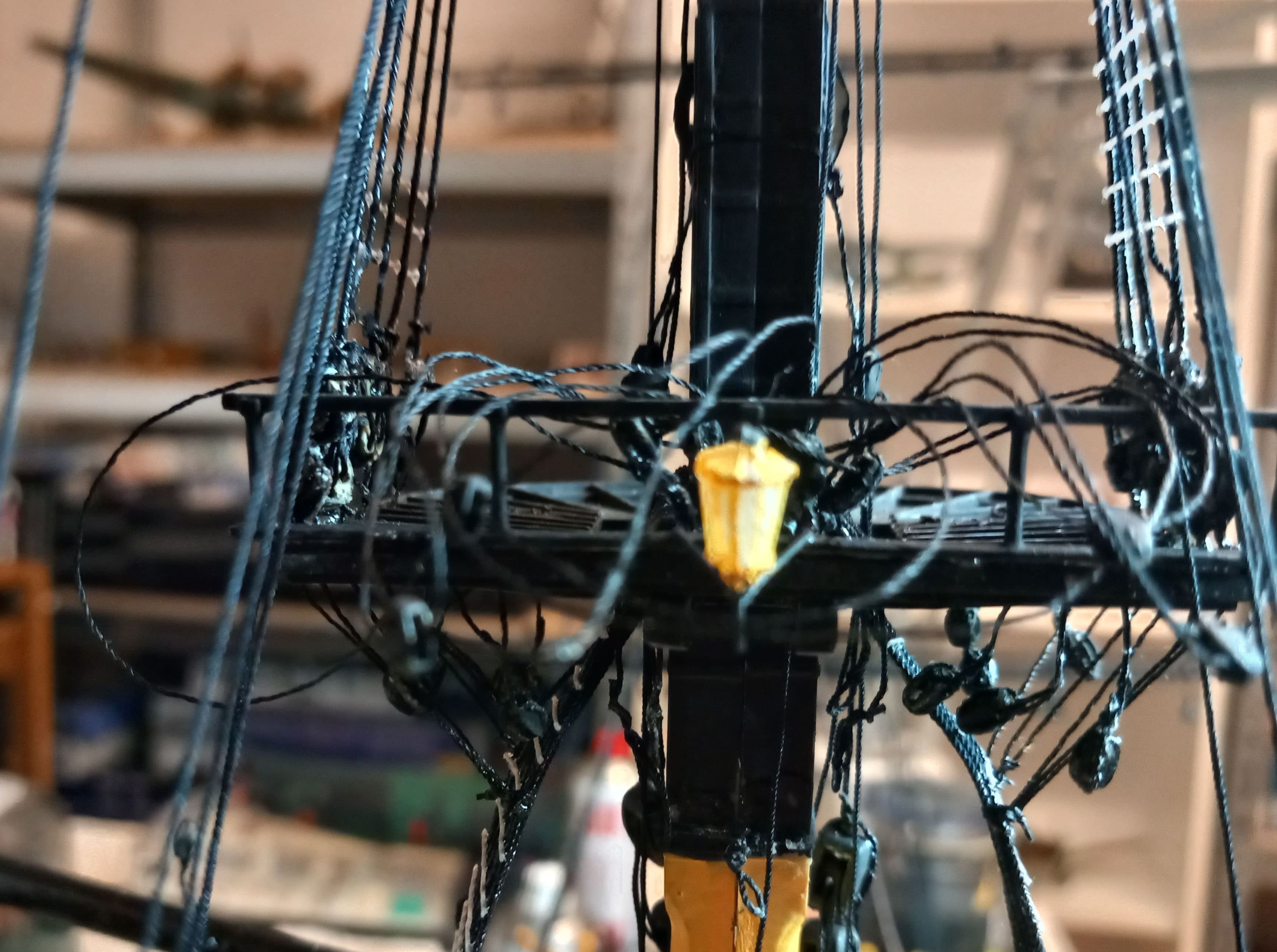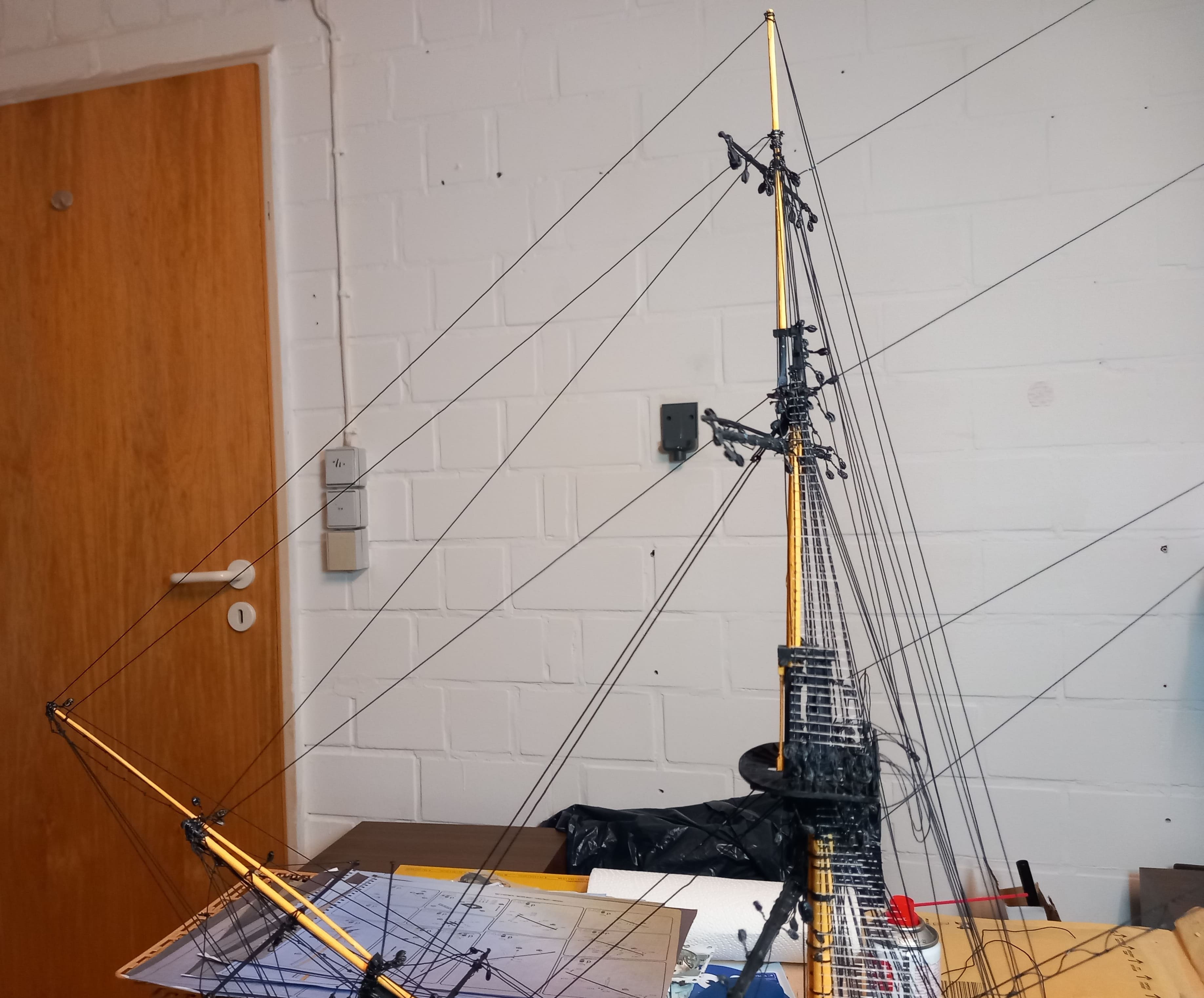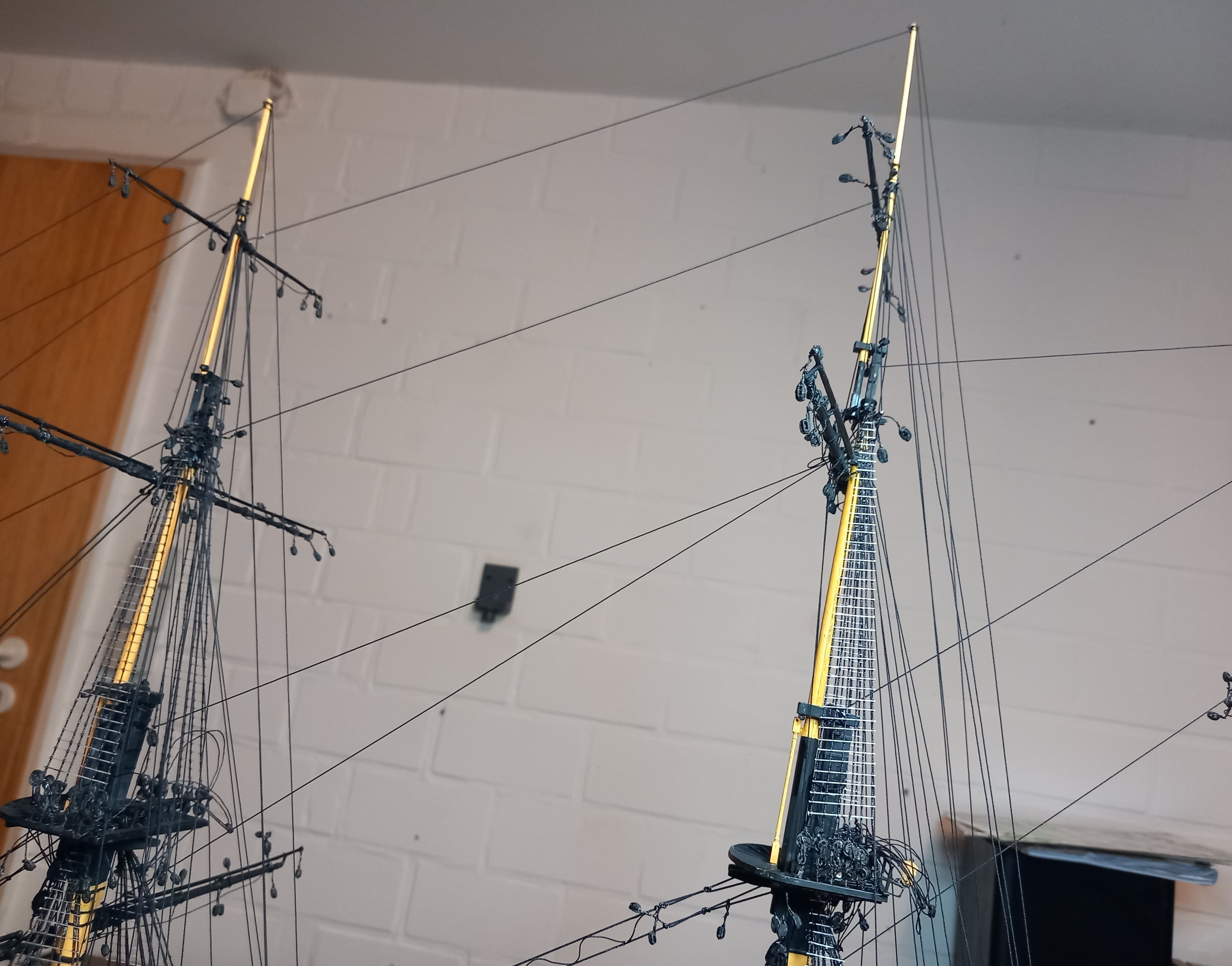 Das stehende Gut ist angebracht. Und es hat wirklich gut geklappt. Bugspriet ist gerade, auch nicht zur Seite weggedreht. Fockmast, Hauptmast und Besanmast ebenfalls gerade. Bin damit gut zufrieden