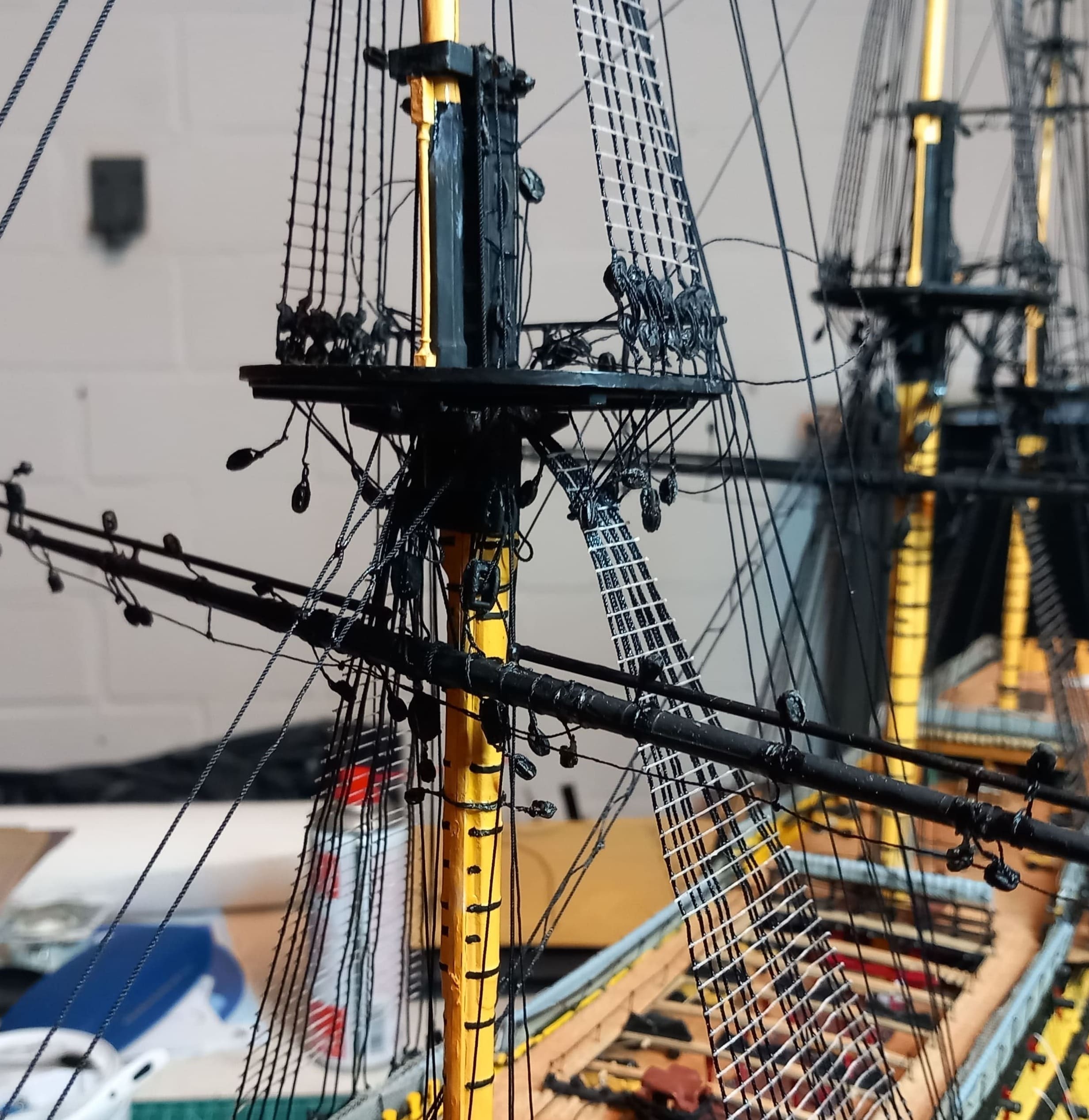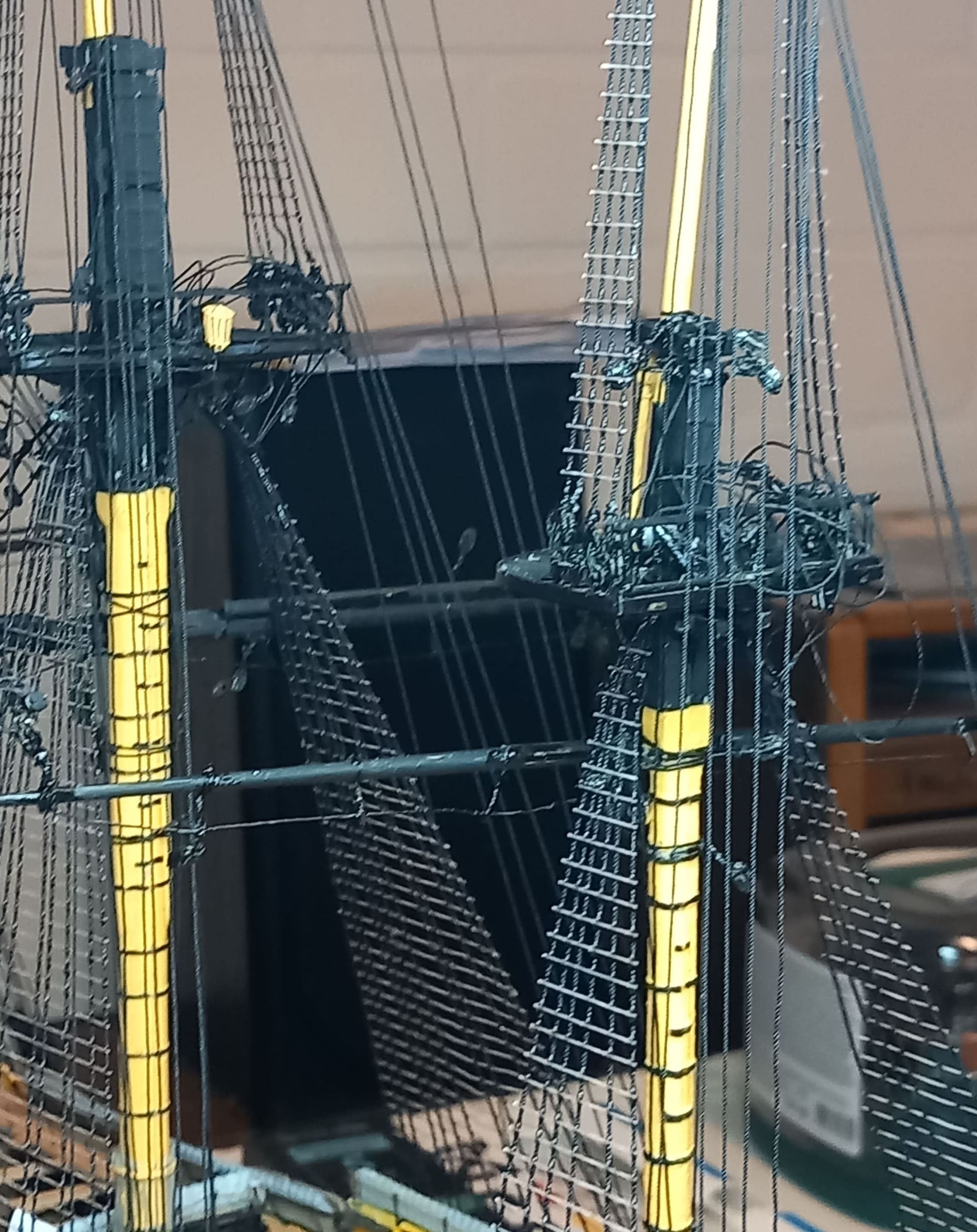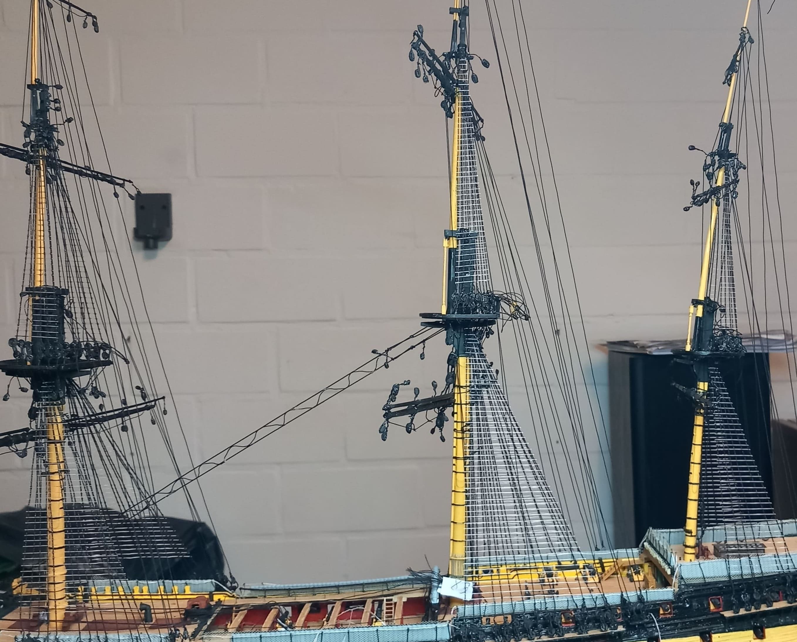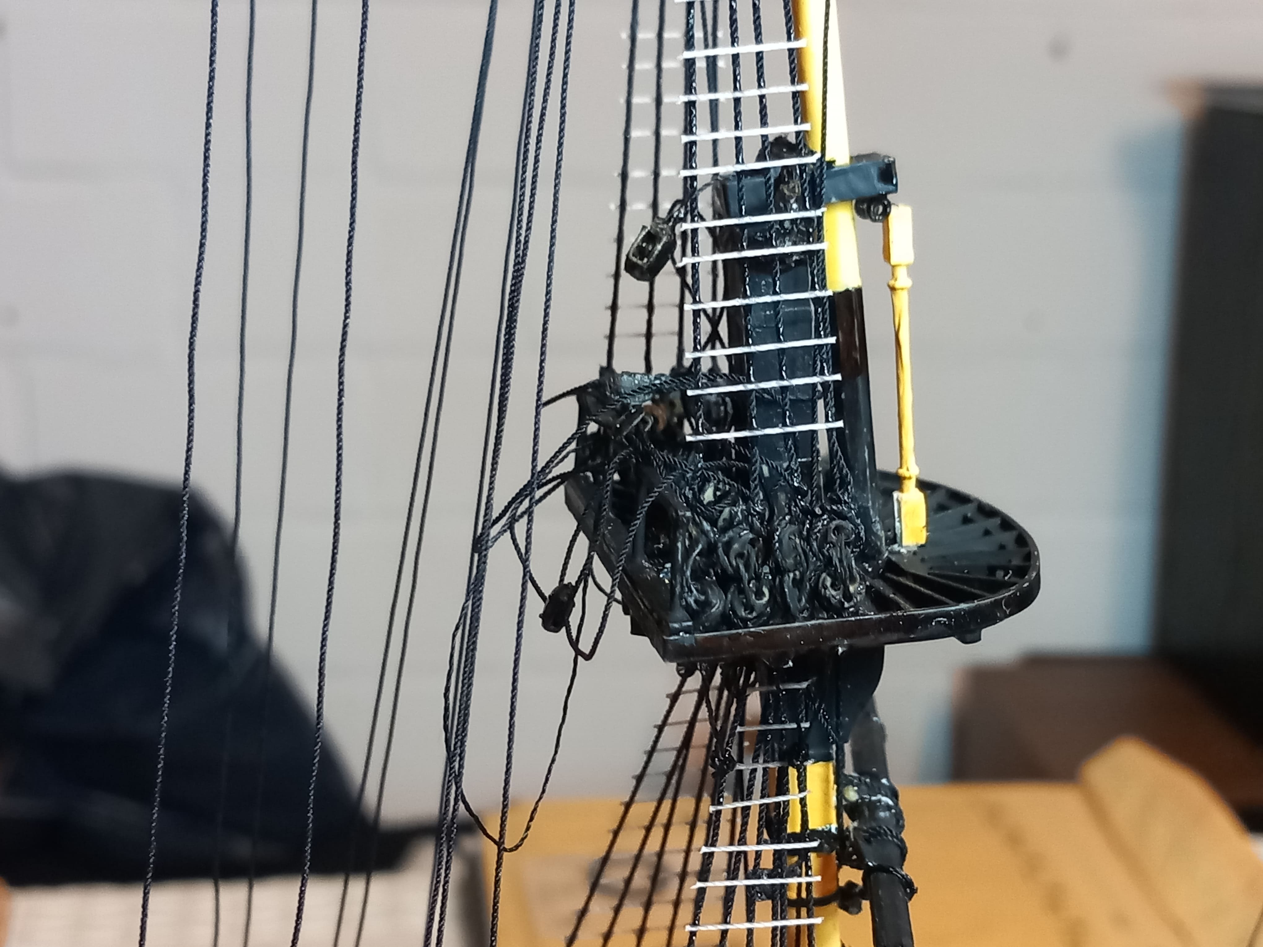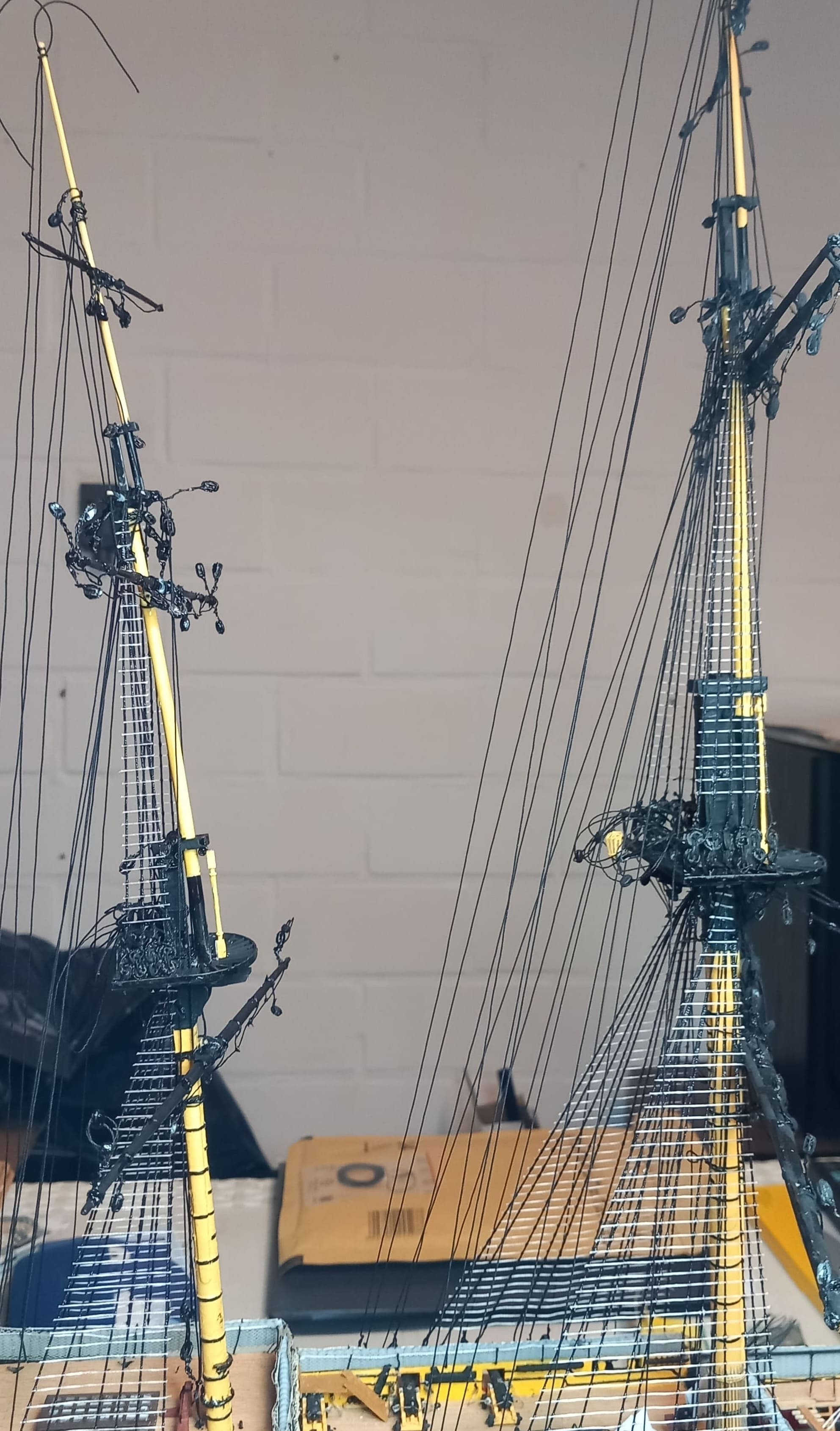 Das stehende Gut ist angebracht. Und es hat wirklich gut geklappt. Bugspriet ist gerade, auch nicht zur Seite weggedreht. Fockmast, Hauptmast und Besanmast ebenfalls gerade. Bin damit gut zufrieden