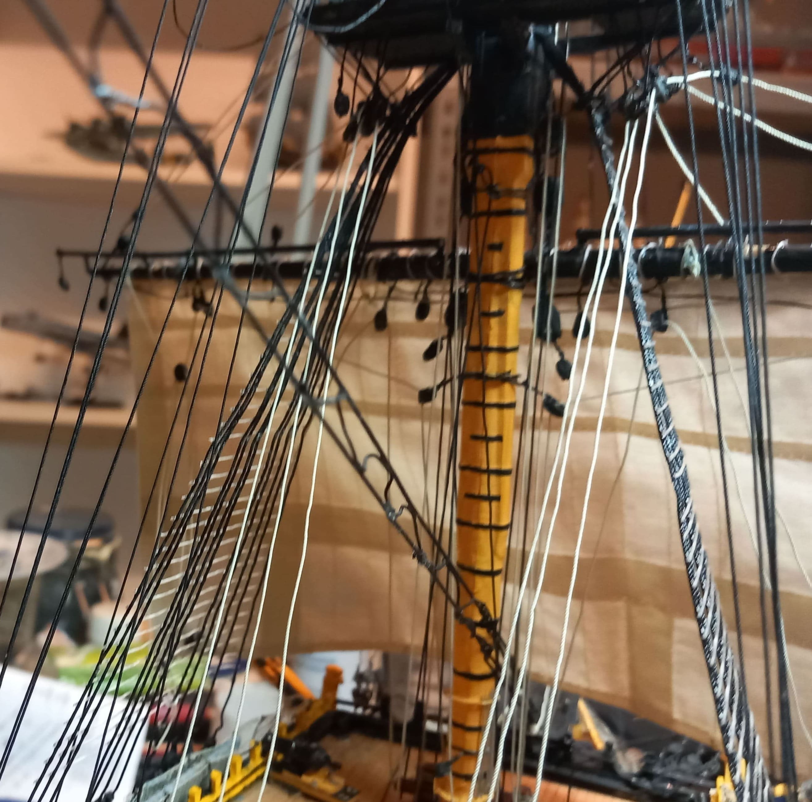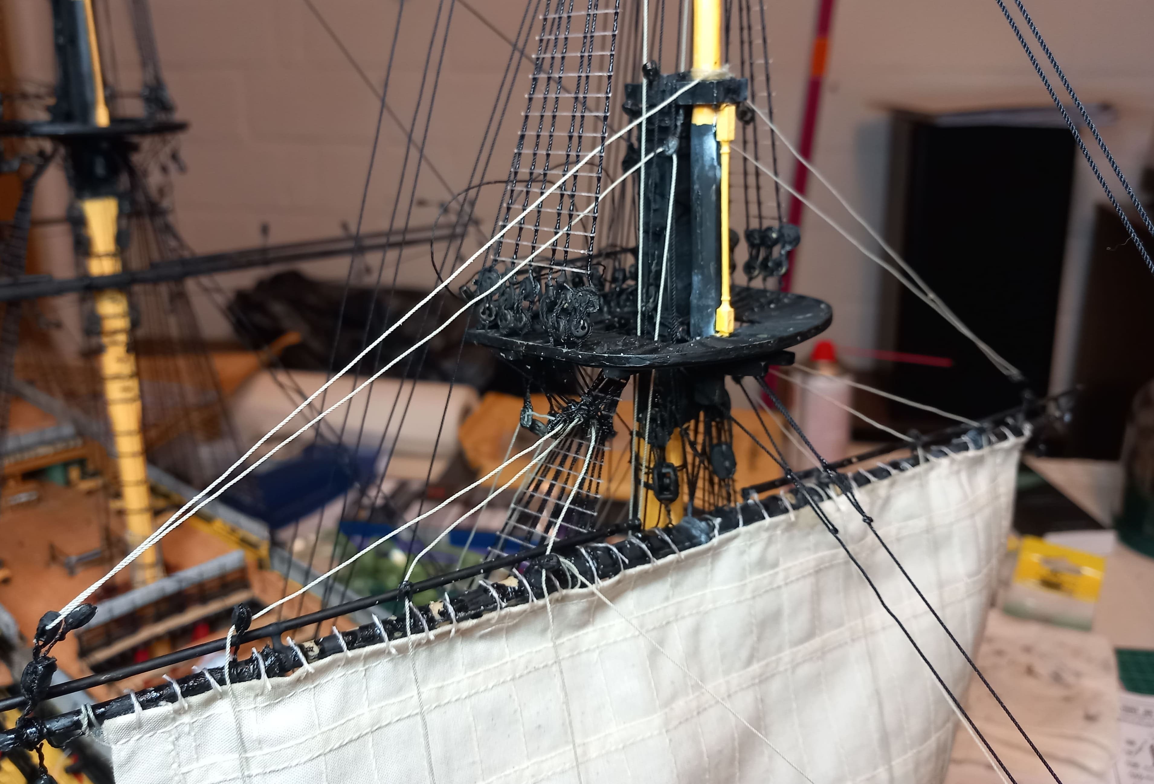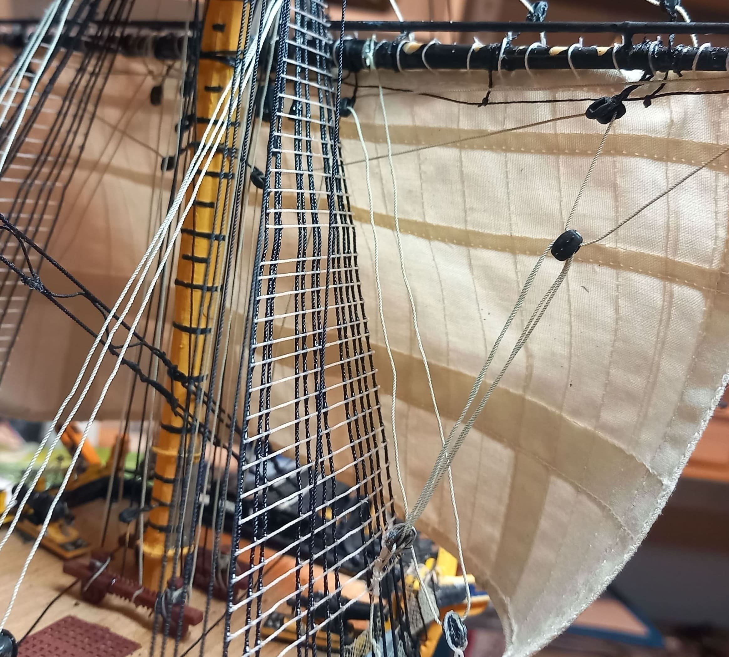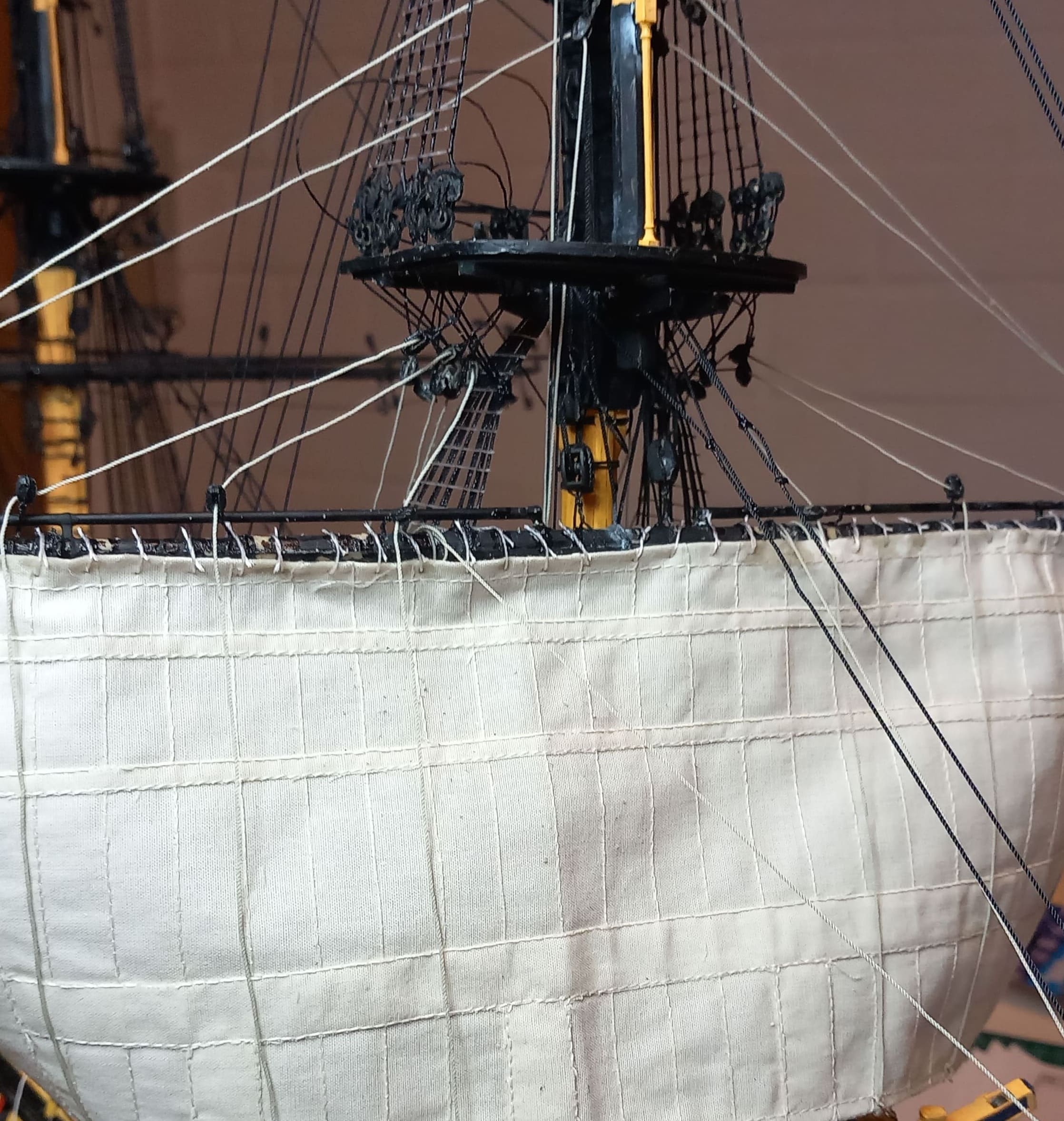 Ich habe mich für Stoffsegel entschieden und diese extra bestellt. Das Focksegel habe ich bereits angebracht und die Taue verlegt. Ich fange am Fockmast an, da die meisten Arbeiten an den Segeln hinter diesen erfolgen. Außerdem können dann bereits alle Taue am Bugspriet fertig gestellt werden. Gruß Ingo