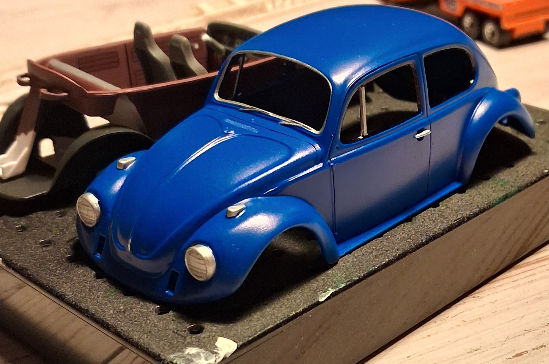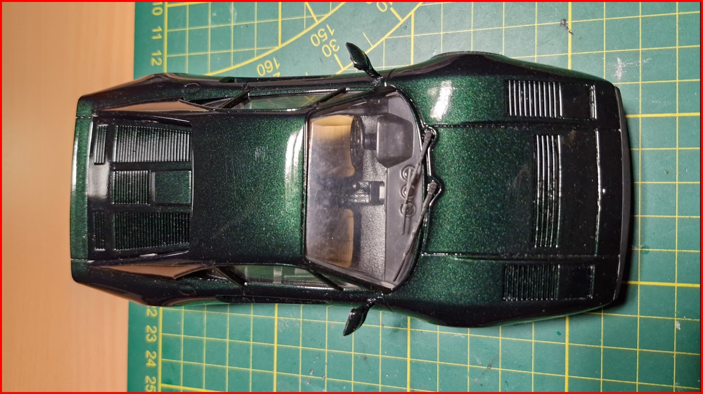 Dann wollte er selbst mal einen "besseren" Bausatz bauen. Also keinen snapkit. Er suchte sich im Regal a) den Lamborghini Countach 5000 von Italeri und b) den wunderbaren 1966 Käfer von Tamiya. Den Lamborghini (ich kann seine Wahl absolut nachvollziehen) hat er begonnen aber doch schnell gemerkt, dass die Hürde noch zu hoch ist. Also liegt der fertig lackiert und bemalt, wartend auf die Komplettierung wieder im Karton. Ich hatte Lackabplatzer beim Endspurt und weiß noch nicht, wie es mit dem weiter geht. Möchte den erst mal nicht sehen. Nächstes Jahr dann.