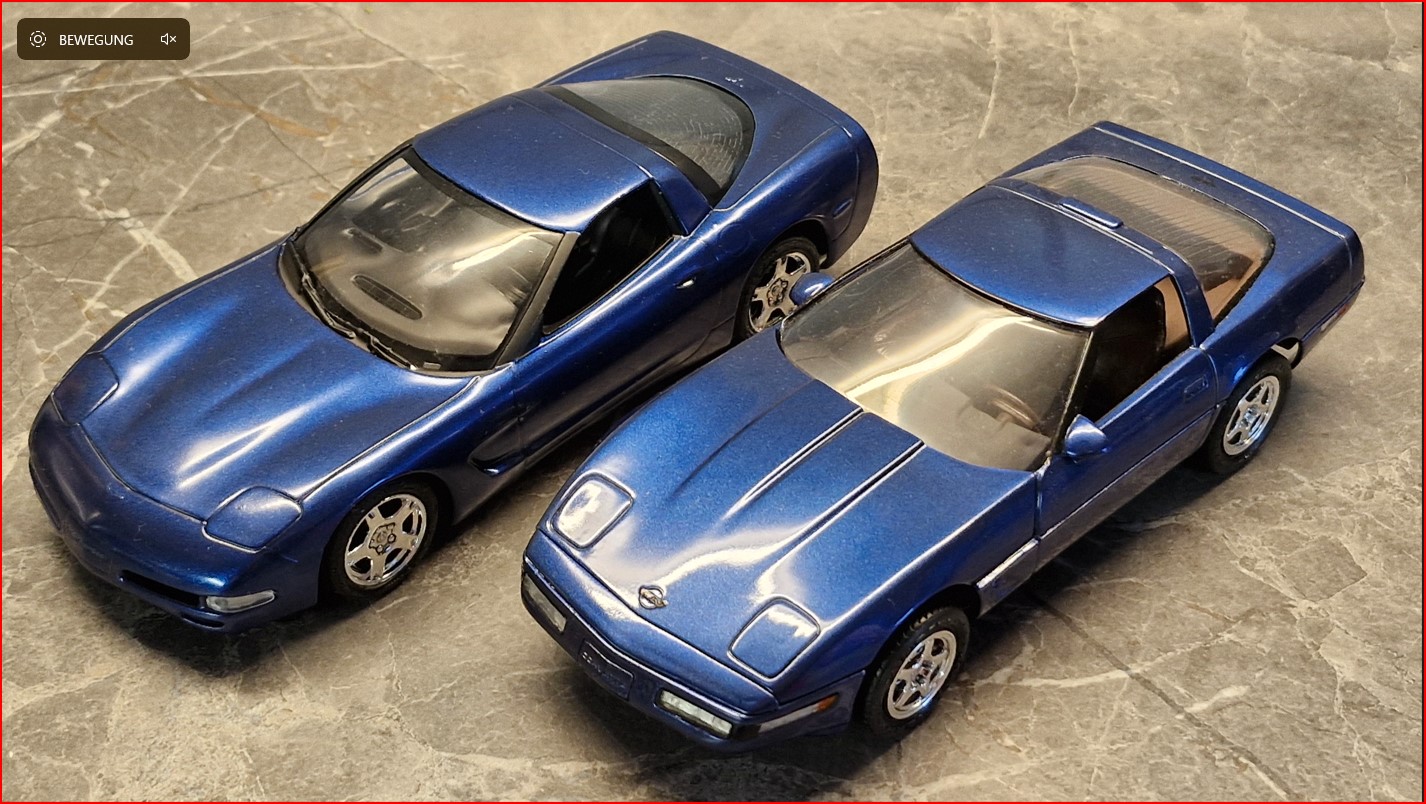 Für meinen Enkel lackierte ich einen Snapkit von Revell: eine Corvette C5 (links im Bild). Die Farbe soll "Admiral Blue" darstellen. In seinen Weihnachstferien gebaut, nach Silvester stand er dann fertig auf den Rädern. Die habe ich farblich an meine C4 ZR1 (rechts angepasst)