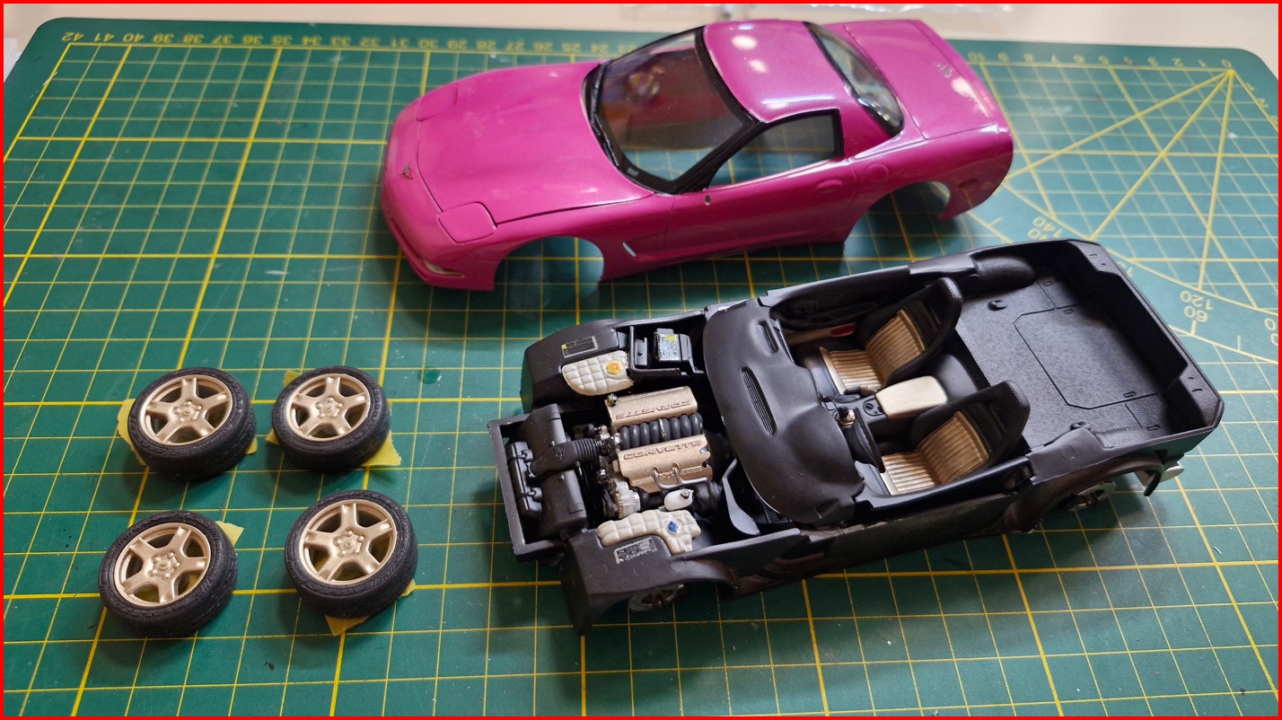 Die Basis lackierte ich in pink und hustete in mehreren Durchgängen einen metallicfarbenen Nagellack drüber. Das Metallic ist superfein. Ohne Klarlack wirkte die Corvette wie eine Perle. Aber Klarlack muss immer druf. Innen mit goldfarbeben Akzenten und die Felgen wie gewünscht ebenso in gold. Letzten Monat fertig, nächste Woche wird sie übergeben.