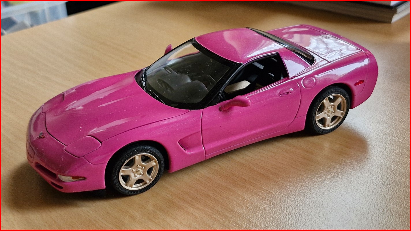 Meine Enkelin hat einen Geburtstagswunsch: pinkmetallicfarbene Corvette mit goldenen Felgen und innen auch Gold. Wunschkennzeichen obendrauf. Herausforderung angenommen. Auch sie (12) ging durch mein Regal und ihre Wahl traf zuerst auf eine Corvette C6 Z06 - man. Den konnte ich nicht bauen, weil der vollwertige Bausatz superrar ist und ich ihr den snapkit nicht antun wollte (Räder sehen völlig deplatziert im Radkasten aus). Also beriet ich sie, zeigte ein paar fertige Modelle von mir und sie entschied sich dann für die C5 Harttopcoupe von Revell. Mit dem kann ich locker leben - ein sexy Heck hat die 'vette :D .