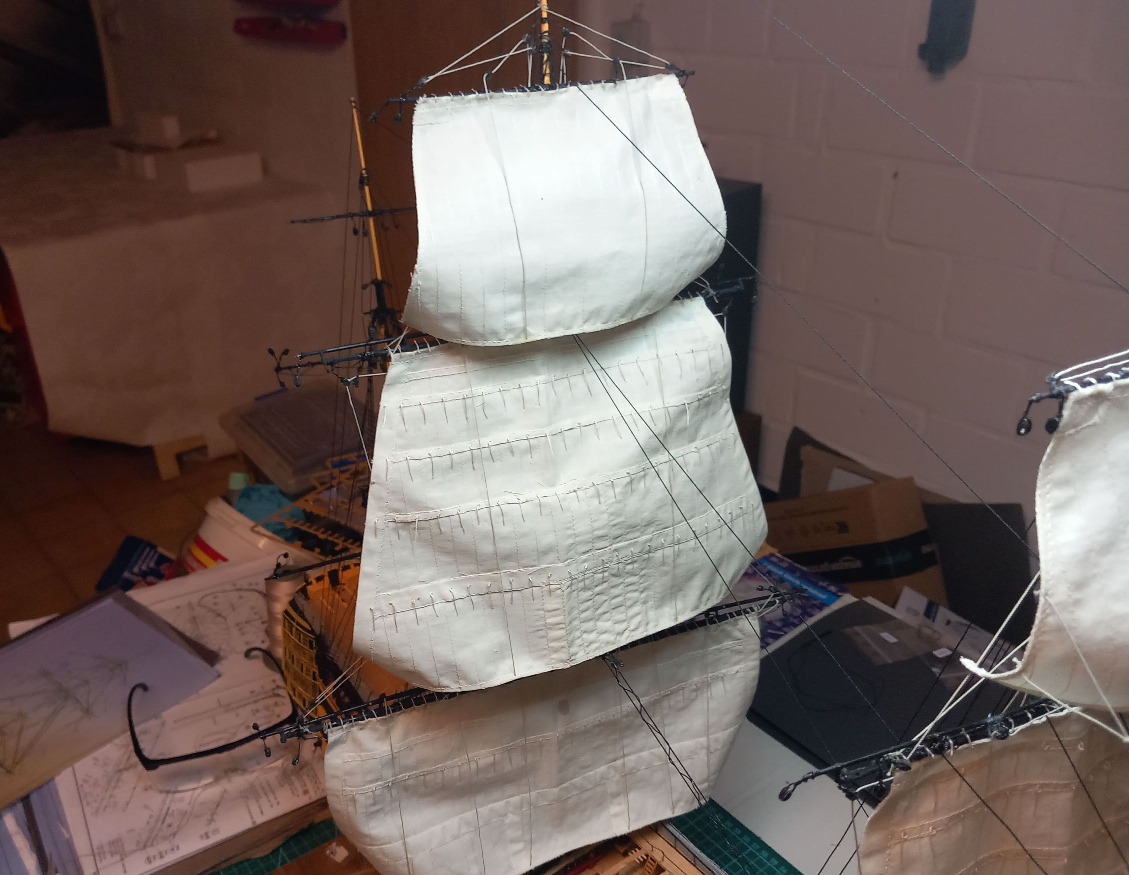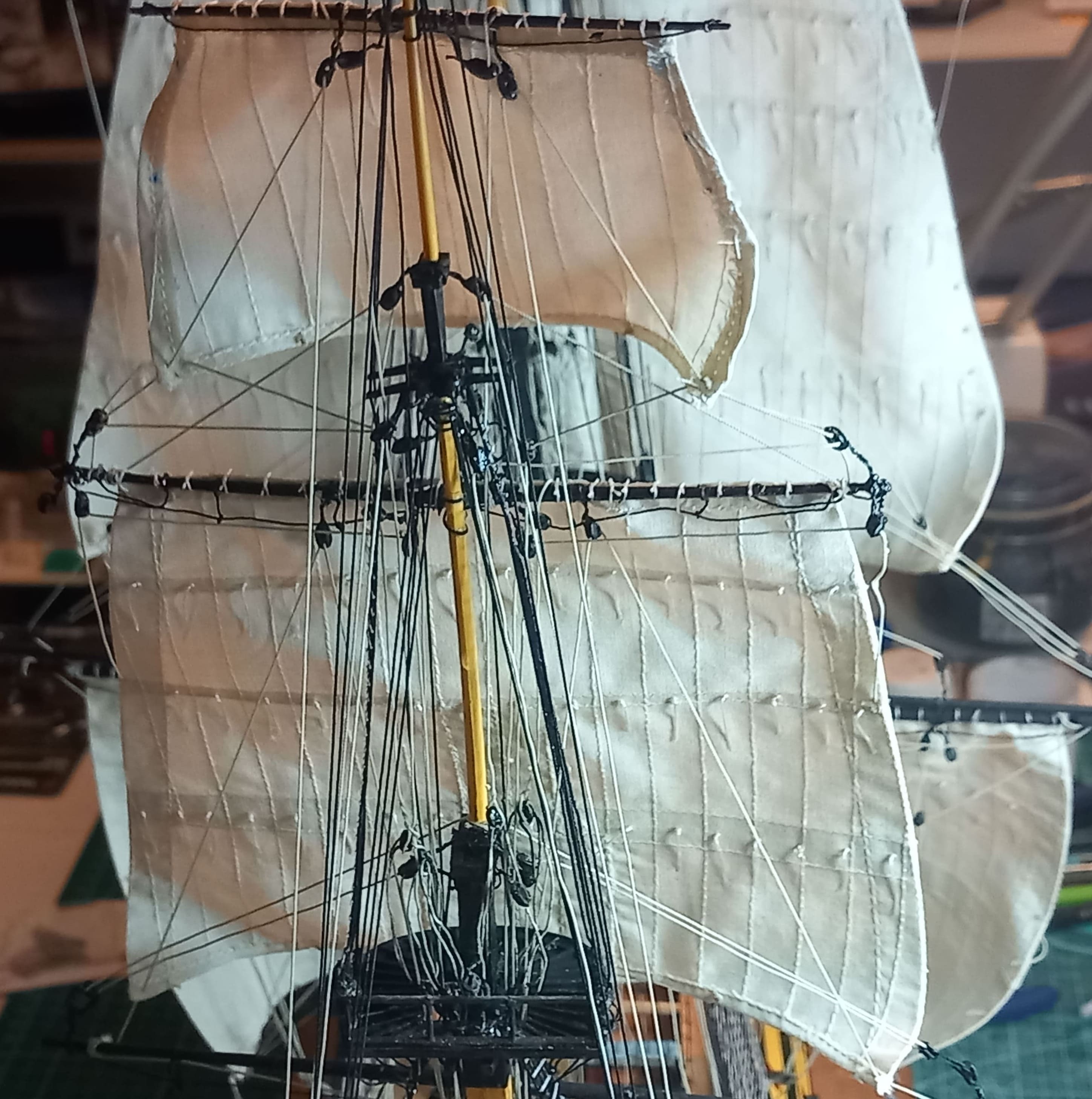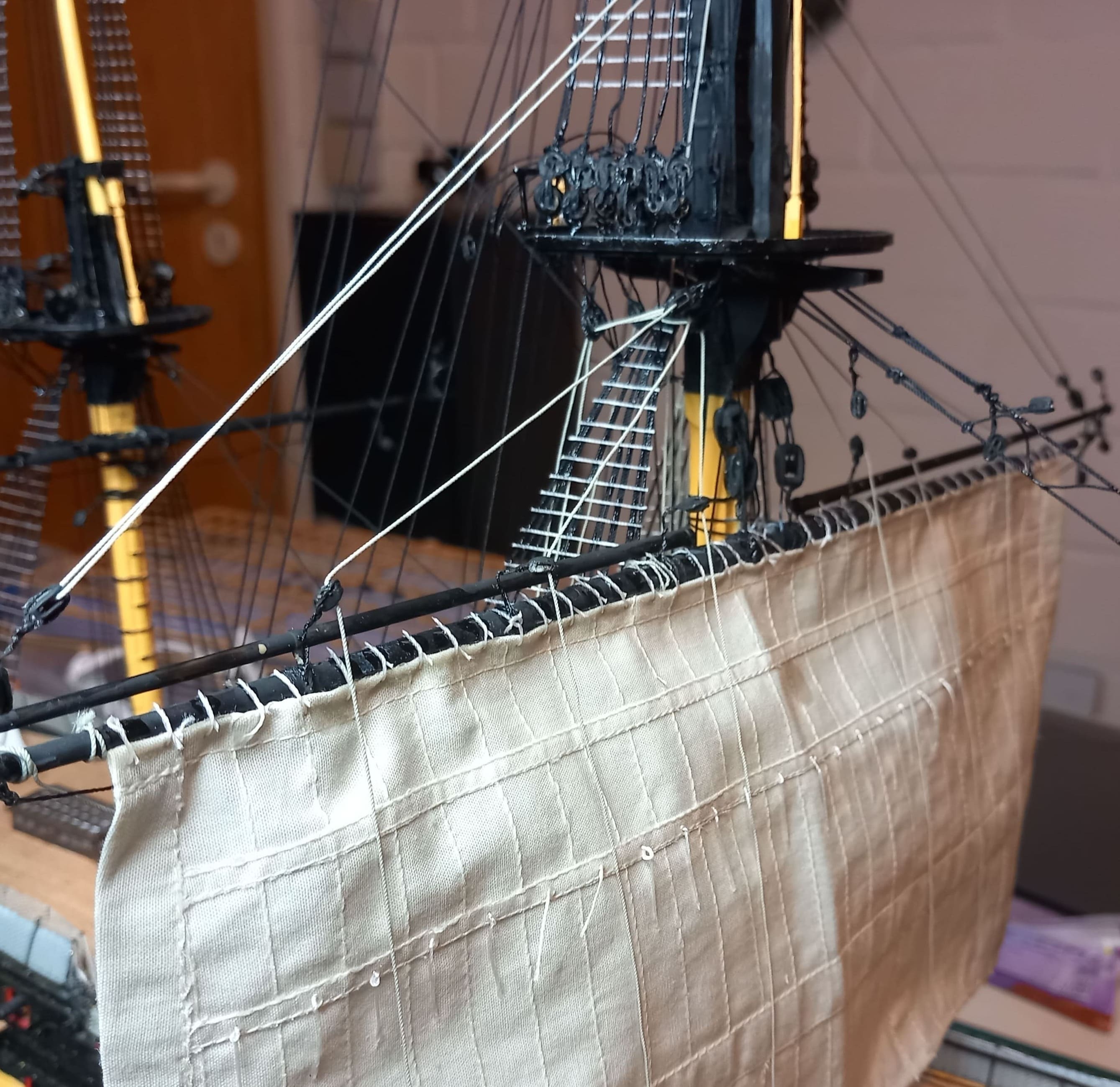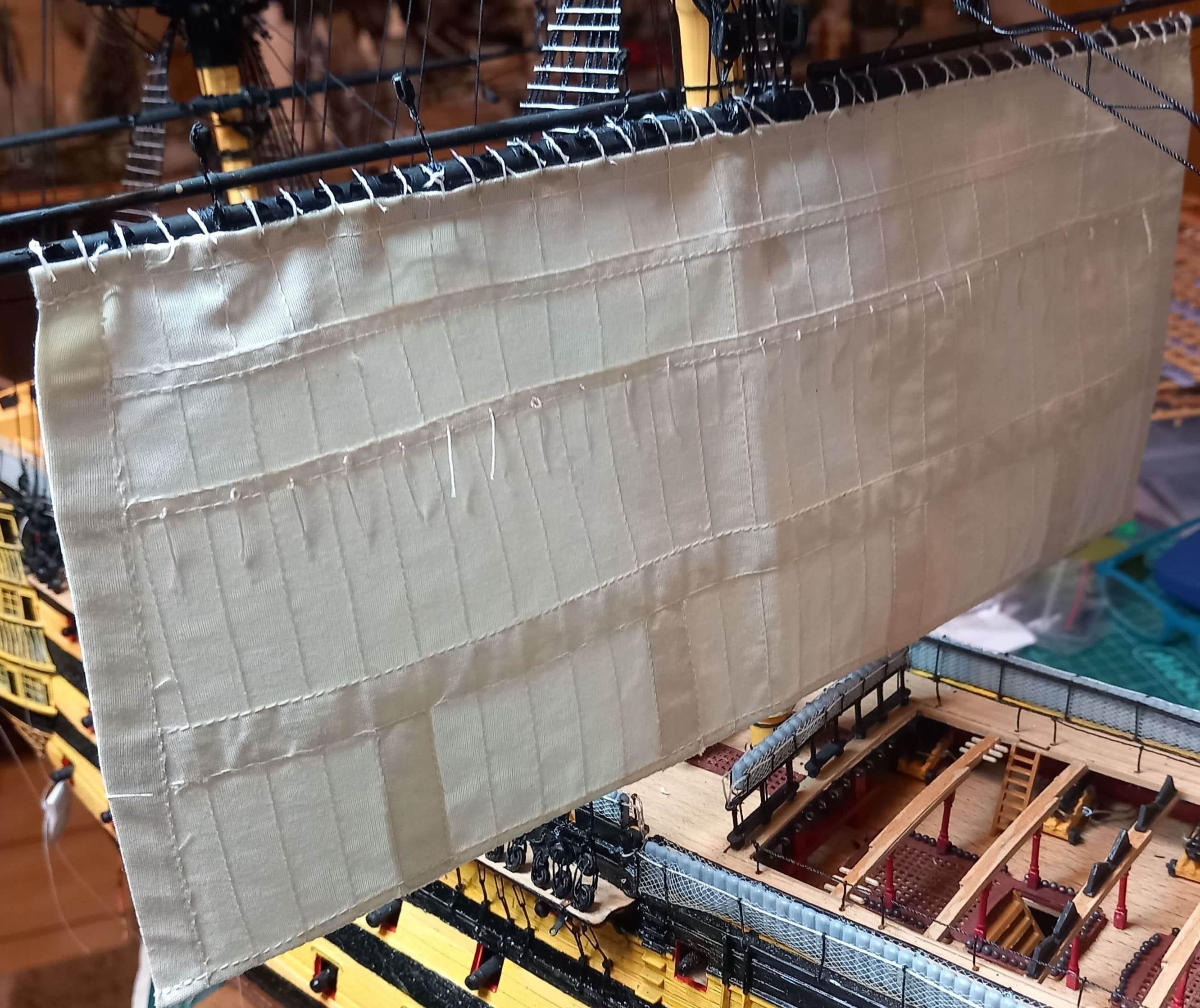 Es geht weiter. Großmarssegel und Großbramsegel sind gesetzt. Die Taue vor und hinter den Segeln sind gezogen. Das Großbramsegel (das obere) ist ein wenig zu groß geraten. Es geht etwas zu weit herunter aber ich lasse das gerade noch so durchgehen. Anfangs dachte ich das ich mich beim Abstand der Rahen zueinander vertan haben könnte. Aber das Nachmessen ergab, das der Abstand stimmt. Also kann es nur am Segel liegen. Das Kreuzbramsegel am Besan ist allerdings ca. 2 cm zu breit. Meine Schwester kann das zum Glück einkürzen und umnähen. Ansonsten gefallen mir die Segel sehr gut.