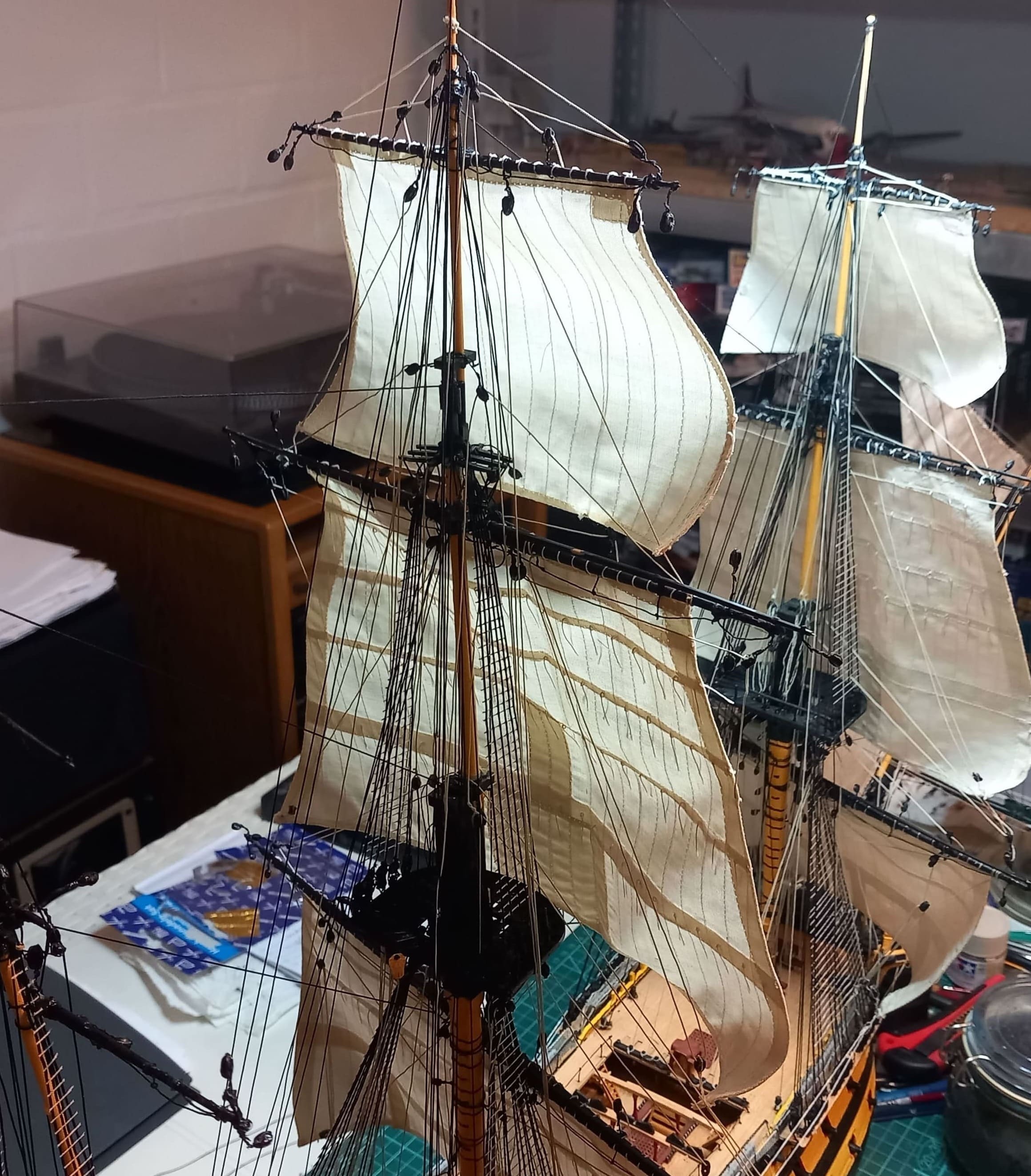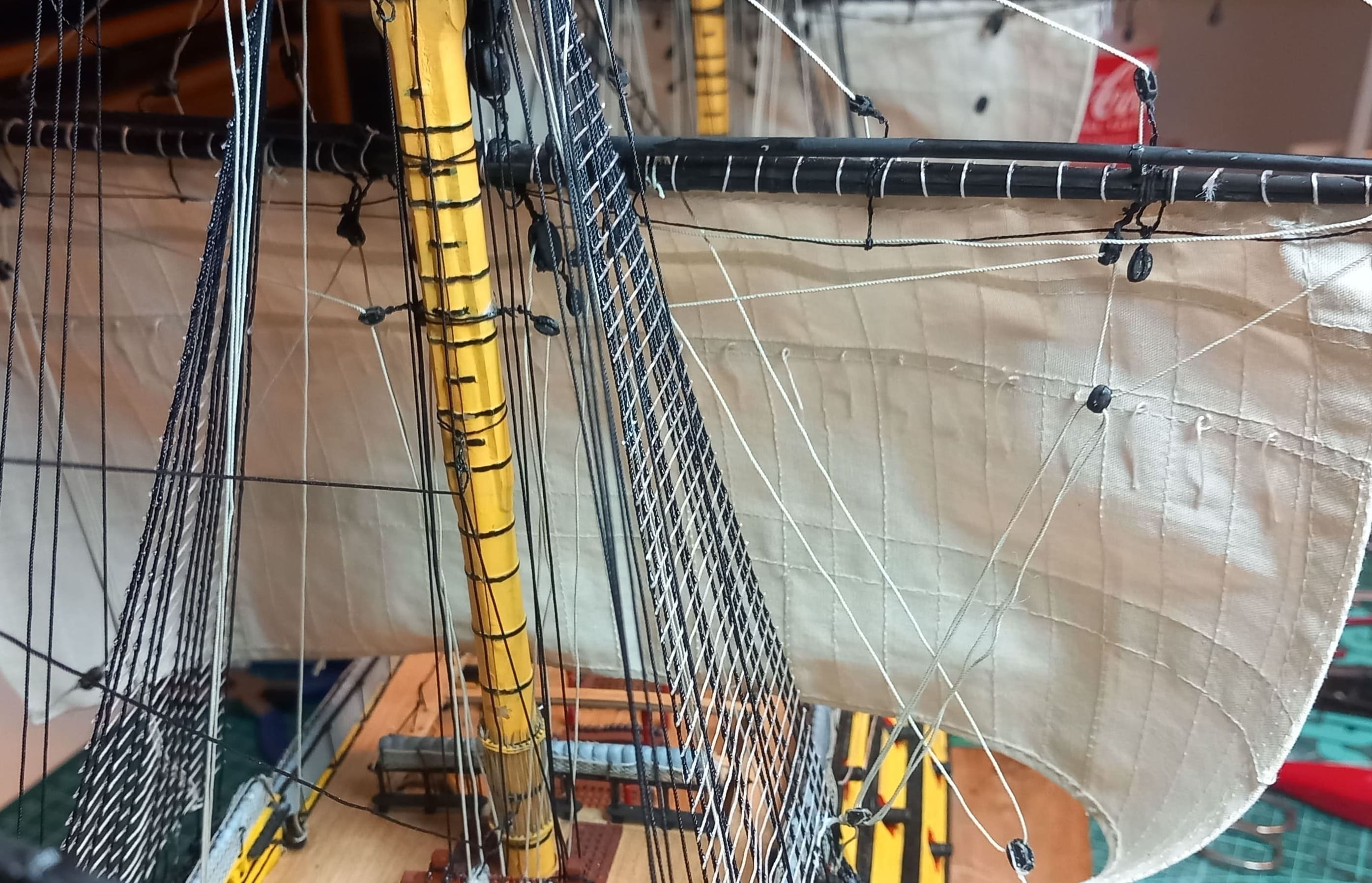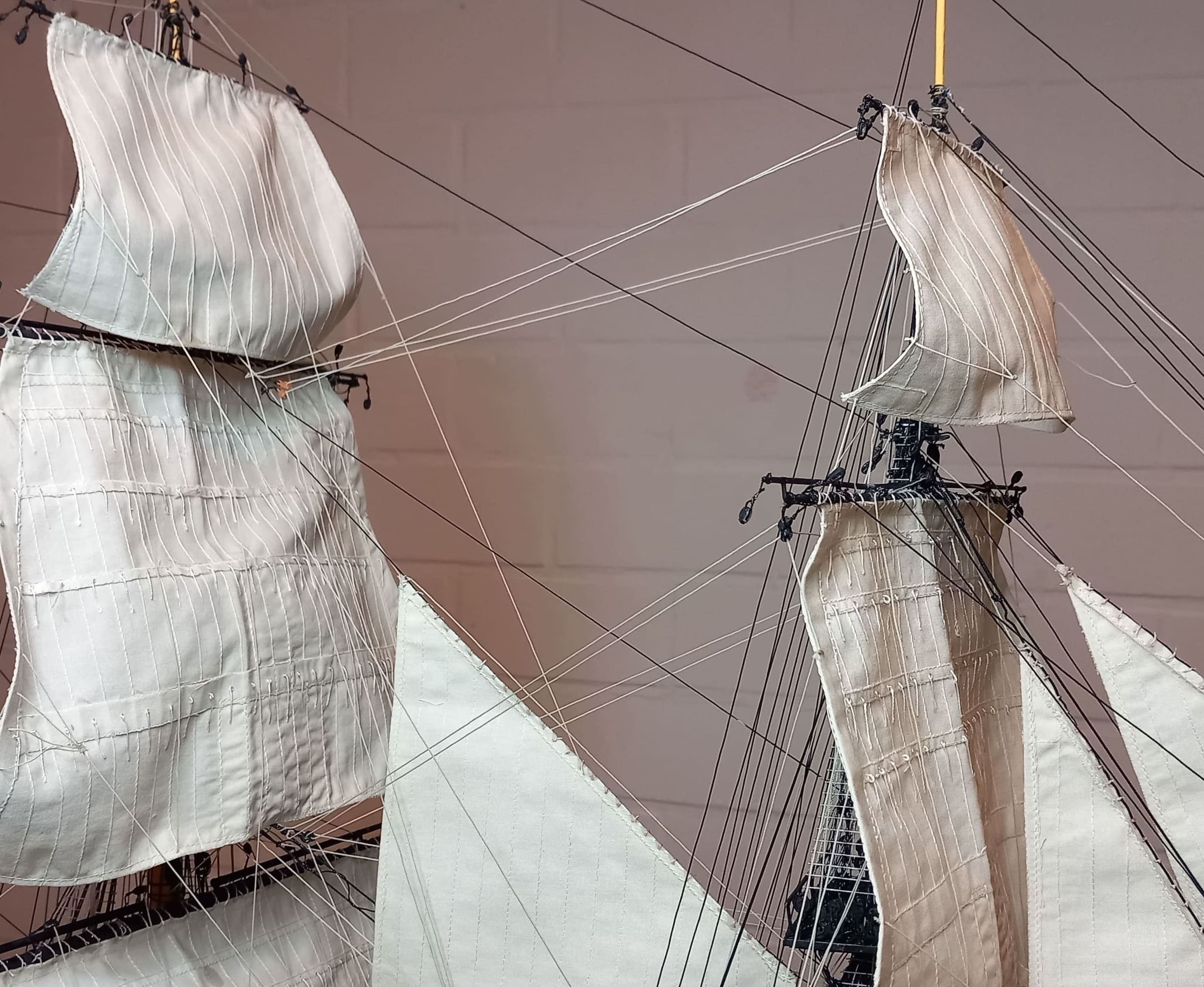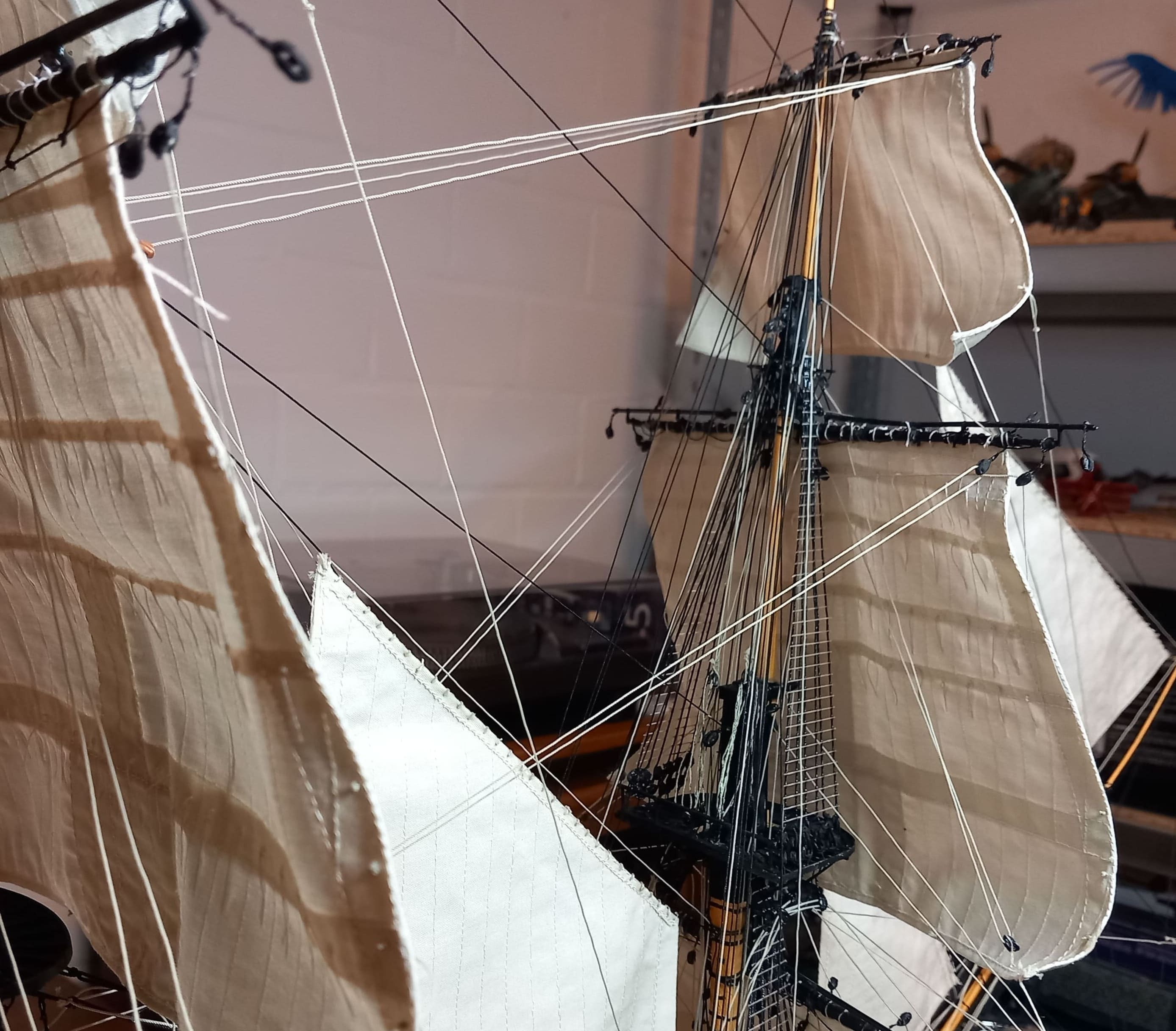 Es geht weiter. Großmarssegel und Großbramsegel sind gesetzt. Die Taue vor und hinter den Segeln sind gezogen. Das Großbramsegel (das obere) ist ein wenig zu groß geraten. Es geht etwas zu weit herunter aber ich lasse das gerade noch so durchgehen. Anfangs dachte ich das ich mich beim Abstand der Rahen zueinander vertan haben könnte. Aber das Nachmessen ergab, das der Abstand stimmt. Also kann es nur am Segel liegen. Das Kreuzbramsegel am Besan ist allerdings ca. 2 cm zu breit. Meine Schwester kann das zum Glück einkürzen und umnähen. Ansonsten gefallen mir die Segel sehr gut.