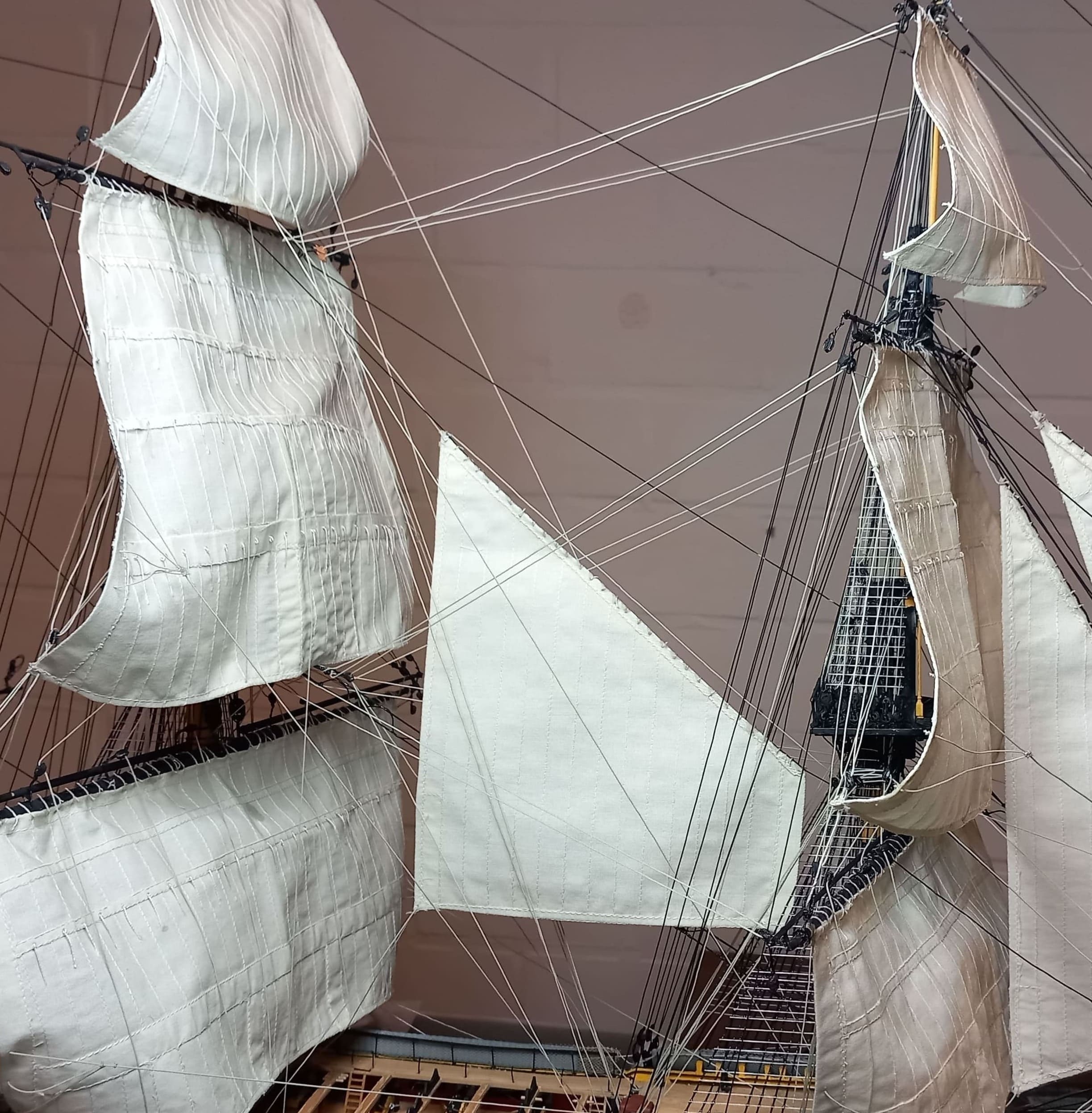 Das Stagsegel hängt und die Taue, die die Rahen ziehen, sind angebracht. Damit ist der vordere Bereich bis zum Hauptmast komplett vertakelt. Jetzt geht es am Besan weiter. Da warten 2 Segel darauf gesetzt zu werden. Langsam gehen mir die Blöcke aus aber ich habe noch welche rumliegen. Gruß Ingo
