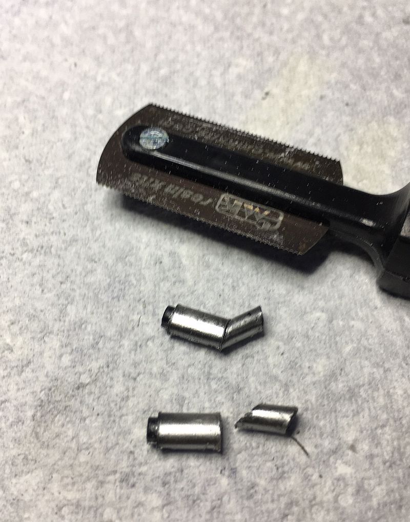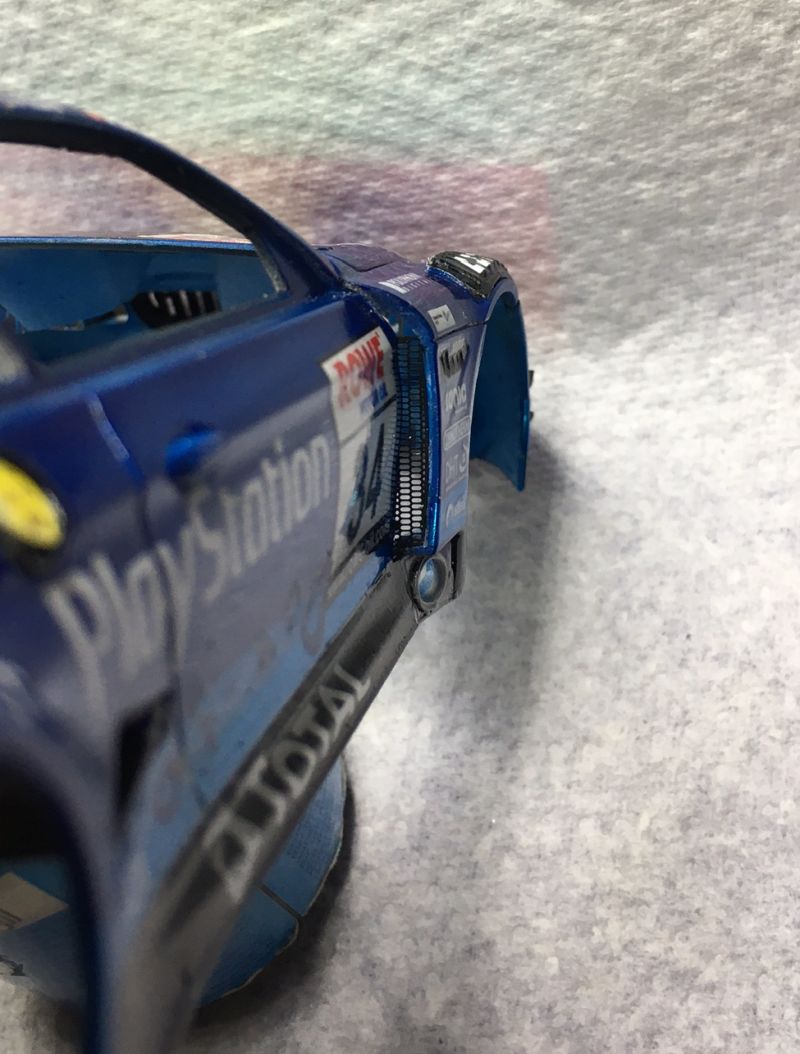 Dann wollten sich die schräg überstehenden Auspuffhutzen nicht an der vorgesehenen Stelle durch die Karosse schieben lassen. Also habe ich sie wieder ausgelöst und die Endrohre abgesägt.