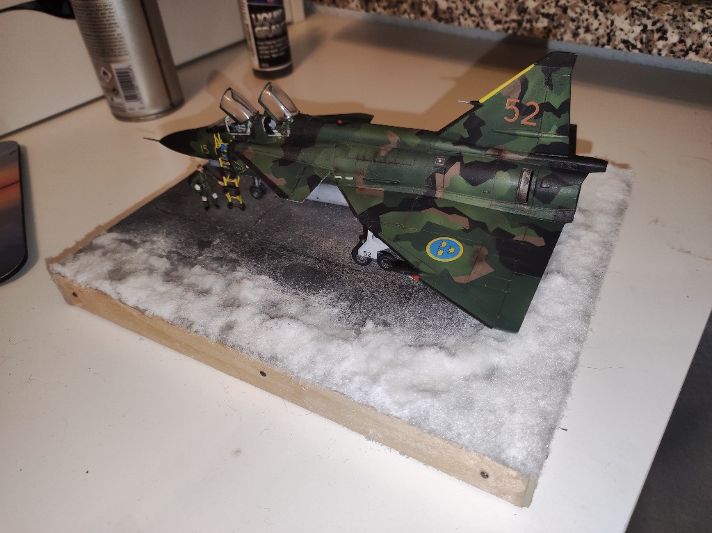 Rein von der Sache her ist die Saab fertig. Heute kam noch Schnee dazu. Eine schöne kleine Schneelandschaft wo eine Fläche geräumt würde, um die Saab für den Flug vorzubereiten