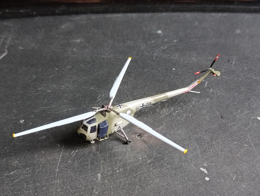 Ein Aktuer fehlt allerdings noch und der war nun ebenfalls an der Reihe. Der kleine Bordhubschrauber vom Typ Bristol Sycamor. Den habe ich zusammen gesetzt durch die Fenster (wovon aber nur die wenigsten geöffnet waren, Bleikügelchen eingeworfen und diese mit Holzleim versiegelt, so wurden auch gleich die Fenster verschlossen. Die Fenster habe ich dann mit drei Schichten versucht etwas darzustellen, erst Schwarz glänzend, dann Nachtblau und zum Letzt eine dünne Schicht Silber. Ärgerlich dass Revell sich nicht die Mühe gemacht hat den Heli besser darzustellen, um so diesen Hubschrauber vielleicht nochmal extra aufzulegen.
