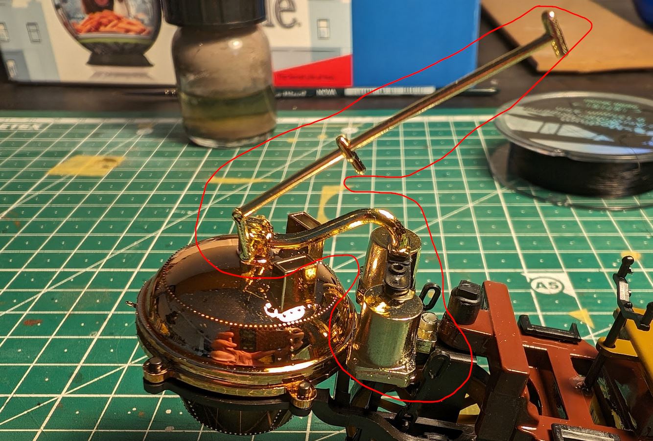 Mal im Hinterkopf behalten, die lange (dicke) Stange zur Dampfregulierung ist auf der falschen Seite angebracht. Ist ein Fehler im Modell, der später noch korrigiert werden muss...