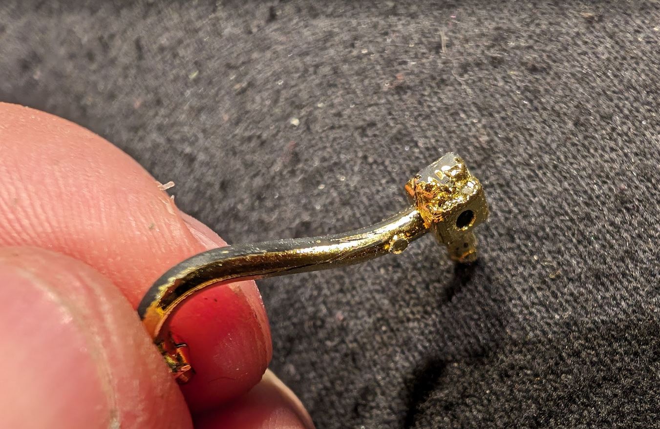 Krumm, schief, plump, hässlich und dann noch mit der Steckverbindung auf der falschen Seite. Ich hab die wesentlichen Teile durch ein Messingröhrchen von Albion Alloys aus der Restekiste ersetzt. Der Handgriff ist aus einem Blatt Polystyrol geschnitten.