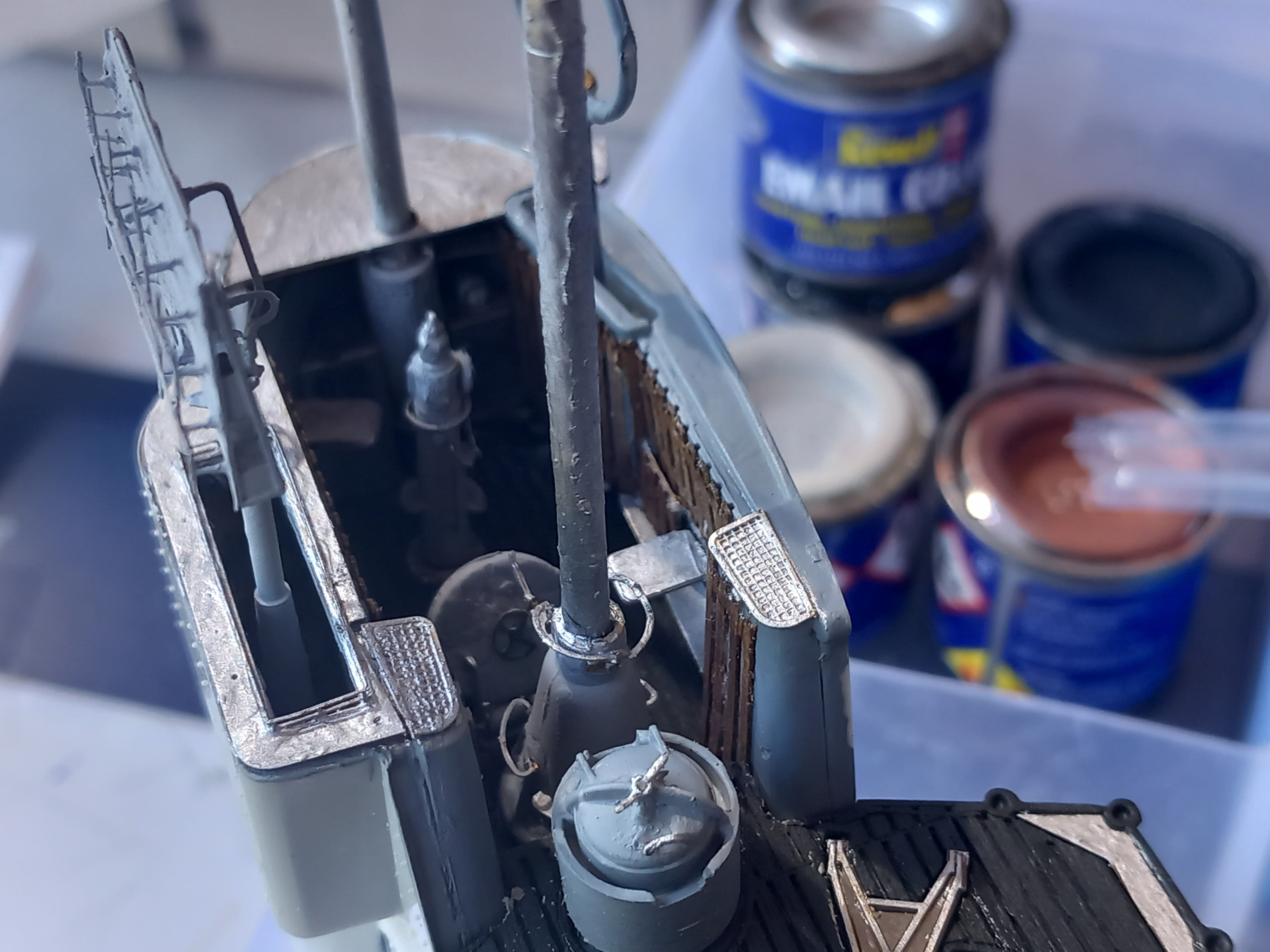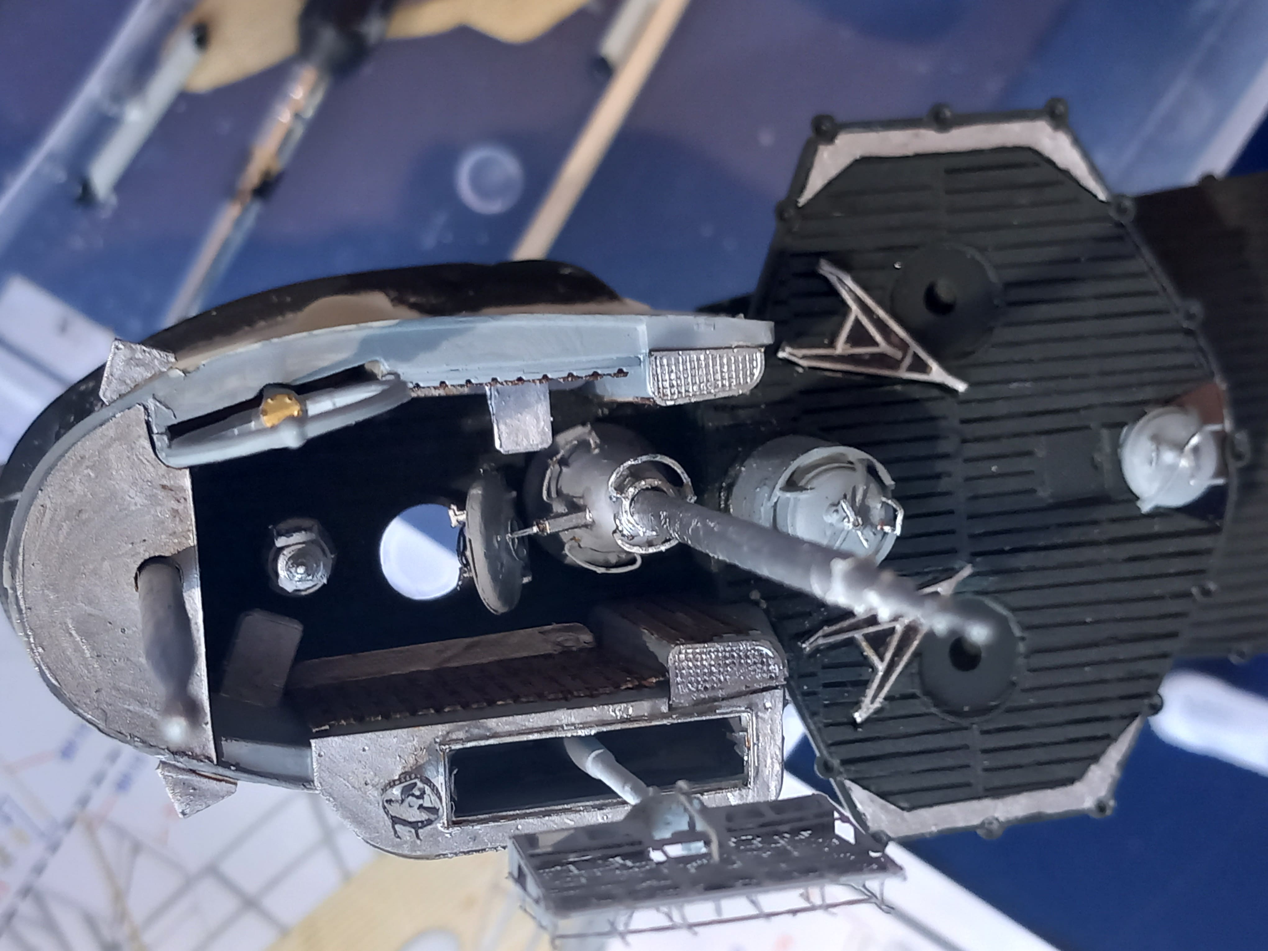 Weiter geht es mit der Kommandobrücke, Diese ist inzwischen mit beiden Seitenwänden und den Antennen bestückt worden. Die Wasserbehälter sind auch eingebaut worden. Es ist schon sehr eng auf der Brücke. Viele Leute können dort nicht stehen. Ich hoffe, ich kann dort am Ende wenigstens ein paar Figuren unterbringen. Gruß Ingo