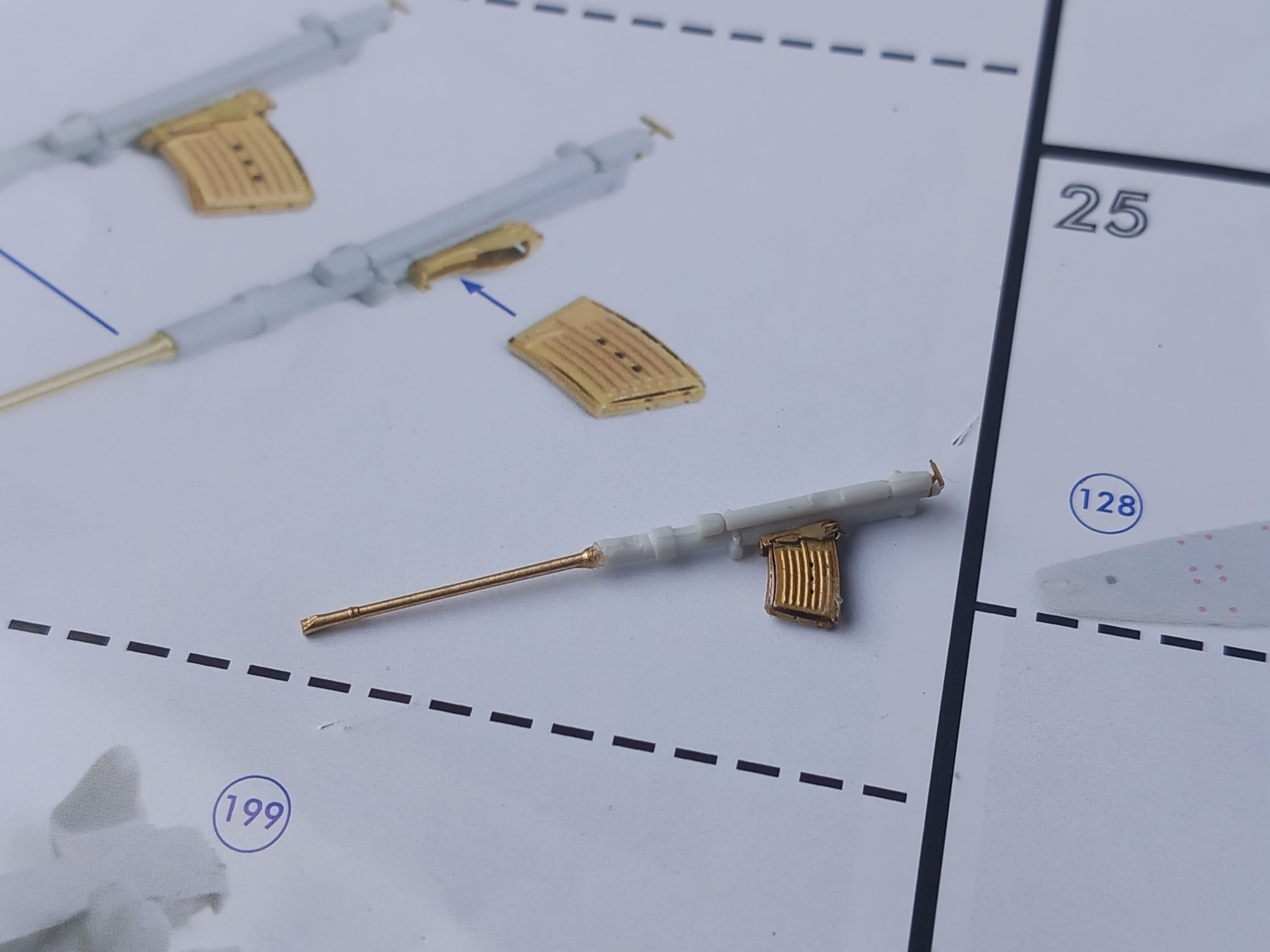Moin. Da ist mir aber ein grober Fehler passiert. Bevor die seitlichen Ätzteile an der Flak angebracht werden muß der Sockel der Flak installiert werden. Das geht aus dem Ätzteilplan so nicht hervor und da ich mich auf die Ätzteilorgie konzentriert habe ist mir das entgangen. So musste ich die Ätzteile wieder herausbrechen und hinterher wieder anbringen :evil: :evil: :evil: