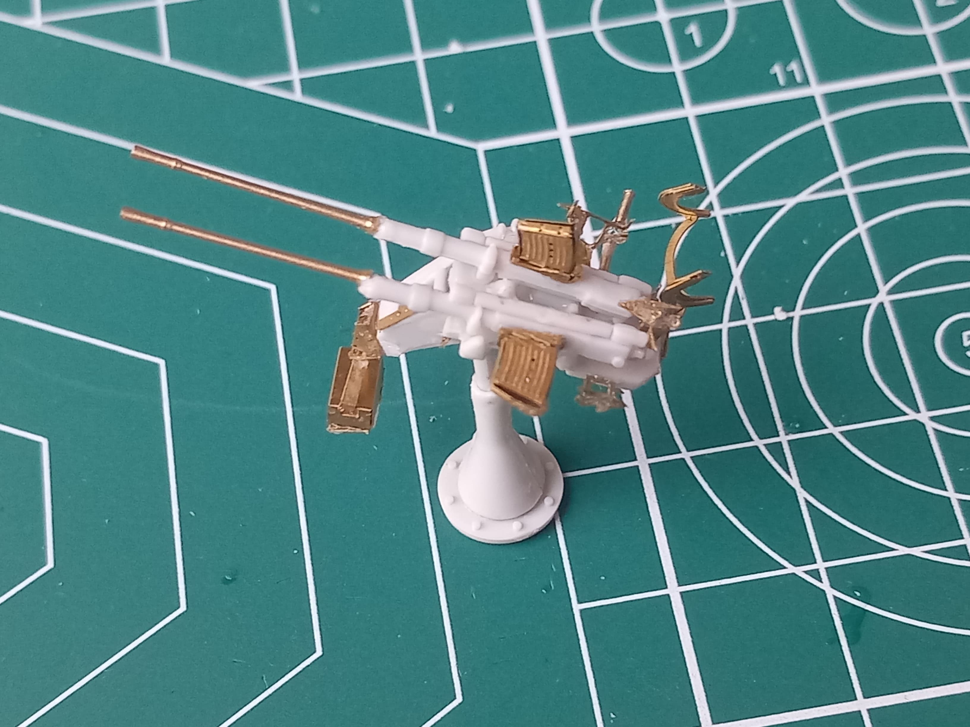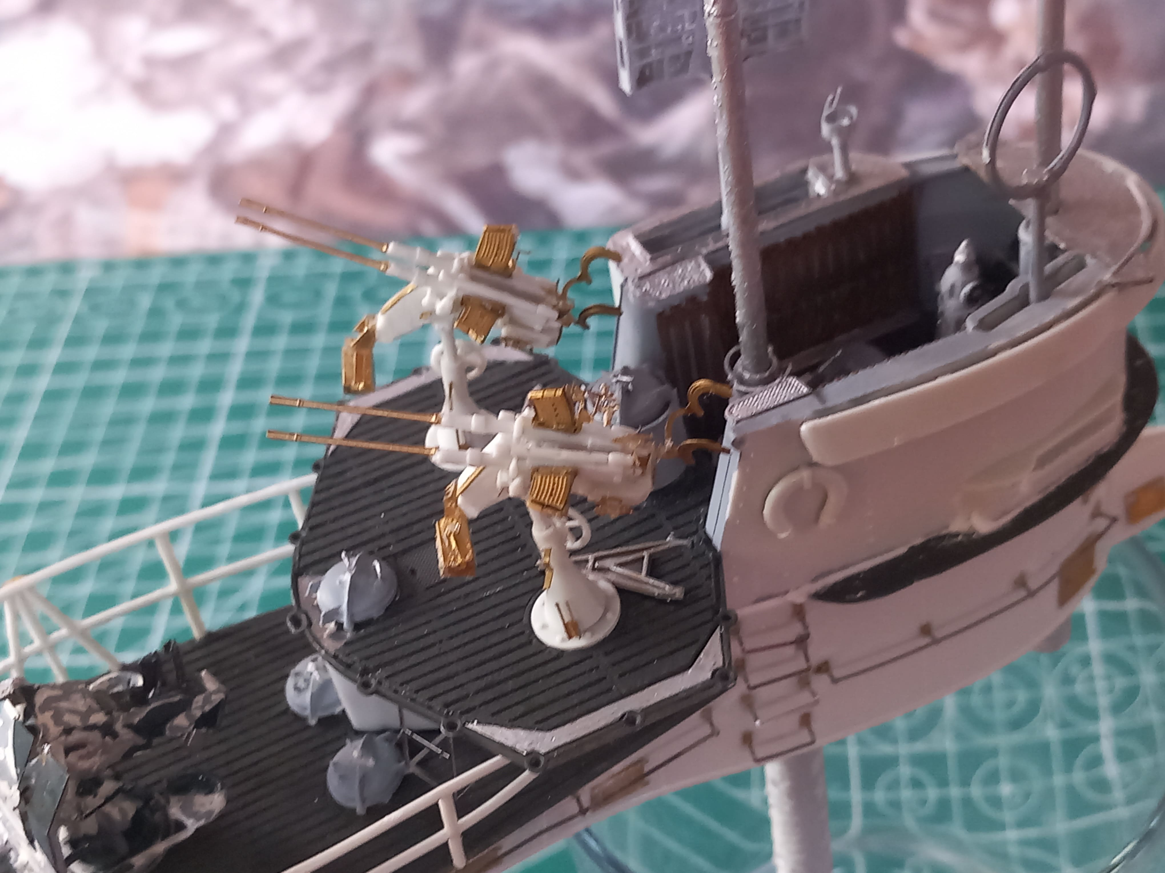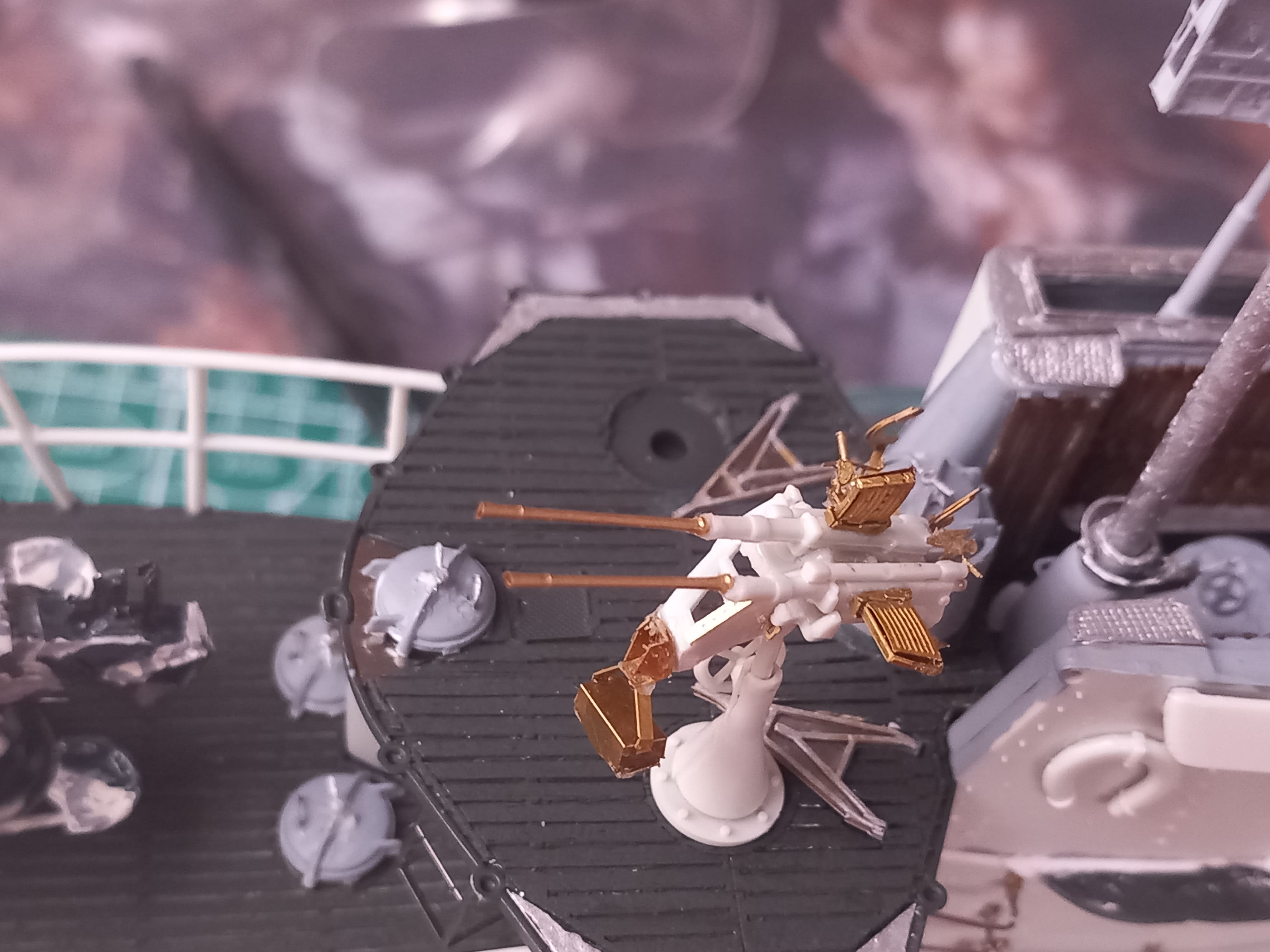 Auch beide Zwillings-Flak sind fertig. Ebenso die Reling. Bei den Flak`s hatte ich keinerlei Probleme. Auch die kleinen Löcher, die in das Geschütz gebohrt werden müssen um die Rohre aufzunehmen, gingen problemlos von der Hand. Bei der Reling waren etliche Fischhäute zu entfernen. Jetzt geht es mit der Bemalung am Rumpf weiter. Gruß Ingo