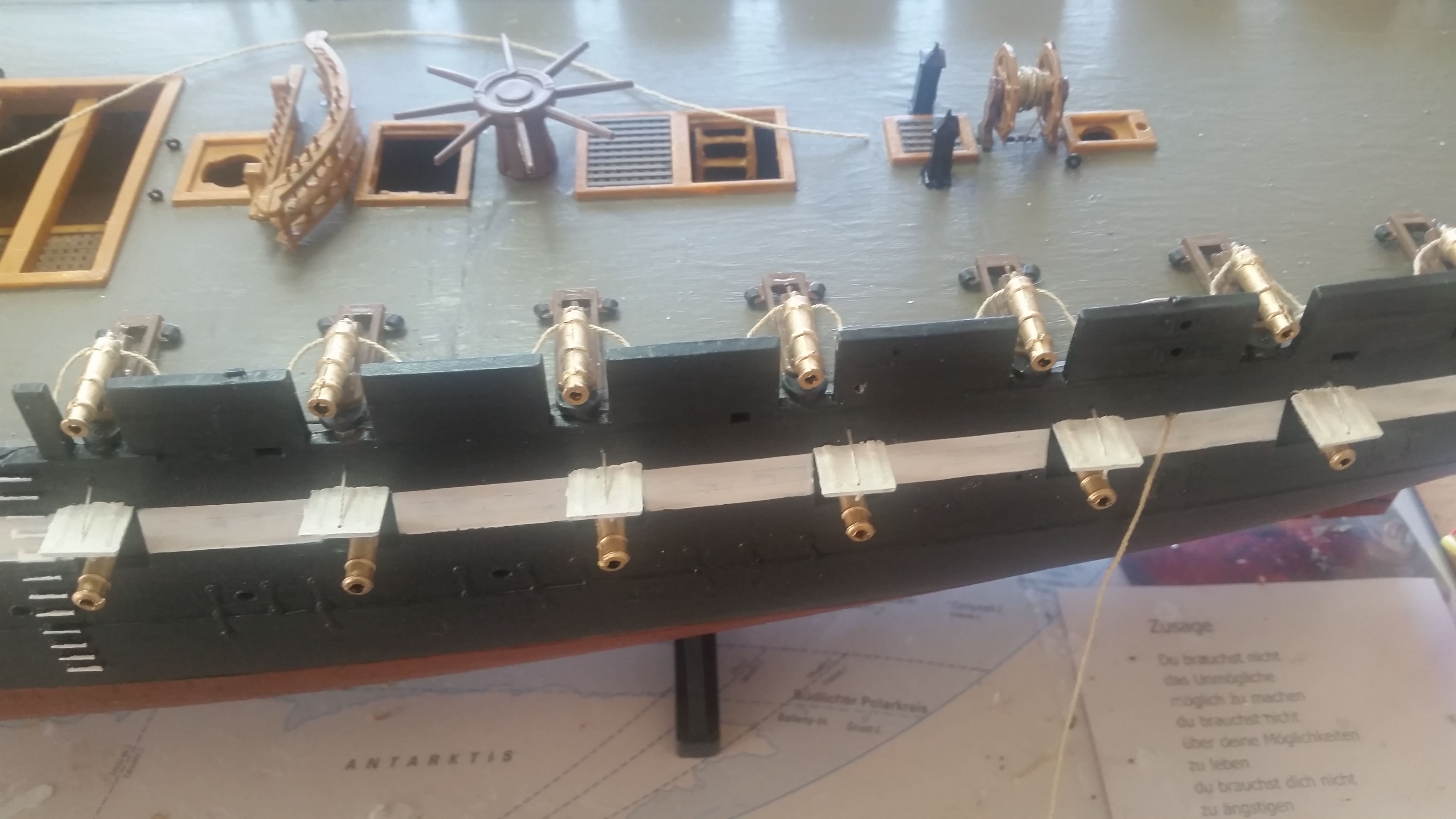 Alle Karronaden sind jetzt auf Deck. Die Bewaffnung ist damit komplett. jetzt kommt der hintere Aufbau dran.