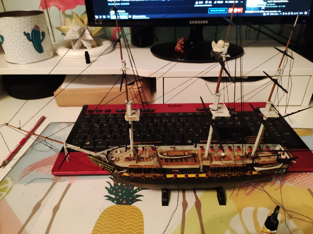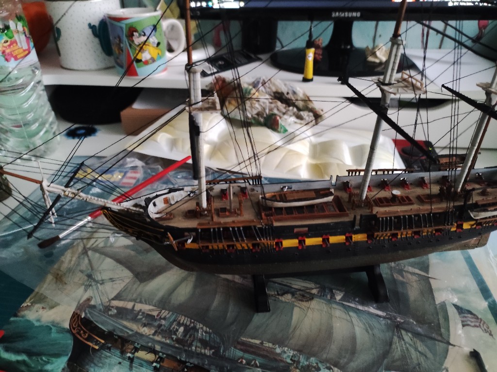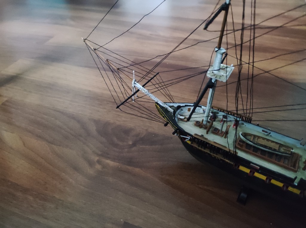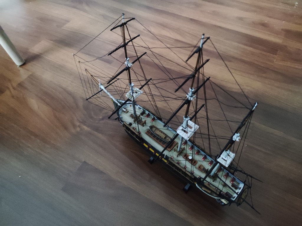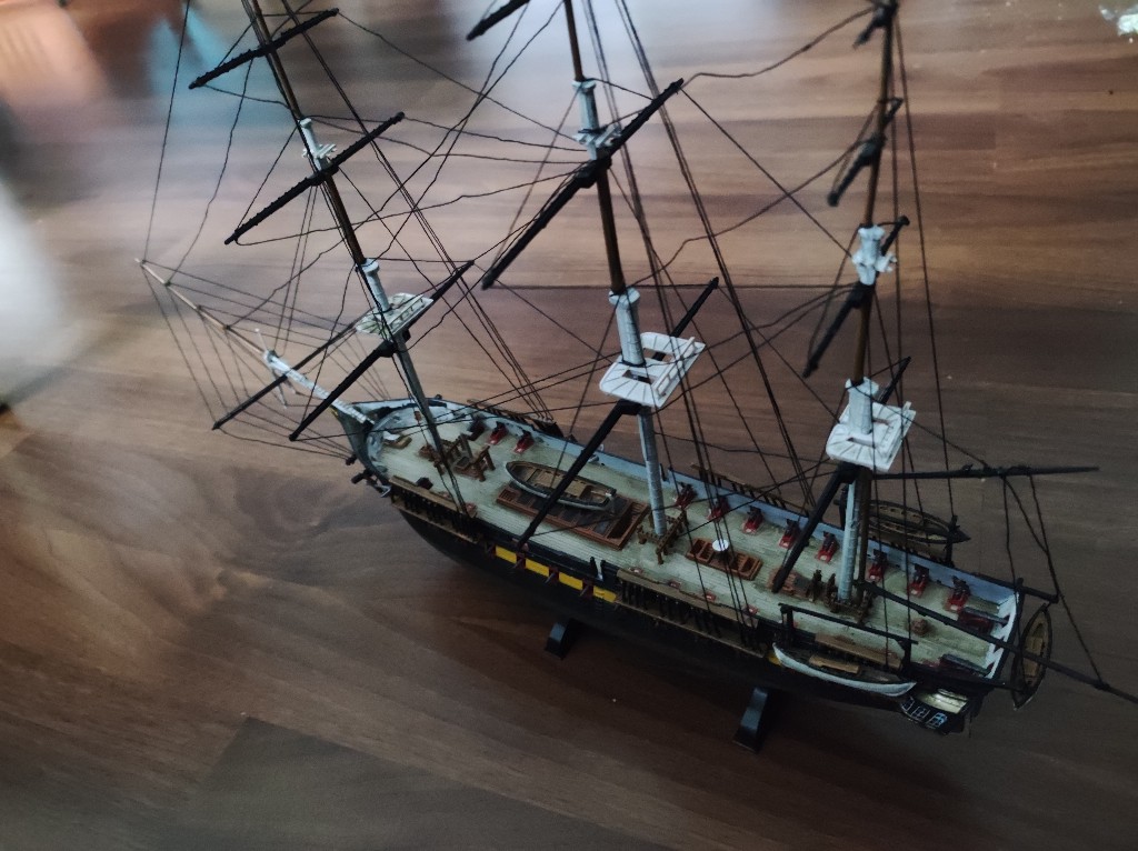 Hier sieht man vielleicht sogar nochmal ein wenig die Alterung. Das Kupfer ist mit einem grünen Wash versehen wurden und die Kanonen mit schwarzen Pigmenten versehen, dabei auch das Gelb etwas gebrochen.
