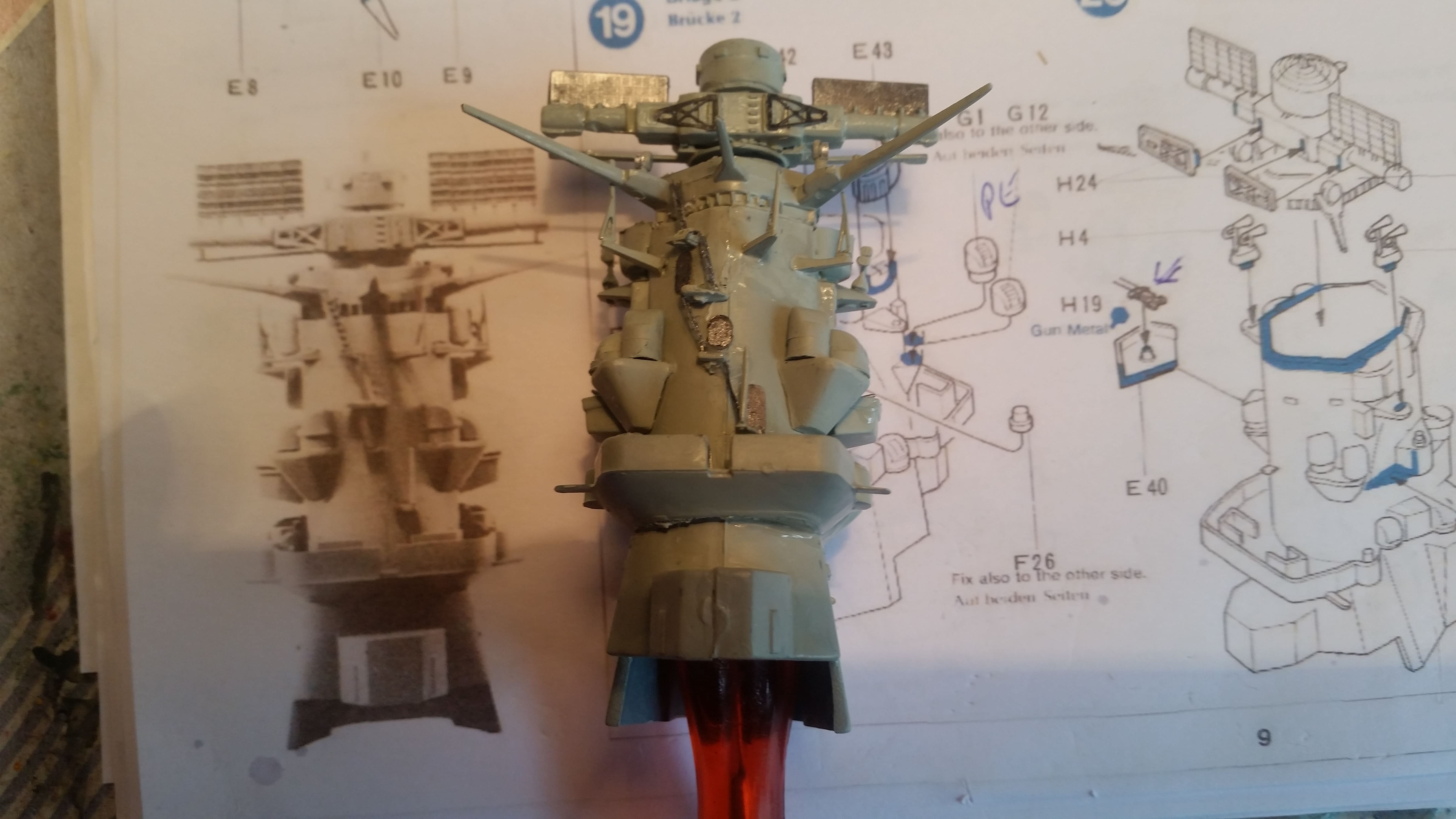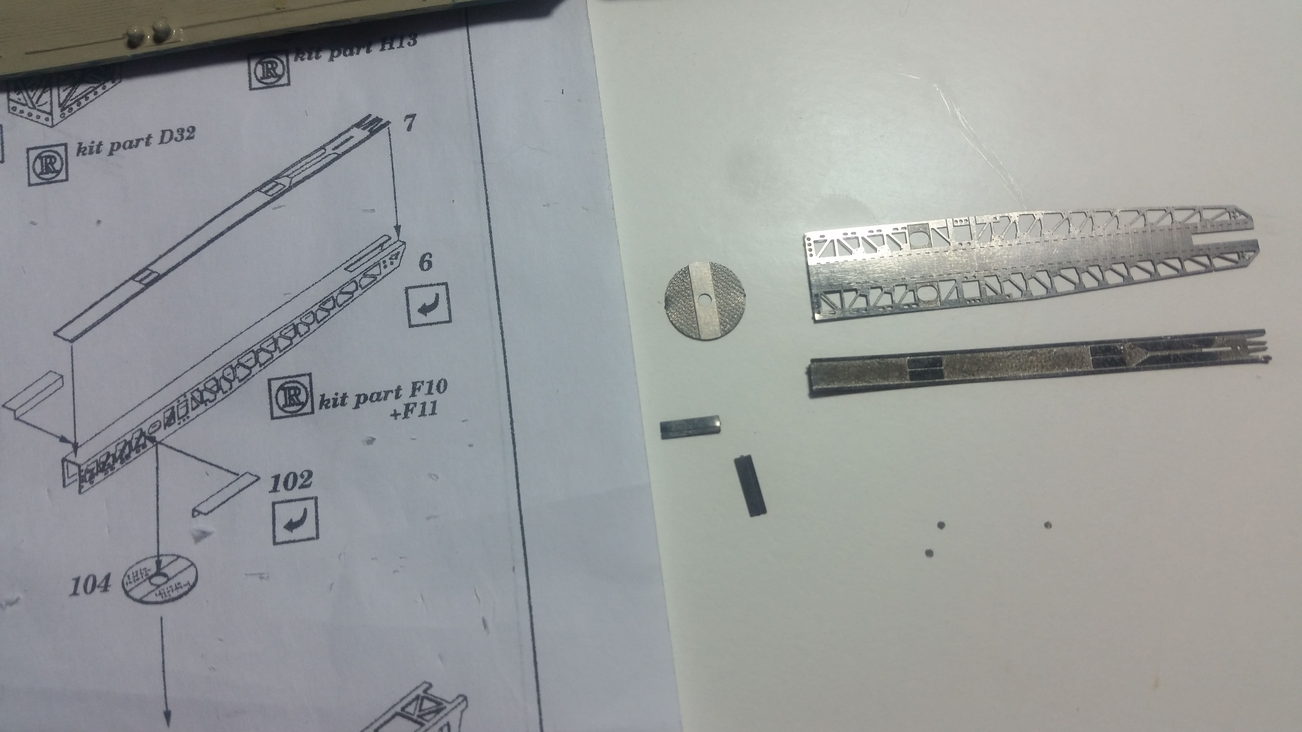 Die Katapulte für die Wasserflugzeuge sind auch fertig und angebracht. Jeweils 5 Ätzteile die zusammengebaut werden müssen. Jetzt geht es an die Geschütze im Mittelteil rund um die zwei Brücken.