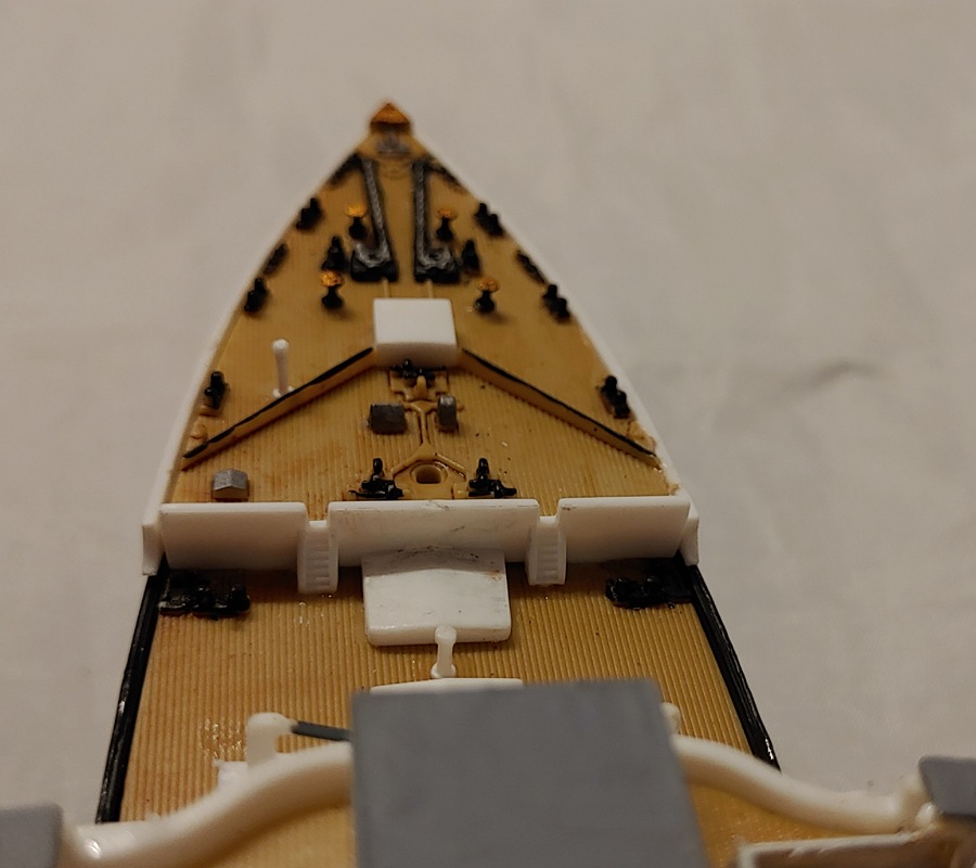 Also wir sind noch lange nicht so weit; wir haben gestern erst mit dem Deck am Bug angefangen...die Teile habe ich versäubert; meine Tochter hat angefangen zu malen... Dann werden wir das Deck zusammensetzen und im Rumpf einbauen.