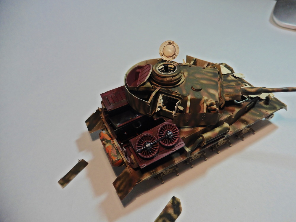 Die Luken sollen geöffnet dargestellt werden . Da diese aber ja auch in der Tarnung bemalt werden müßen , habe ich diese erst mal geschlossen angebracht und mit Maskol punktuell festgeklebt . Läßt sich einfach wieder lösen und rückstandslos entfernen