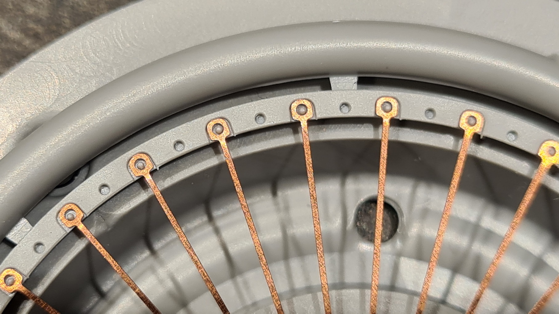 Wie man einigermaßen erkennen kann, ist der Speichenstern in dieser Form zu groß. Unten in ein paar Löchern eingerastet, oben steht er drüber. Na klar, das passt erst im gebogenen Zustand. Also biegen wir. Mit einem mitgelieferten Pinöpel wir das ganze eingedrückt.
