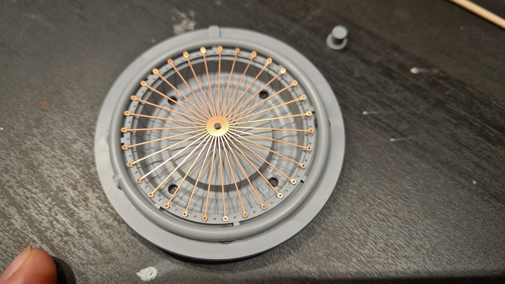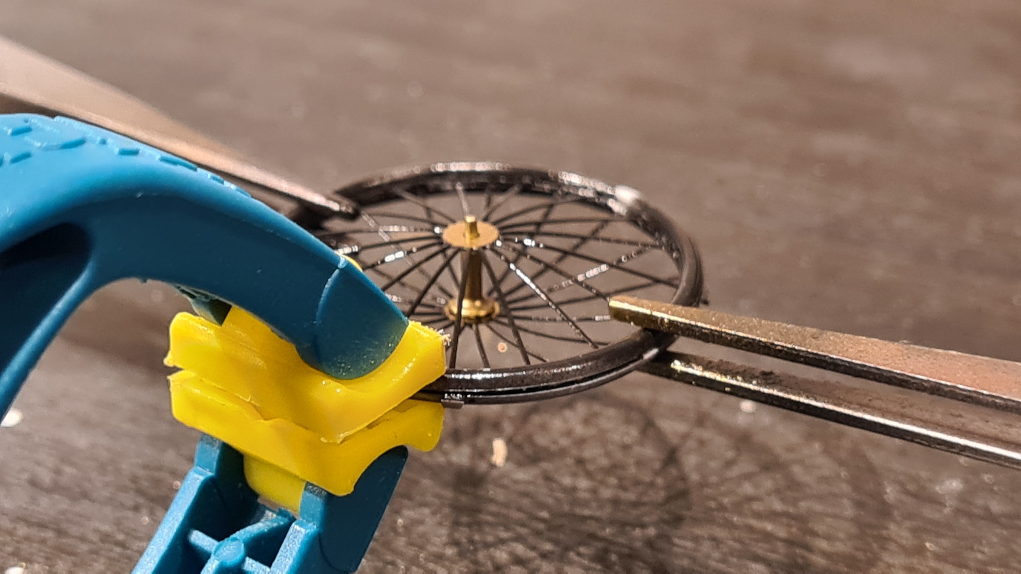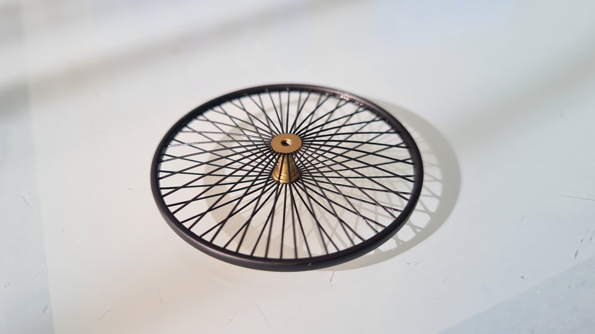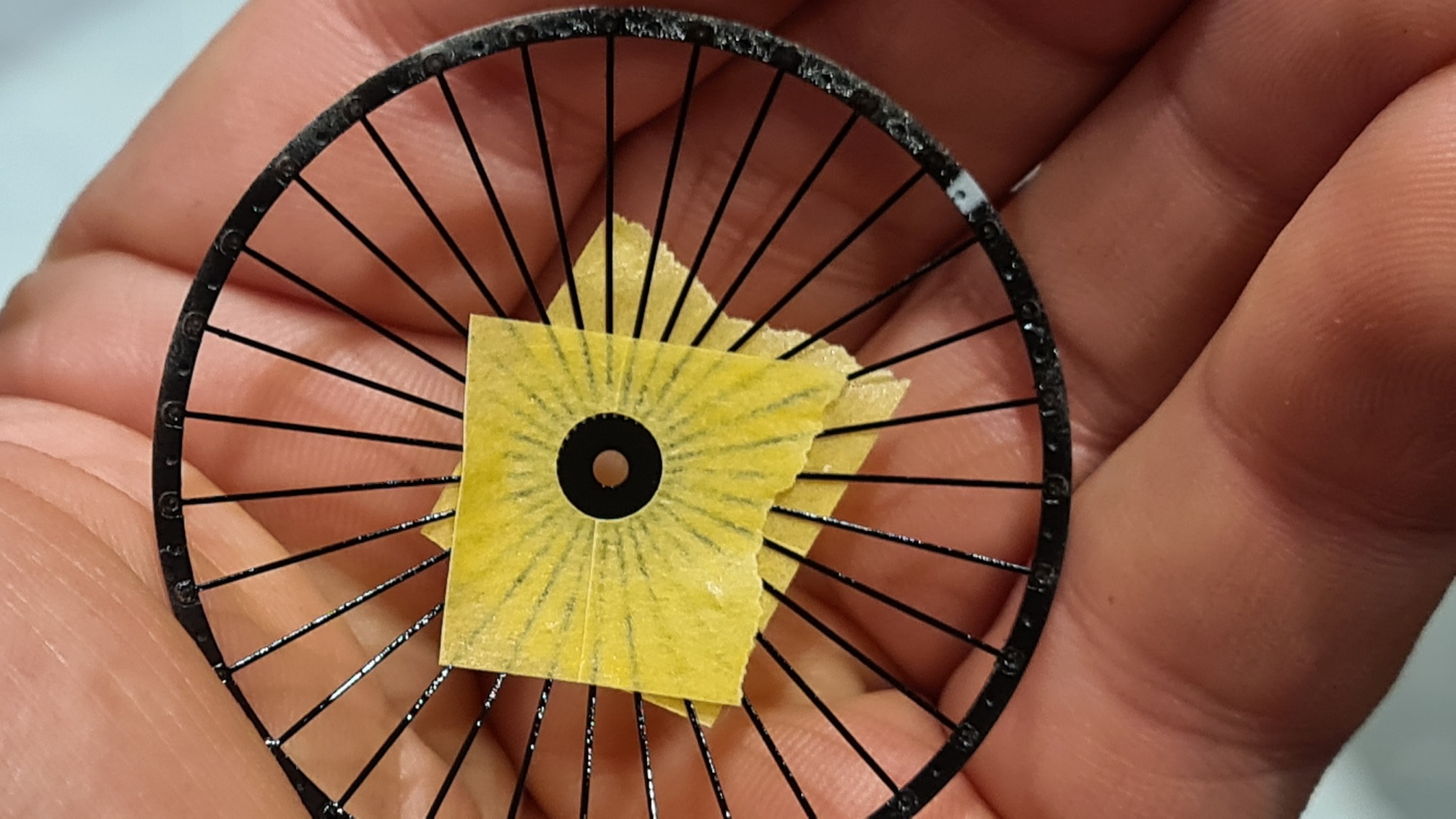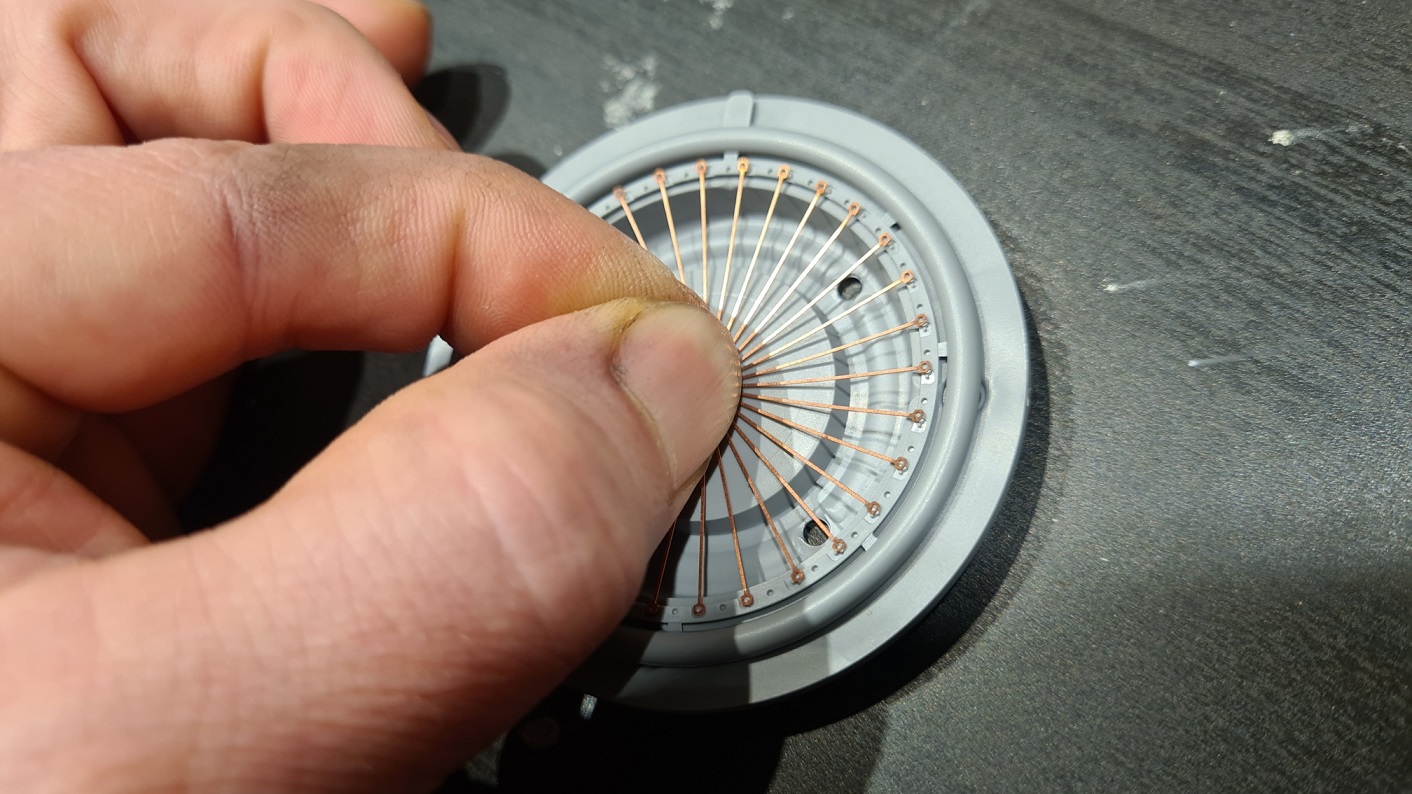 Ohne Foto. Ich habe die Speichen einzeln mit Sekundenkleber fixiert. Sicher ist sicher.