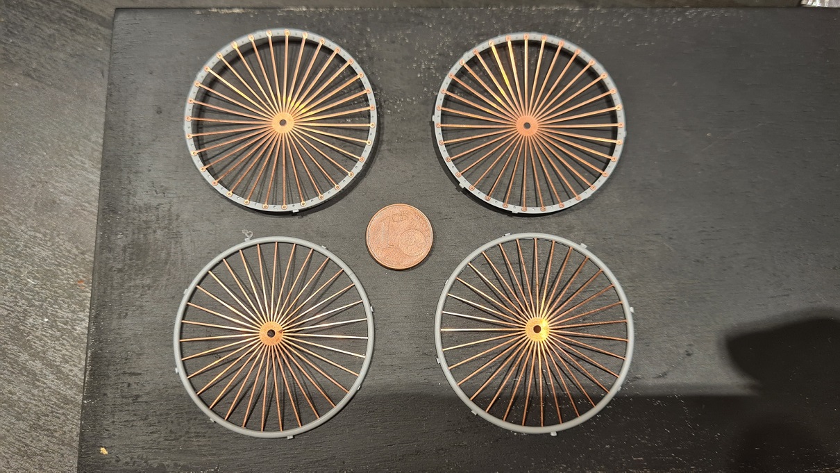 Na klar, es folgt Messing (Alclad 2). Achtung beim demaskieren der Innenseite, bloss keine Speiche herausreißen. Klebekraft des Klebebands unbedingt reduzieren.