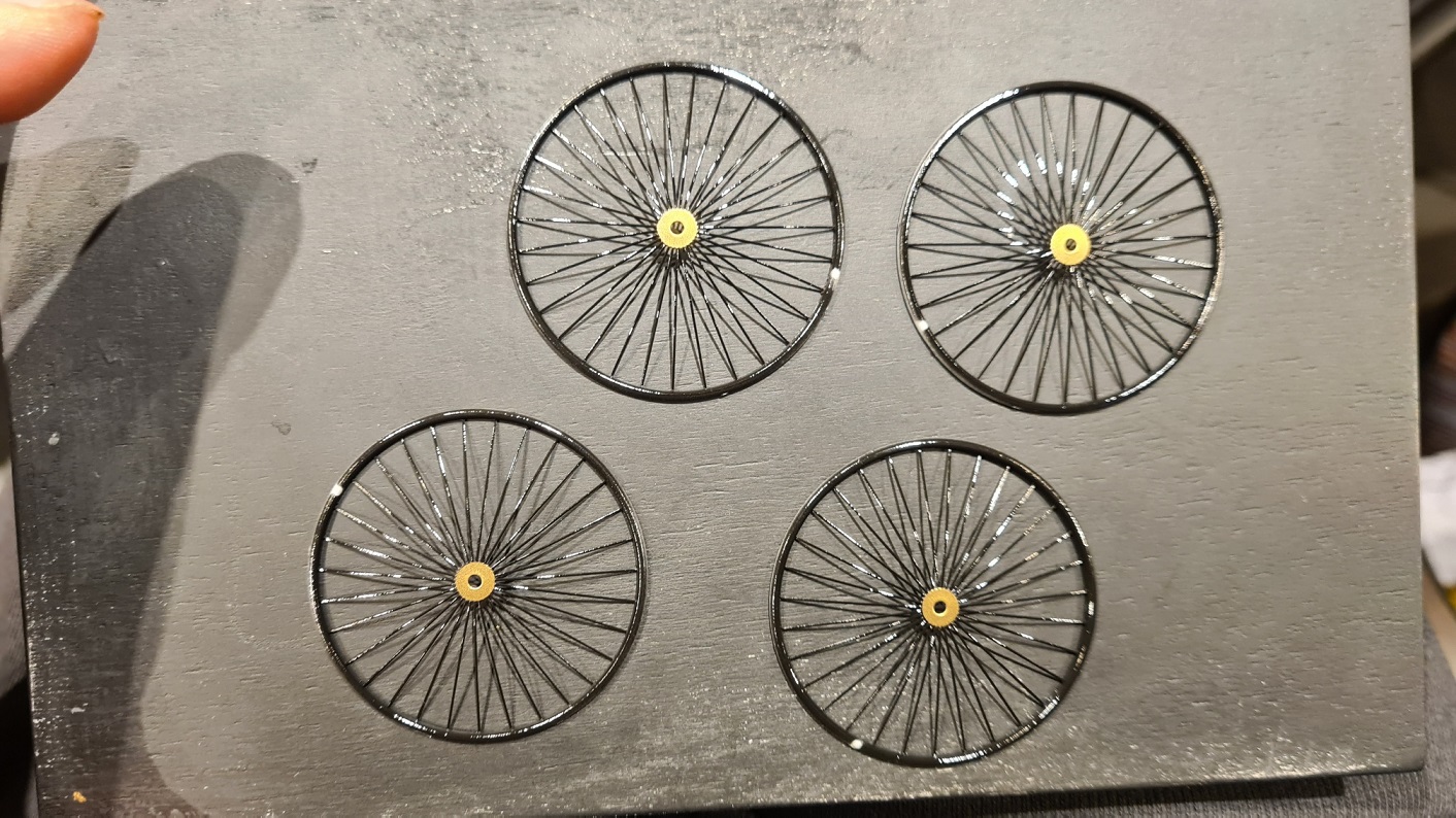 und die Speichen übernebelt mit stark verdünntem Vallejo Schwarz. Aber so, dass noch etwas vom Glanz erhalten bleibt. Achtung, nur exakt von vorne draufnebeln. Die Nabe selbst soll nichts abbekommen. Resultat, siehe spätere Fotos.
