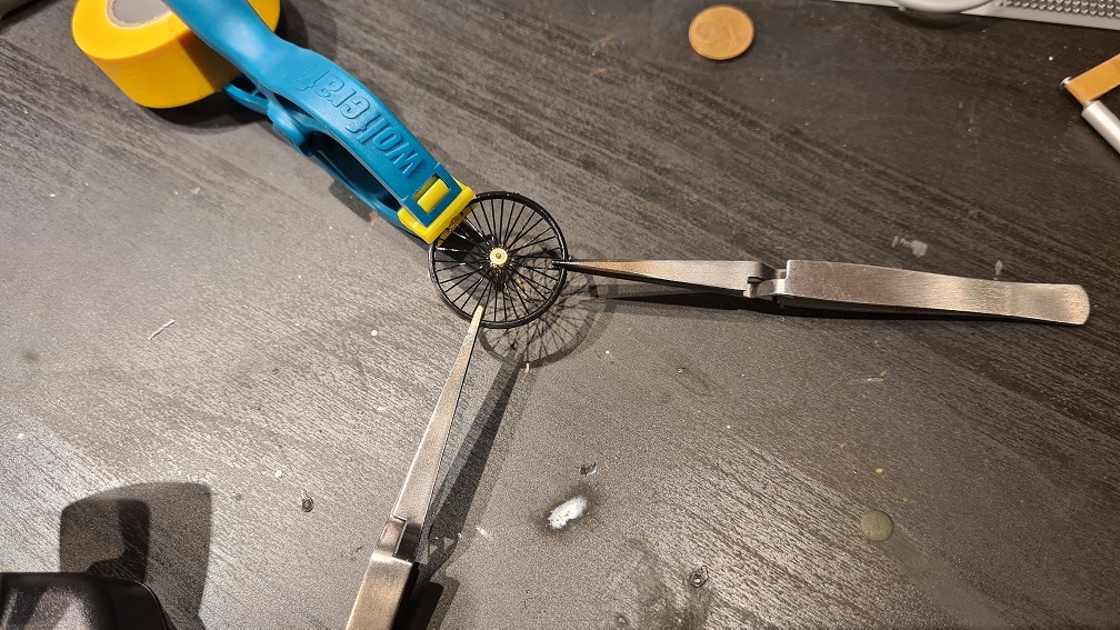 Vorne beim Laufrad war das Zusammenkleben der Radhälften besonders kompliziert. Ich musste mit Klemme und Klemmpinzetten nachhelfen und wirklich stückchenweise kleben.
