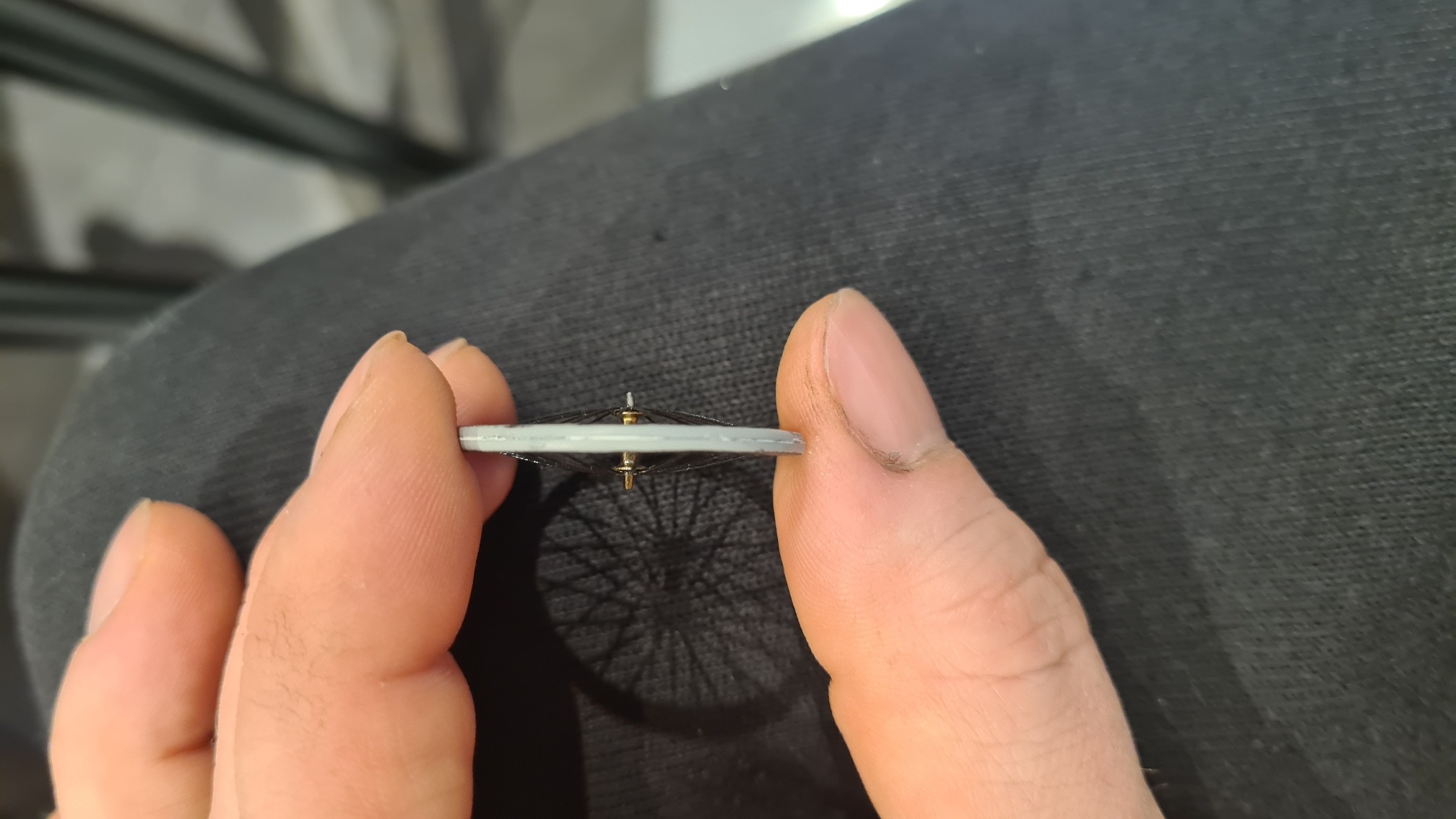 Man wird schnell merken, dass es dabei nicht sofort "click" macht. Am Ende muss man hingehen und die Speichen (im eingedrückten Zustand) einzeln mit einer Pinzette über die richtige Position bringen. Dann macht es "click". Meistens. Irgendwann ist man aber durch.