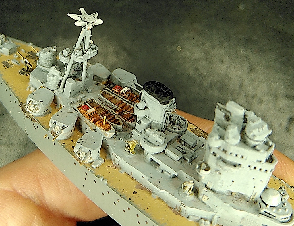 Sehr beeindruckend. Jetzt muss eigentlich nur noch diese merkwürdige Sternantenne auf dem hinterem Mast weg, dann sieht man auf den Fotos keinen Unterschied mehr zu einem 1:700er Modell
