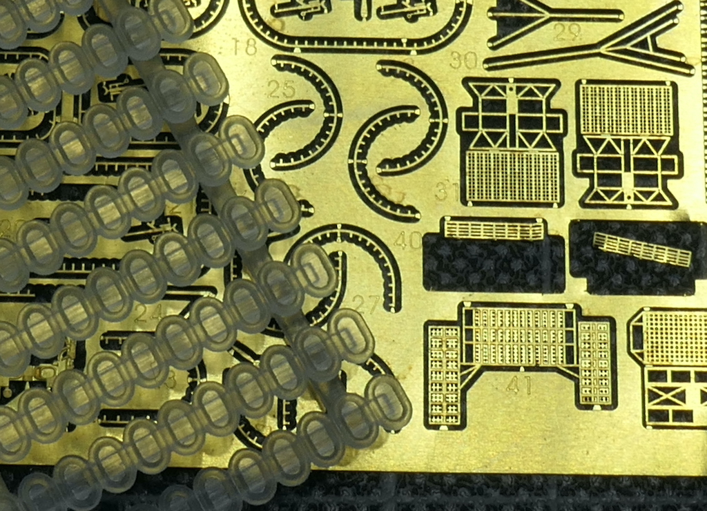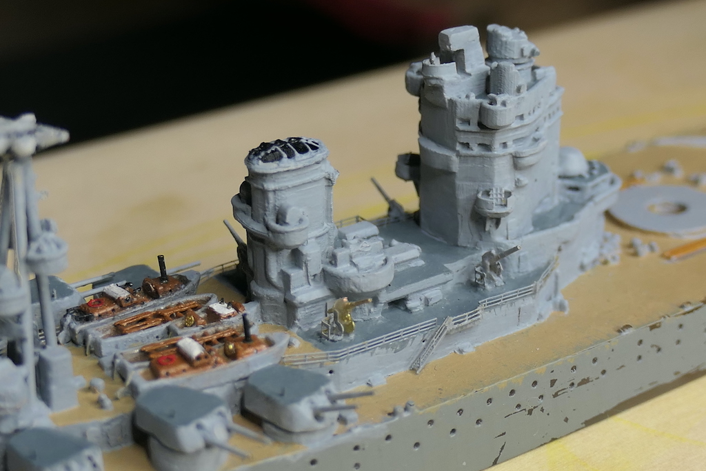 ...musste ich diese für die 1941er-Version durch offene Geländer ersetzen. Hierfür konnte ich auf 1/1250 Elemente von Tom's Modelworks zurückgreifen. Für die Treppenaufgänge habe ich mich am Titanic 1/1200-Set des selbigen Herstellers bedient.