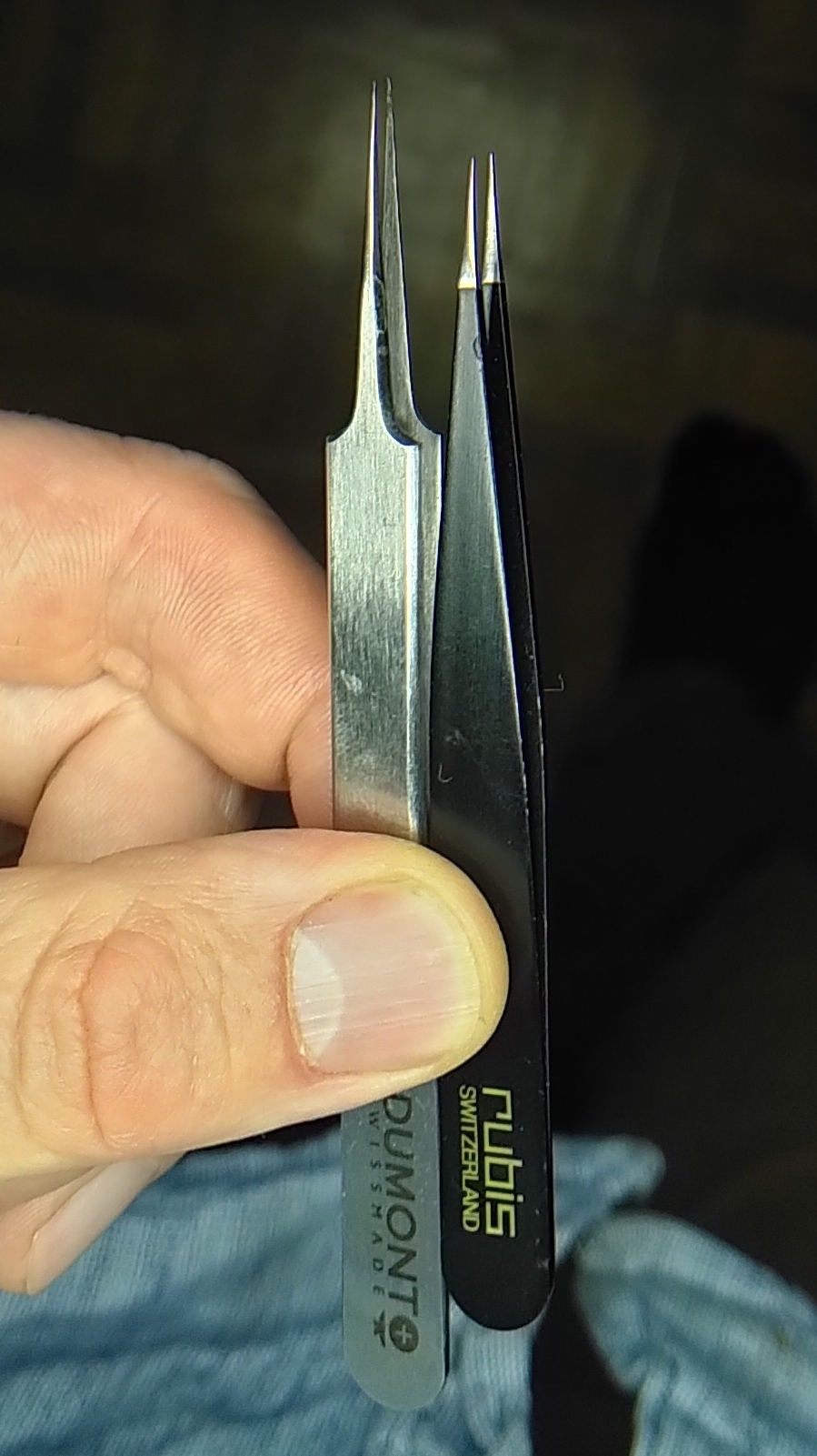 Die von Dumont hat sich bei mir auch schon verbogen - zwar konnte ich sie wieder zurechtbiegen, ganz so genau wie bei der Rubis treffen die Enden aber nicht mehr aufeinander. Und wenn ich z.B. nach 0.1mm Draht greife, dann ist das sehr entscheidend. Denn bei der Dumont spicken mir gegriffene Gegenstände häufiger davon als bei der Rubis.