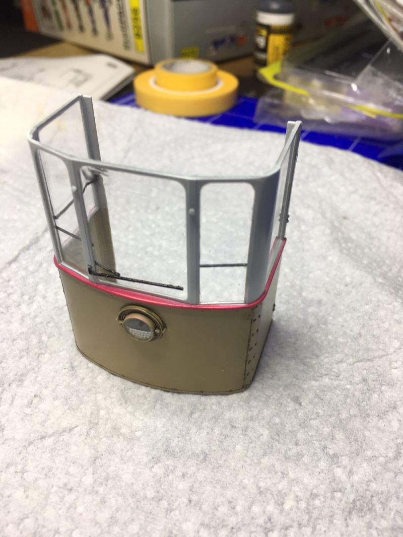 Los ging es mit den beiden Enden der Bahn. Die, wie üblich, vielen Einzelteile passten gut ineinander und wurden gleich mit der Airbrush bearbeitet. Dann kamen die Klarteile, Haltestangen und Scheibenwischer (mit Handbetrieb) hinzu.