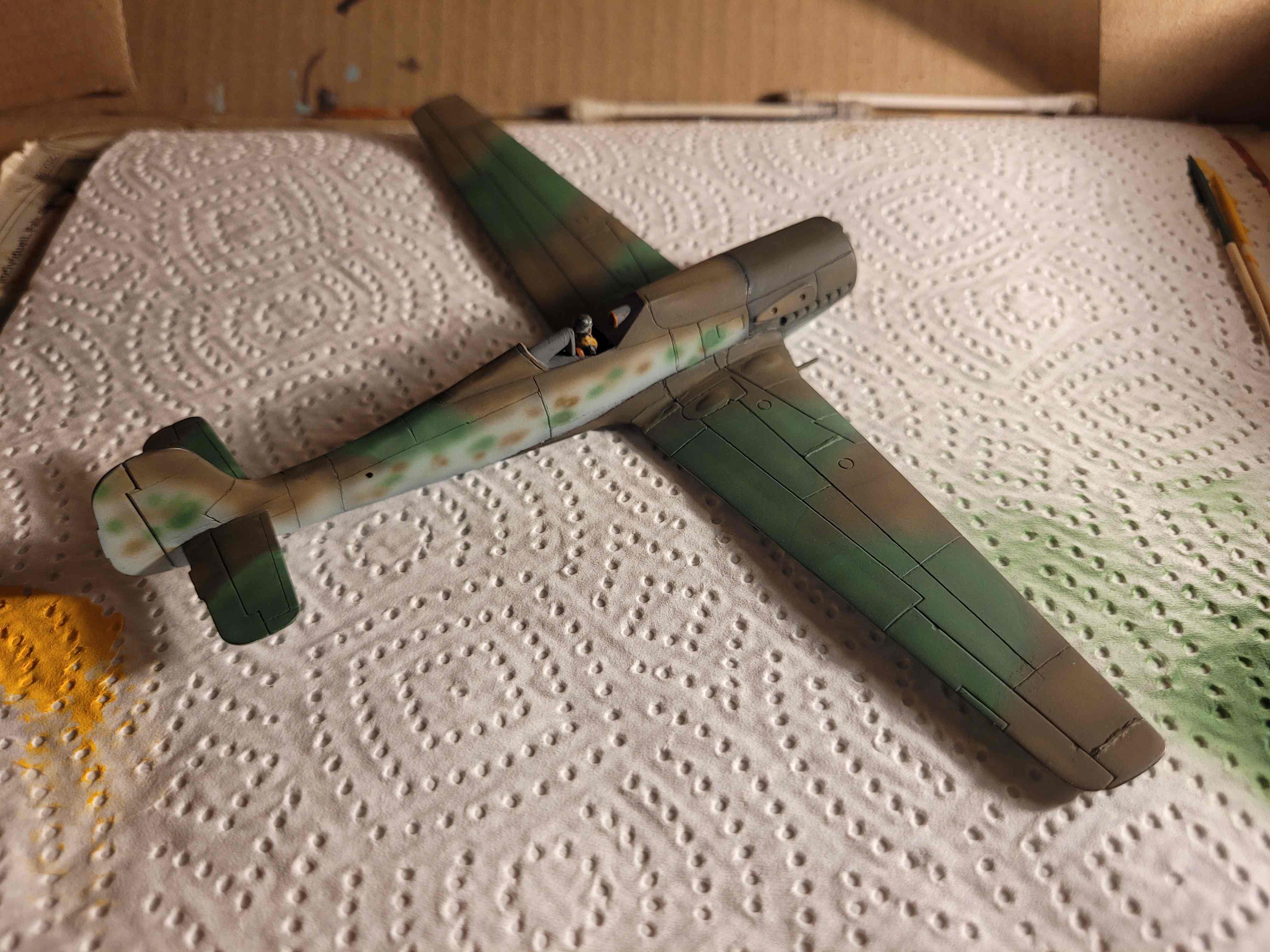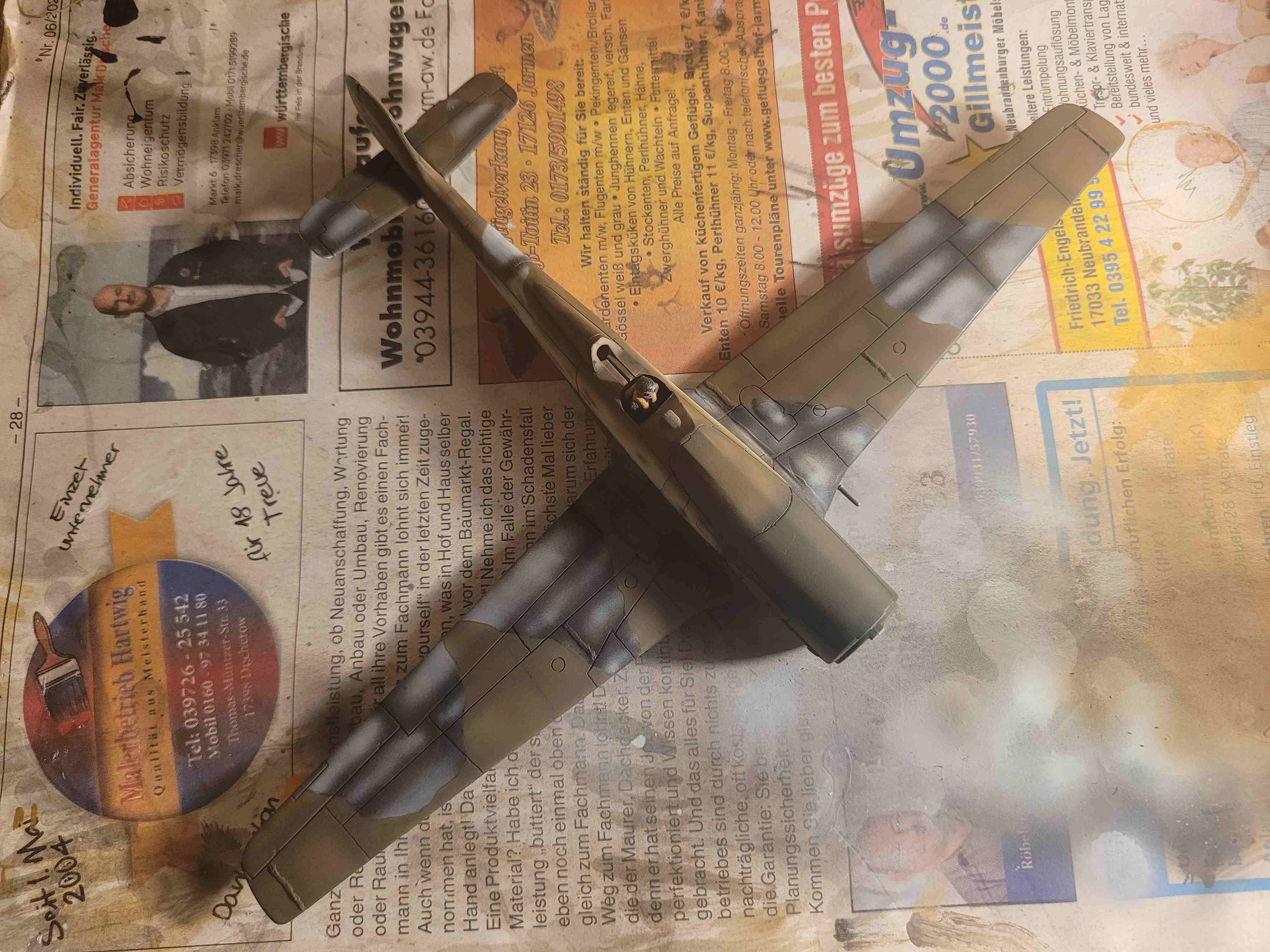 Soderle...die erste Tarnfarbe ist inzwischen auf den Tragflächen und auf dem Rumpf. Abgeklebt hab ich die Tarnflecken auf den Tragflächen mit Pattafix und hab mich dabei für scharfkantige Flecken entschieden. War ziemlich mühselig, aber hat sich gelohnt.