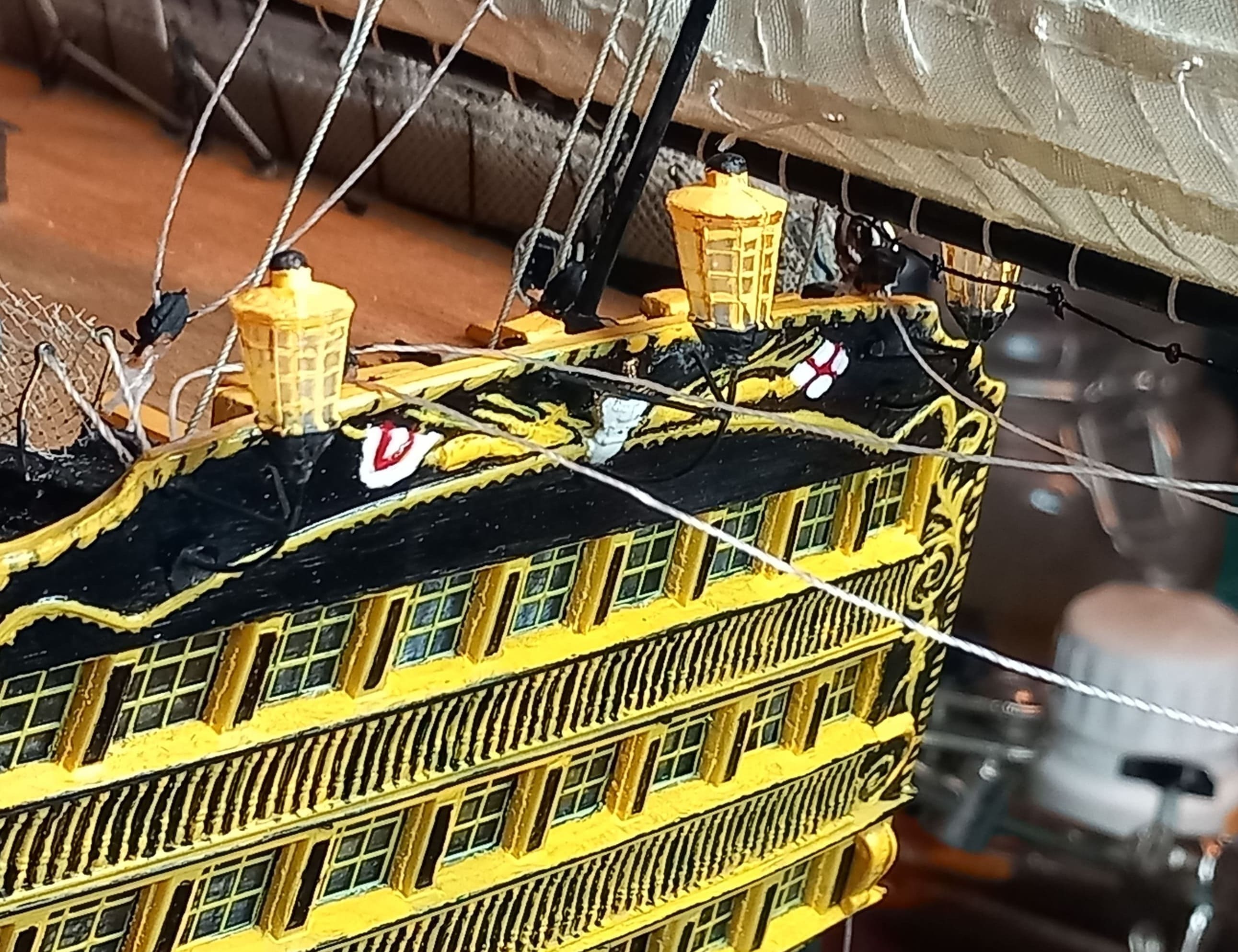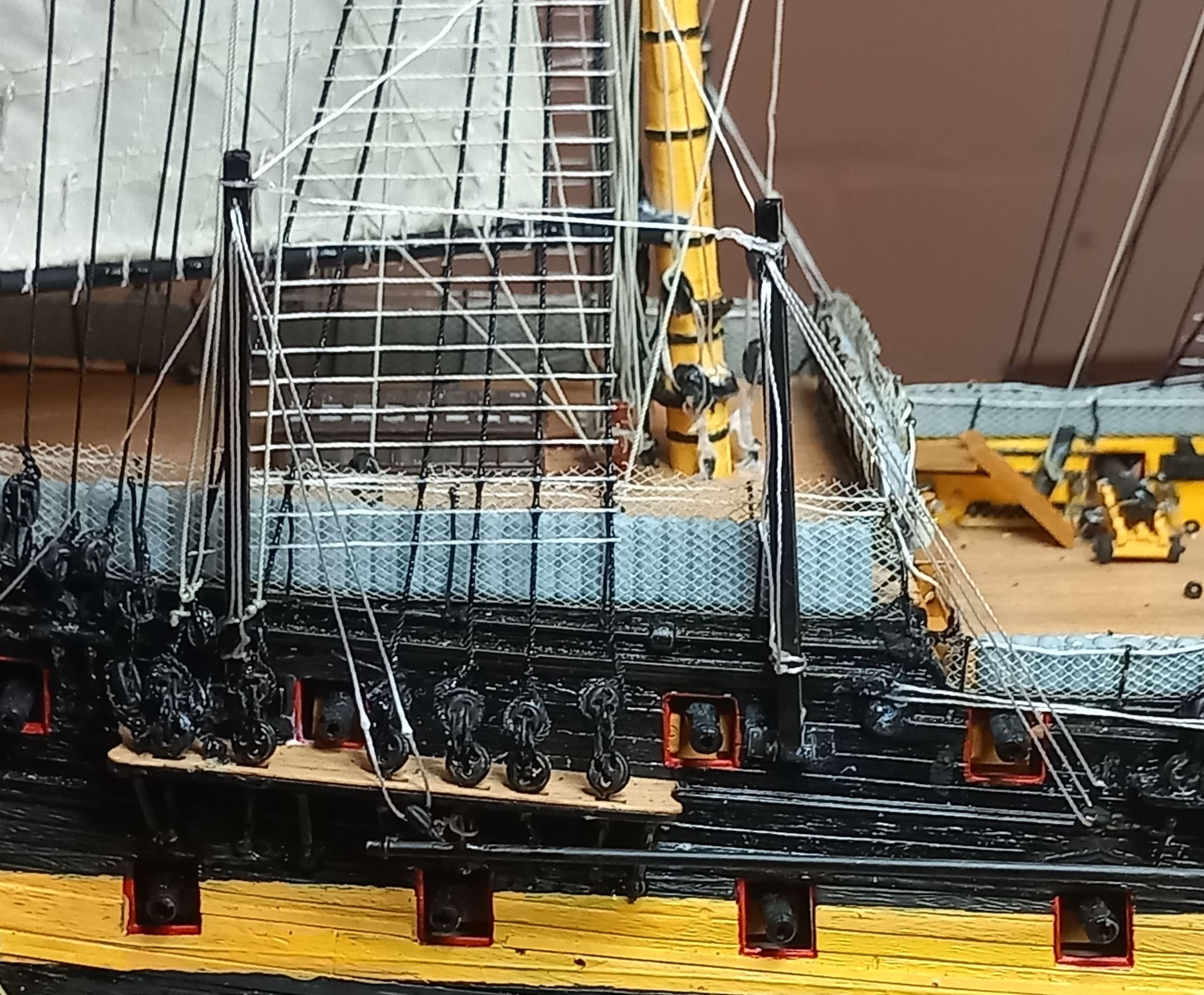 Hallo. Wieder langsam weitere Fortschritte. Die Stückpforten sind angebracht. Dazu wurden 80 Klüsendeckel, 80 Beschläge und 316 Augbolzen angebracht.