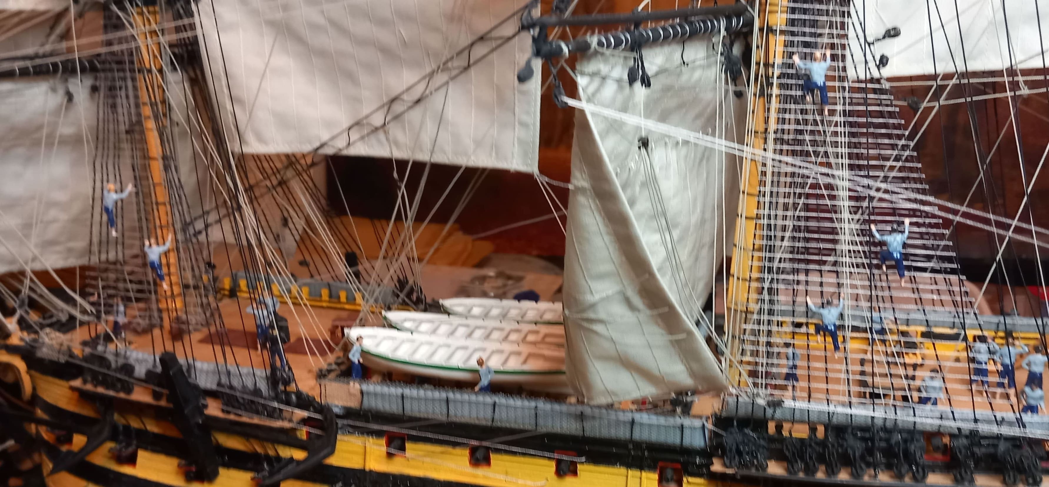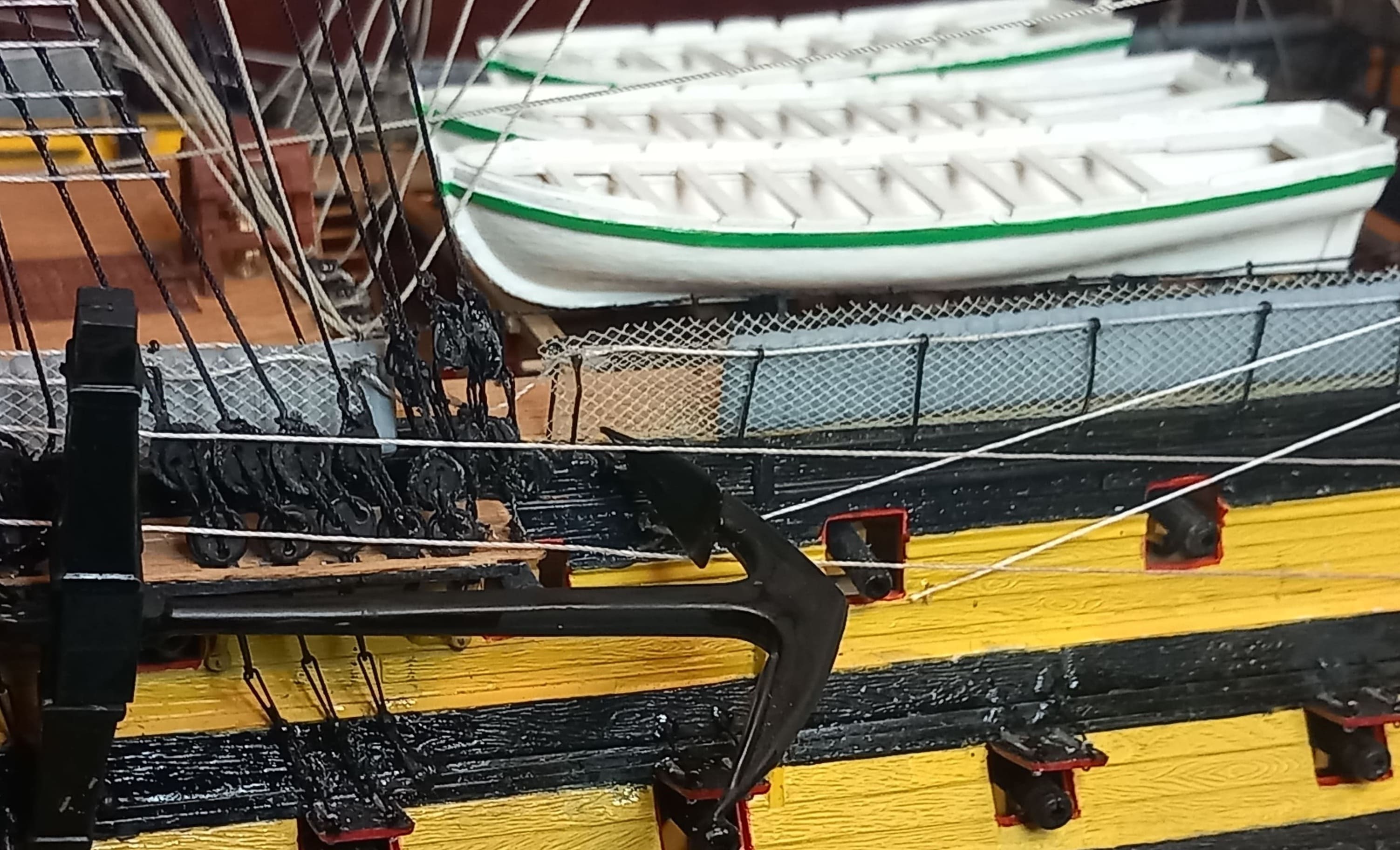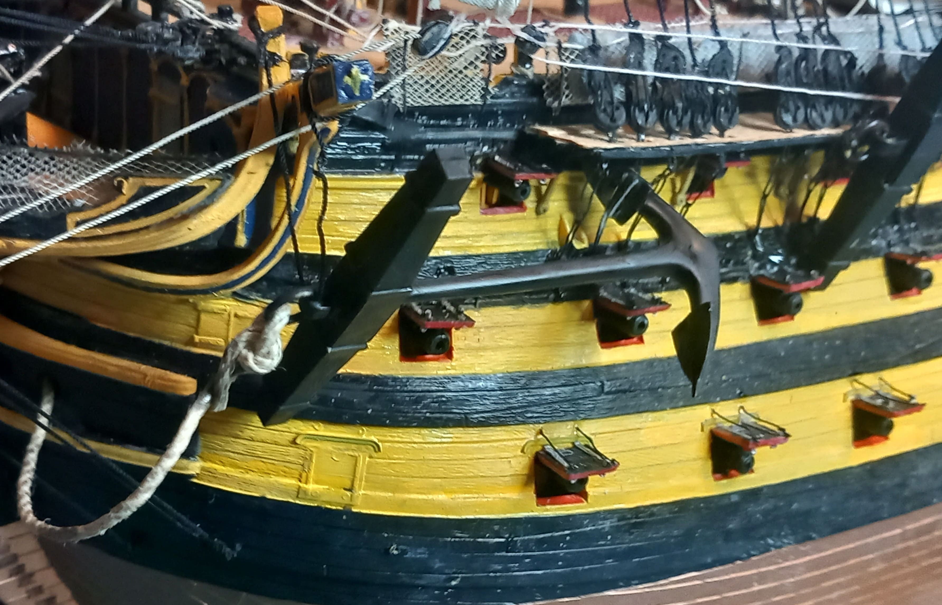 Hallo. Die Victory hat Ihre Anker bekommen und die Ruderboote wurden plaziert. Auch die Besatzung ist an Bord und erfüllt Ihre Aufgaben. Damit ist die Victory fertig geworden. Ich danke allen, die mich in der 3-jährigen Bauphase unterstützt haben, besonders danke ich Dafi für seine große Hilfe und für sein enormes Fachwissen zur Victory. Aber auch herzlichen Dank an alle anderen für Ihre Anmerkungen, die mich zum Weitermachen animiert haben. Schön, wenn ich den einen oder anderen mit meinem Baubericht zum Bau eines Segelschiffes bewegen konnte. Der Bausatz ist wirklich gut. Alles passt. Nur die Anleitungen sind eine Katastrophe. Die Zusatzanleitung, die jetzt wohl den neueren Bausätzen beigelegt ist, erleichtert zwar den Bau weil die einzelnen Bauabschnitte genauer unterteilt sind, diese Anleitung ist aber immer noch ungenau und fehlerhaft. Alle Anleitungen zusammen betrachtet ergeben dann eine Bauanleitung mit der man arbeiten kann. Hier noch ein paar abschließende Bilder. Die Bilder für die Galerie kommen wenn das Wetter besser ist und ich draußen Aufnahmen machen kann. Gruß Ingo