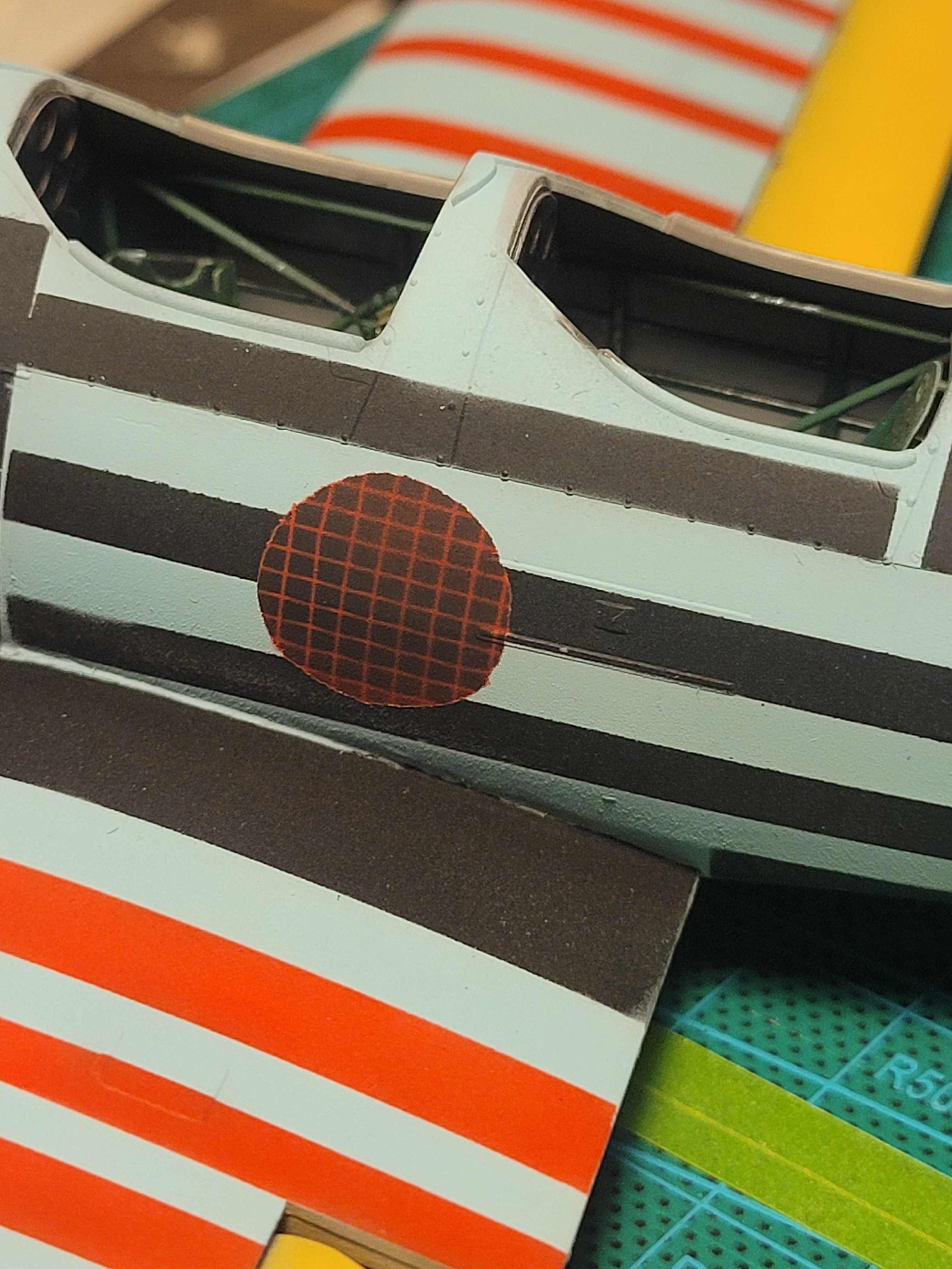 Vielleicht wäre für die gelben Punkte ein "Negativ"-Decal ein Ansatz gewesen. Sprich, gelben Streifen lackieren und schwarze Decalstreifen mit transparenten Punkten darauf setzen.