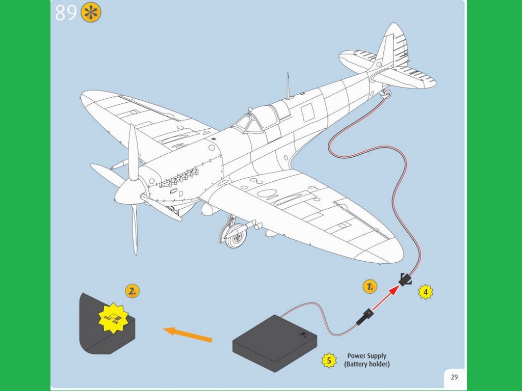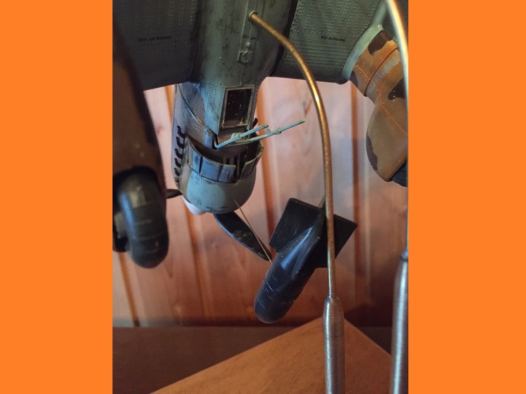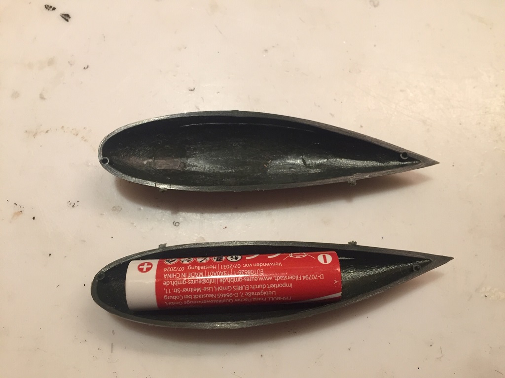Hier hängt das Kabel einfach so raus. Ich hatte mir im Fall eines stehenden Flugzeug überlegt das Kabel als "Tankschlauch" zu tarnen und die Batterien dann im Tankwagen zu verstecken. Oder die Reifen als Kontaktpunkt zu verwenden. Dann wäre noch die Frage nach dem Einschaltknopf zu klären. Bei fliegenden Modellen wird es natürlich noch schwerer.