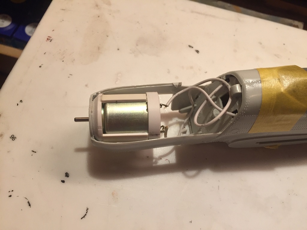 Du hast deinen Flieger ja mit zwei Metallstützen (wahrscheinlich aus Röhren) auf die Platte gesetzt. Jetzt wäre meine Idee gewesen, beide Stangen als + und - zu verwenden. Den Motor an die Rohre im Flug angeschlossen. Im Boden deiner Platte eine Öffnung passend für die 1,5V AA oder AAA gefertigt und mit den Stützen verbunden. Als Schalter wäre dann "Batterie rein oder raus" völlig okay.