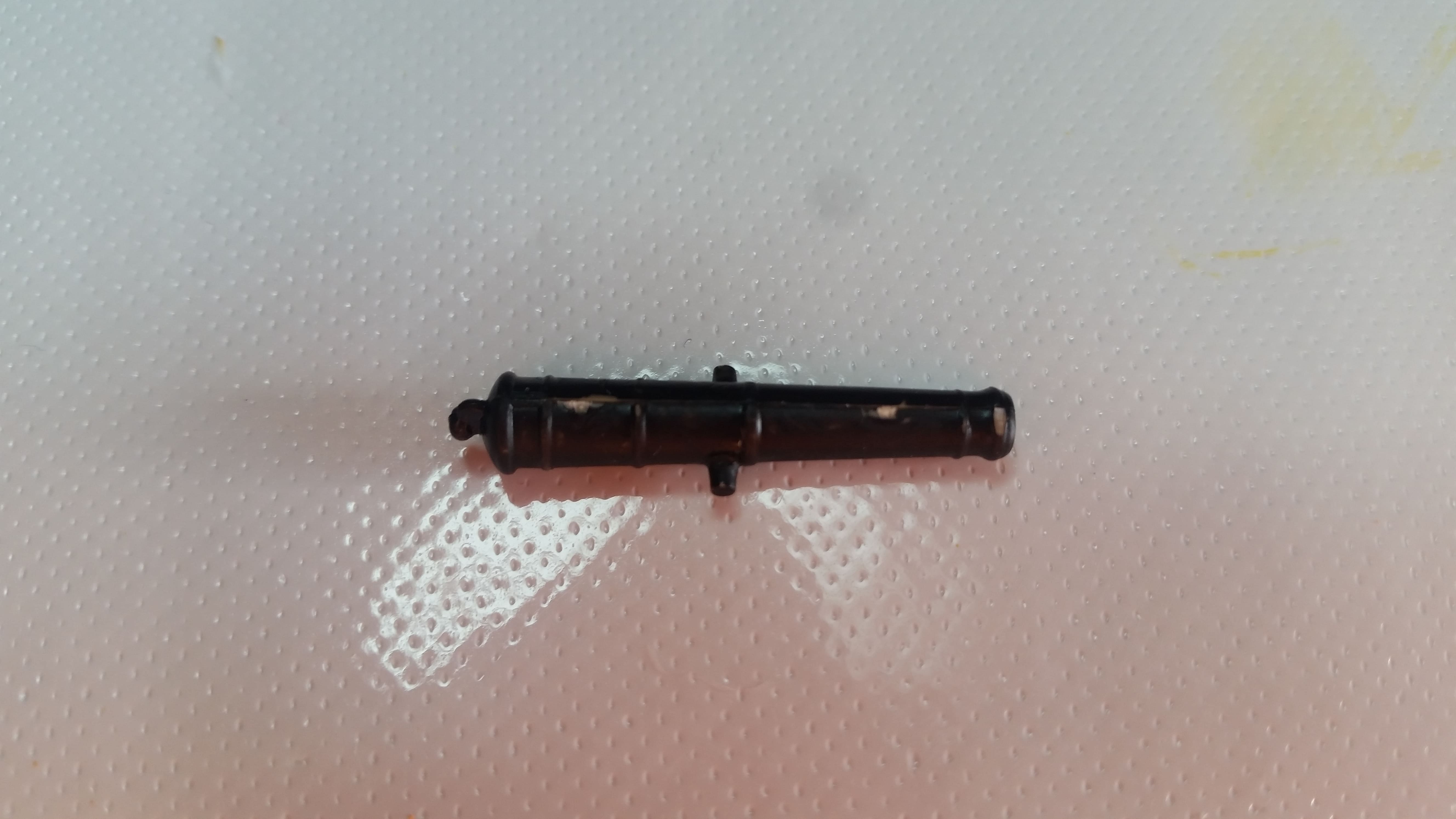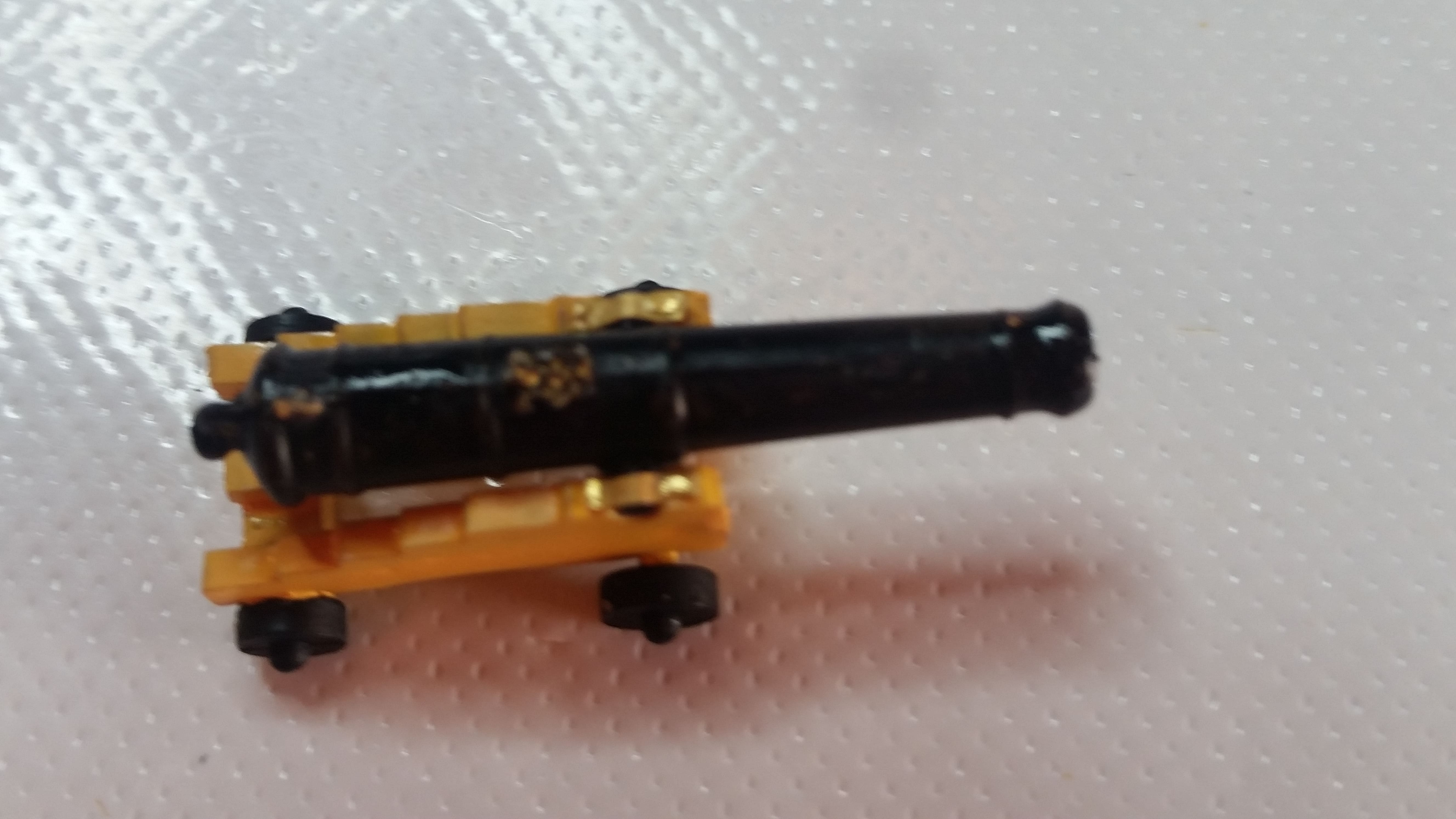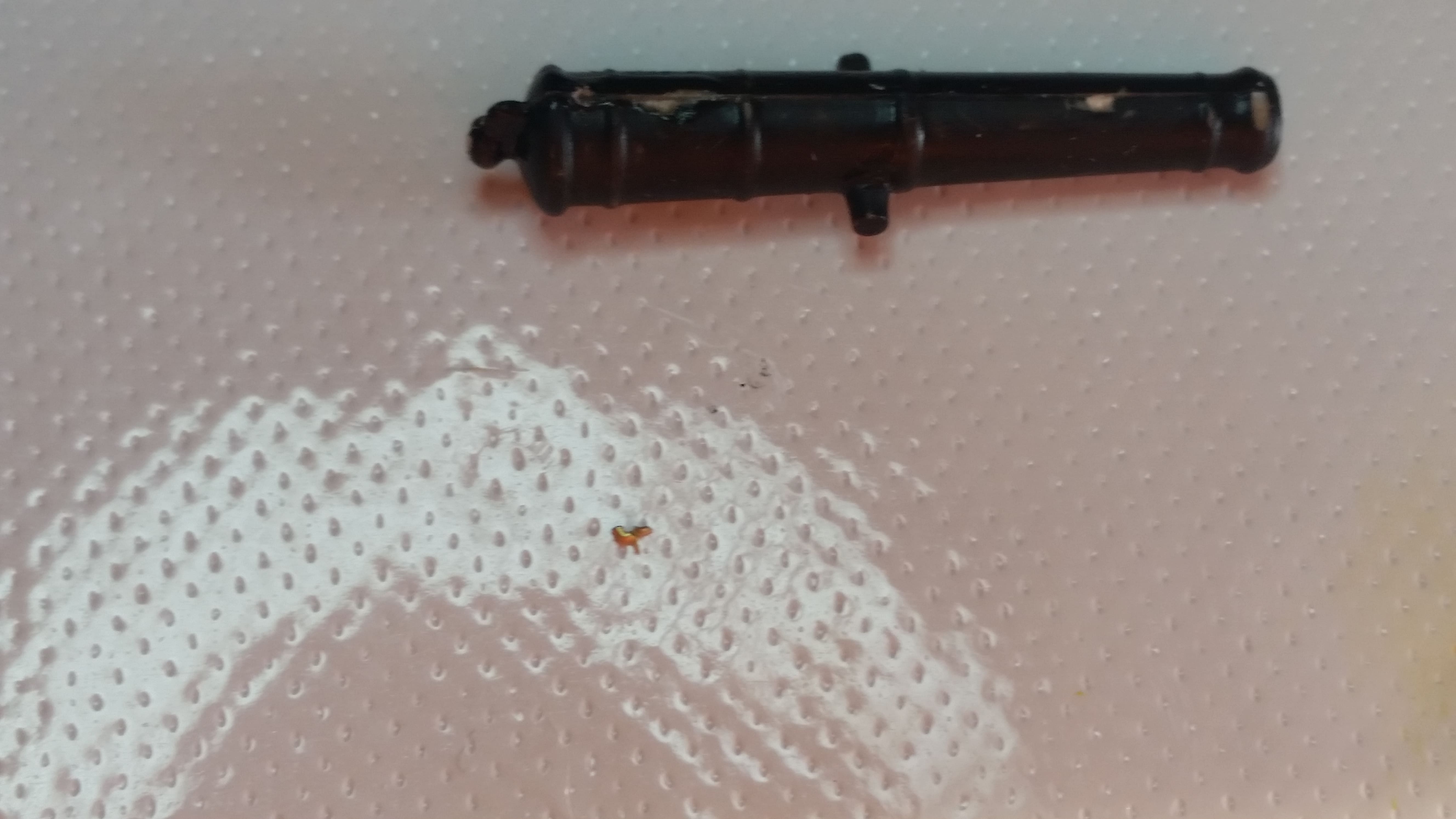 Hier der Aufbau einer 32 Pfund Kanone des unteren Decks....30 Stück. Das kleine Teil (der Zünder,Zündschloß) muß oben auf den Kanonenkörper.Dazu ein kleines Löchlein oben in den Körper des Rohres gepiekst. Dann ein kleines Loch ins Pomelion gebohrt (0,5mm) den Wagen aufgebaut und bemalt (5 Teile) Die Kanone in die Führung eingesetzt. Die Flappen für die Halterung der Kanone sind angebracht (Ätzteile) Das Monogram oben auf dem Rohr. Zwei kleine Löcher für die Augbolzen mit Ring. Augbolzen und Ring Beide zusammengefügt (eingefädelt) und angebracht. Dann die Ätzteile noch bemalen und fertig ist das Geschütz.