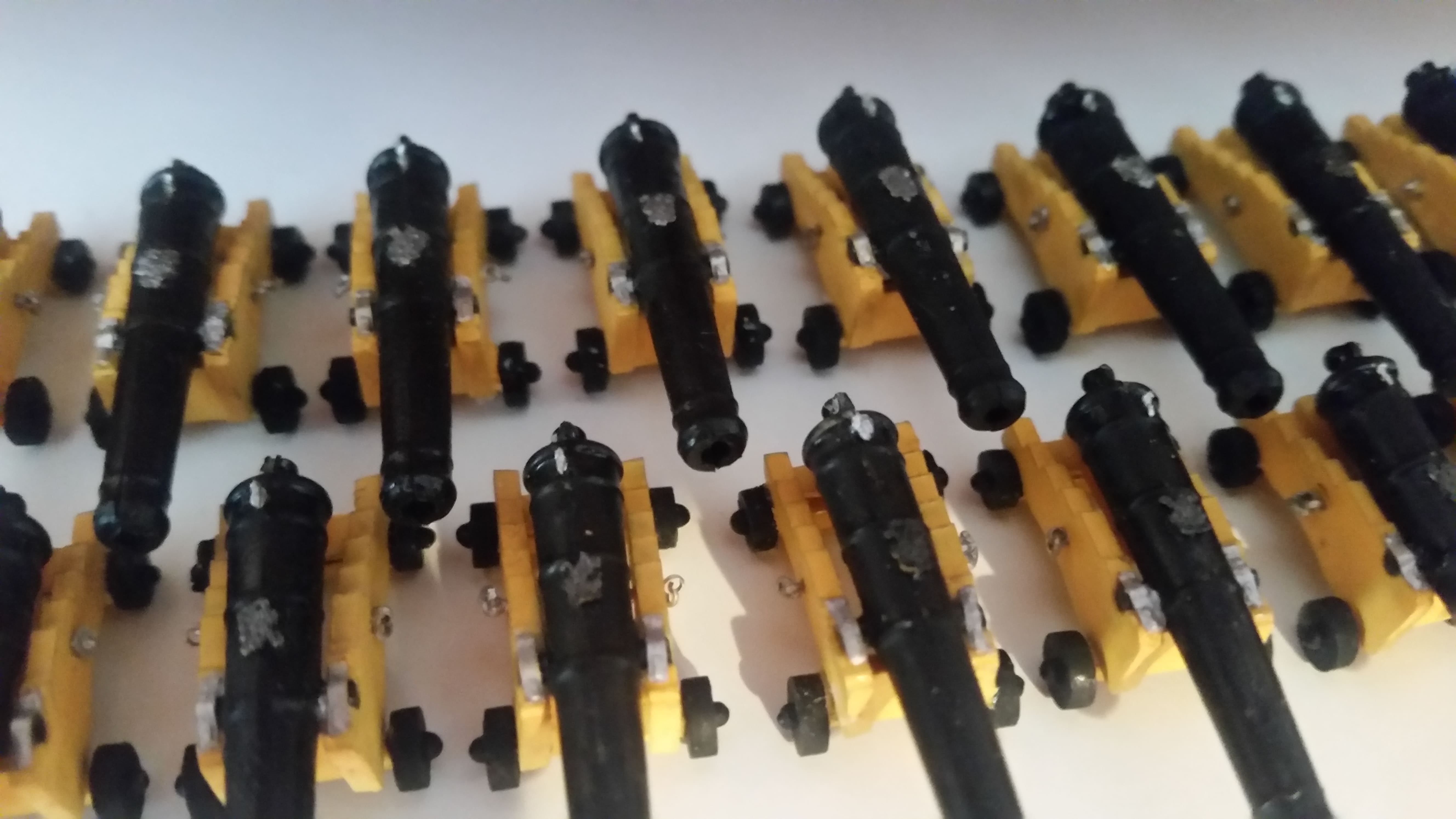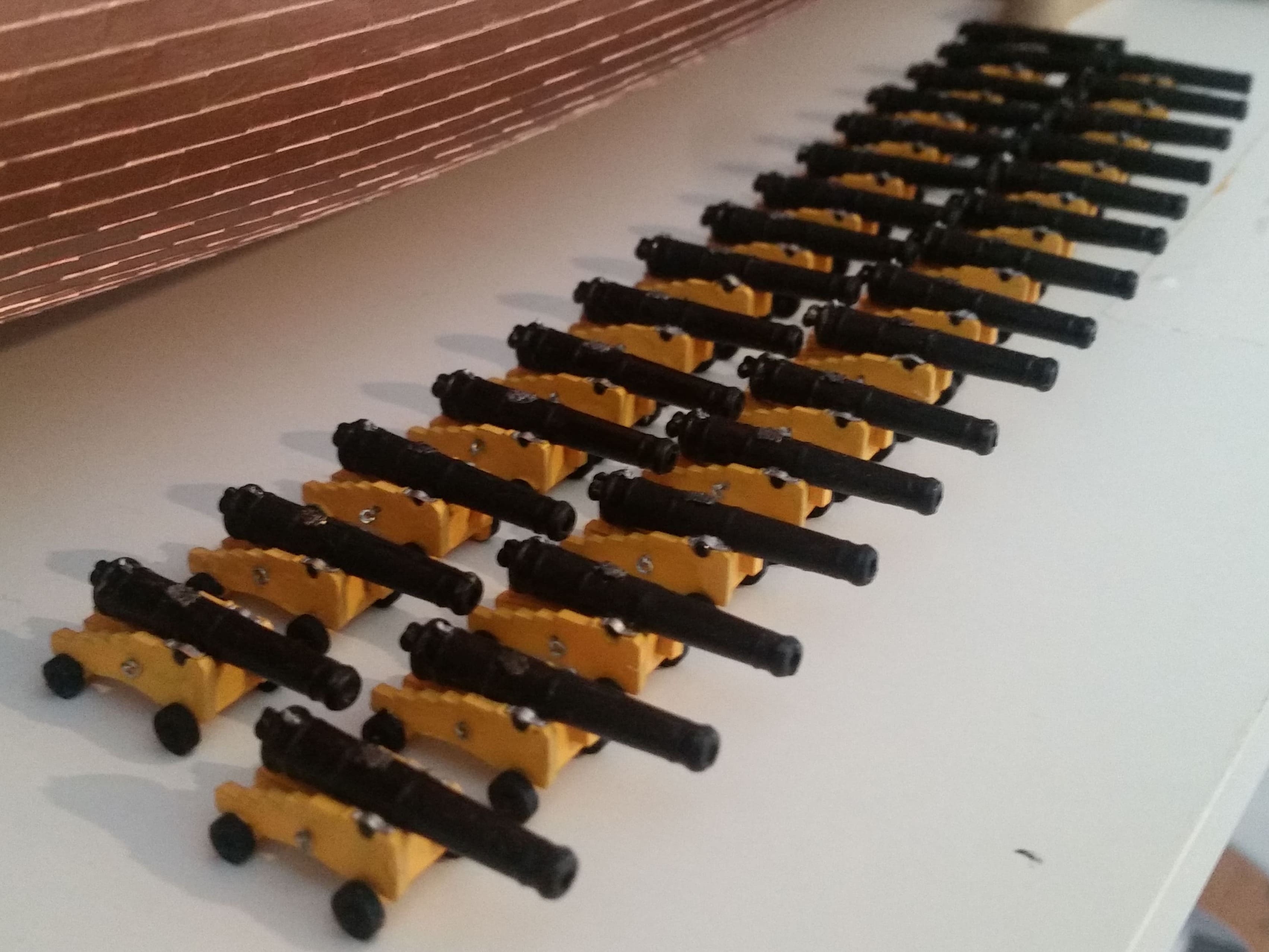 Die ersten 30 Geschütze, die 32 Pfund Kanonen, sind fertig. Jetzt kommen nochmal 30 Geschütze mit 24 Pfund. Die sind genauso aufgebaut wie die 32 Pfund Kanonen und kommen dann auf das Deck über dem untersten Deck. Nach und nach werde ich die Bewaffnung auf dem Unterdeck plazieren und auch mit Brooktau versehen. (Das wird auch nicht einfach aber sonst lohnt ja der ganze Aufwand nicht