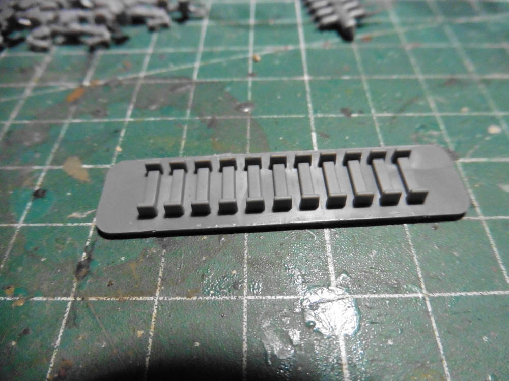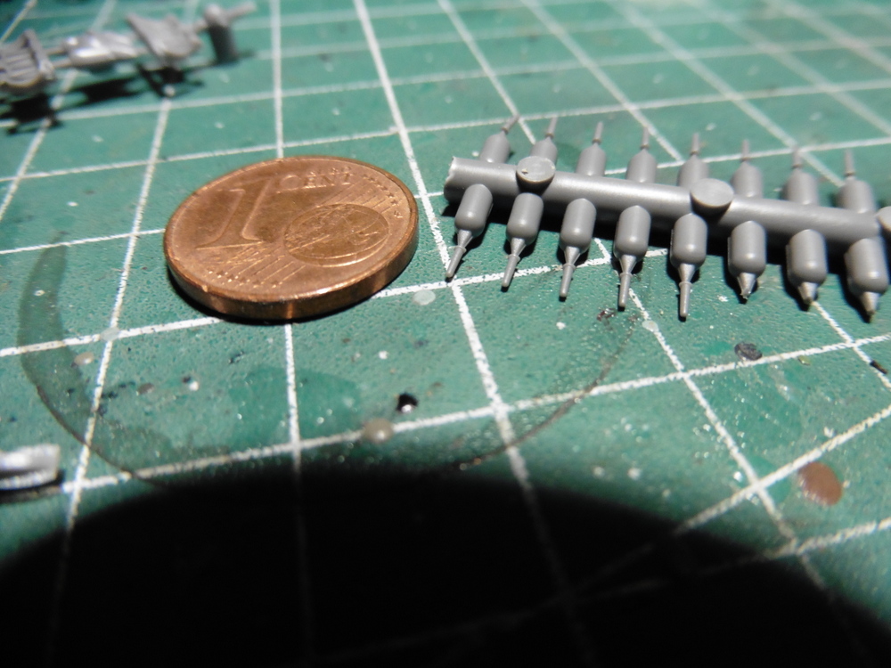 Sollte man das dann bei 10 Kettengliedern irgendwann mal schaffen , schneidet man die Bolzen einfach vom Spritzlig mit nem Kutter . Das Ganze natürlich von beiden seiten . Hatt man dann 10 Kettenglieder fertig verbunden und nimmt diese dann aus der Schablone isses ja nicht so , das von 20 Bolzen 5 wieder raus fallen . Die find dann erst mal wieder ..... arrrgggghhhhh