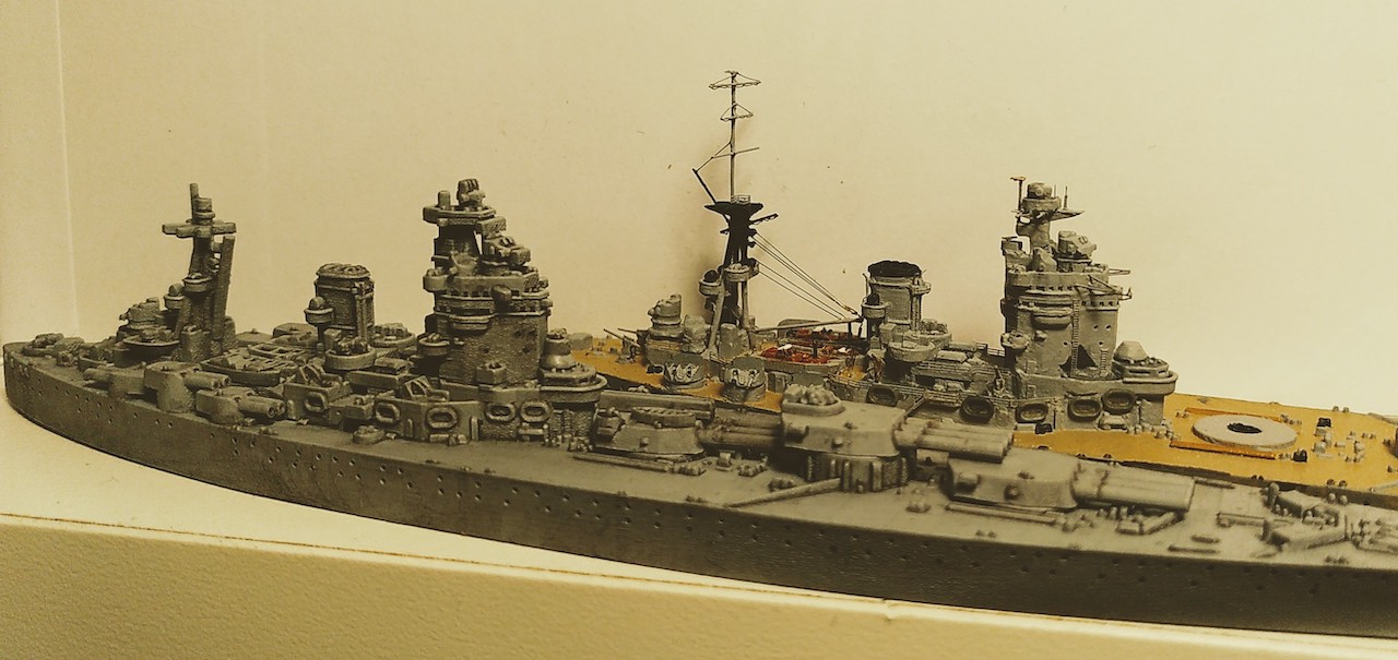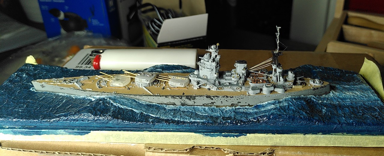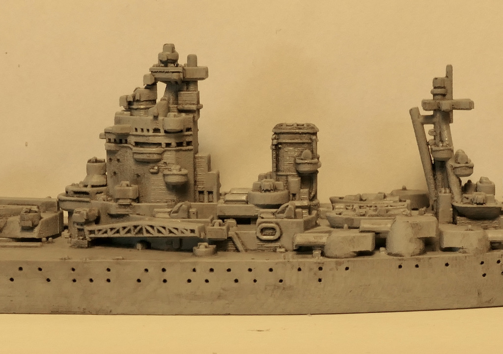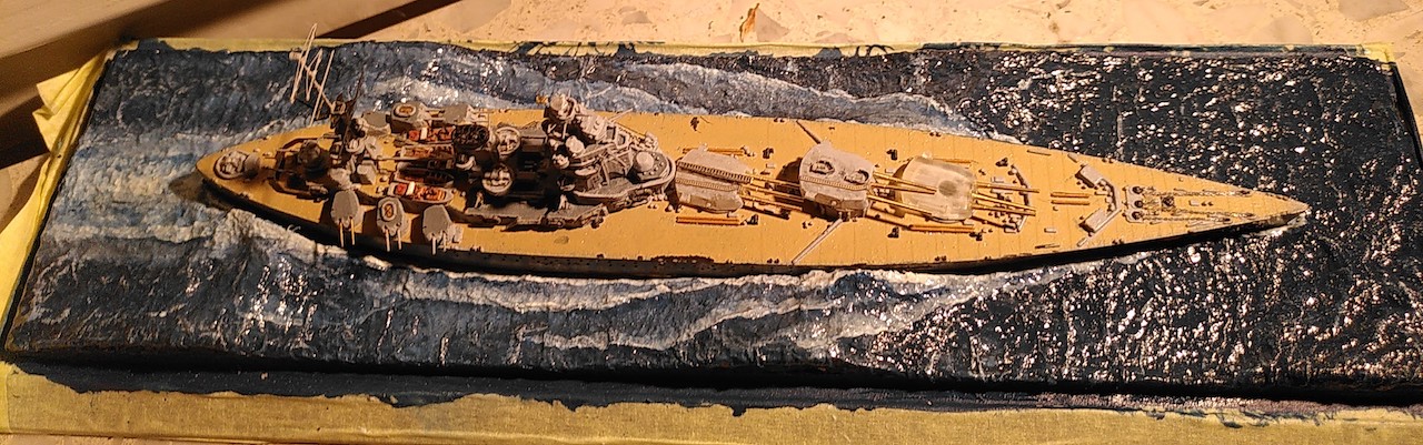 Kleine Anmerkung zum Modell: Zu sehen ist neu die schwere Artillerie mit den Lafetten so wie sie vor den ersten Salven gegen die Bismarck ausgerichtet waren. Bemalen werde ich sie demnächst mit meiner kürzlich erworbenen HS Ultra - mit dem Pinsel muss ich grundsätzlich einfach zu viel Farbe auftragen bzw. sind homogene Flächen bei dem Massstab sehr schwierig. Bin gespannt, ob die Arbeit mit der Airbrush meine Erwarten erfüllt.