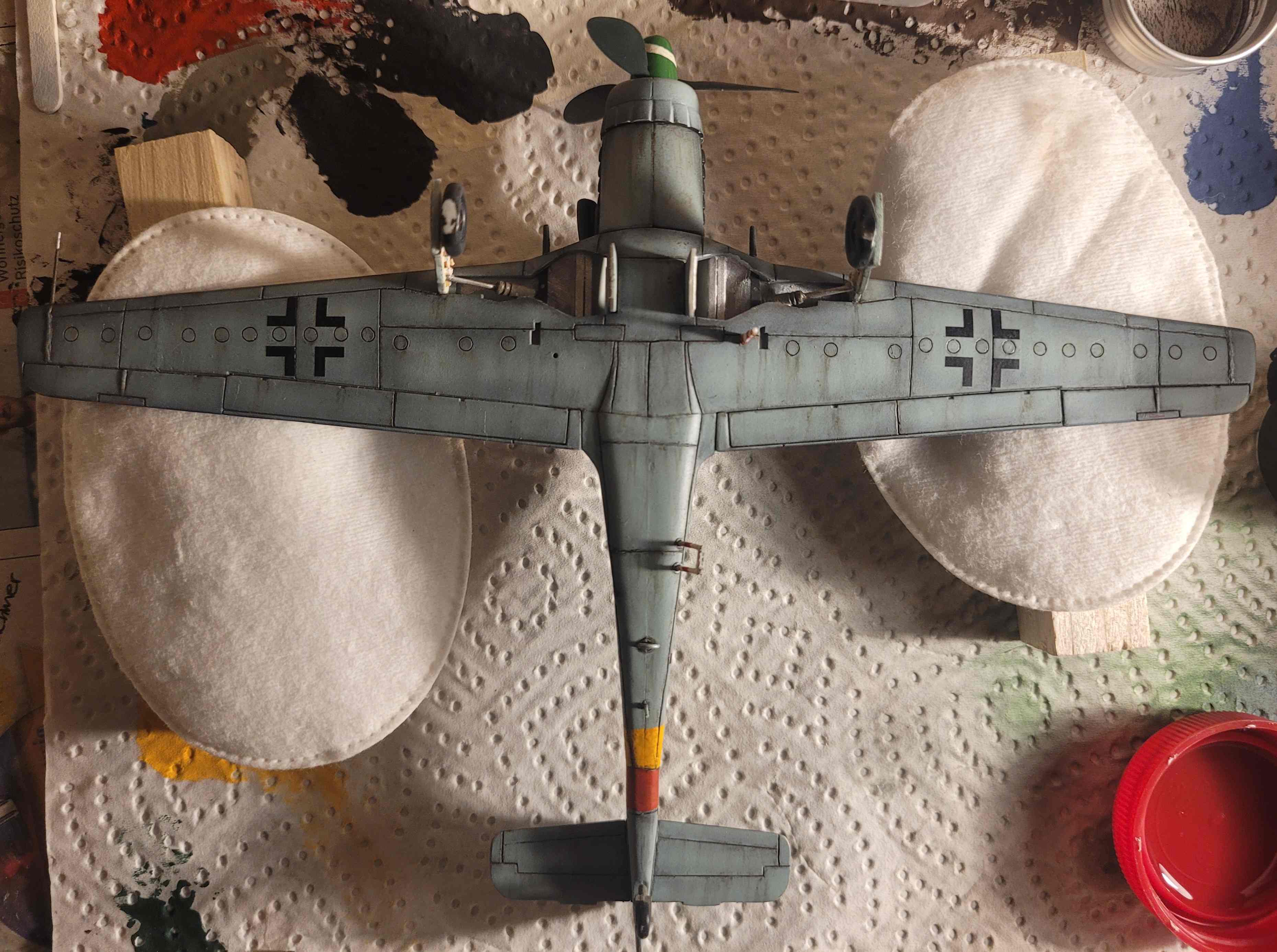 Und, was mir noch aufgefallen ist: was die weitere Alterung angeht, ist auch nicht übermässig viel drin, wenn man einigermaßen historisch korrekt bleiben will. Der Flieger wurde erst 1944 in Dienst gestellt, kann also maximal ein Jahr alt sein. (Schließlich sitzt da ja ein Pilot im Cockpit, kein Skelett