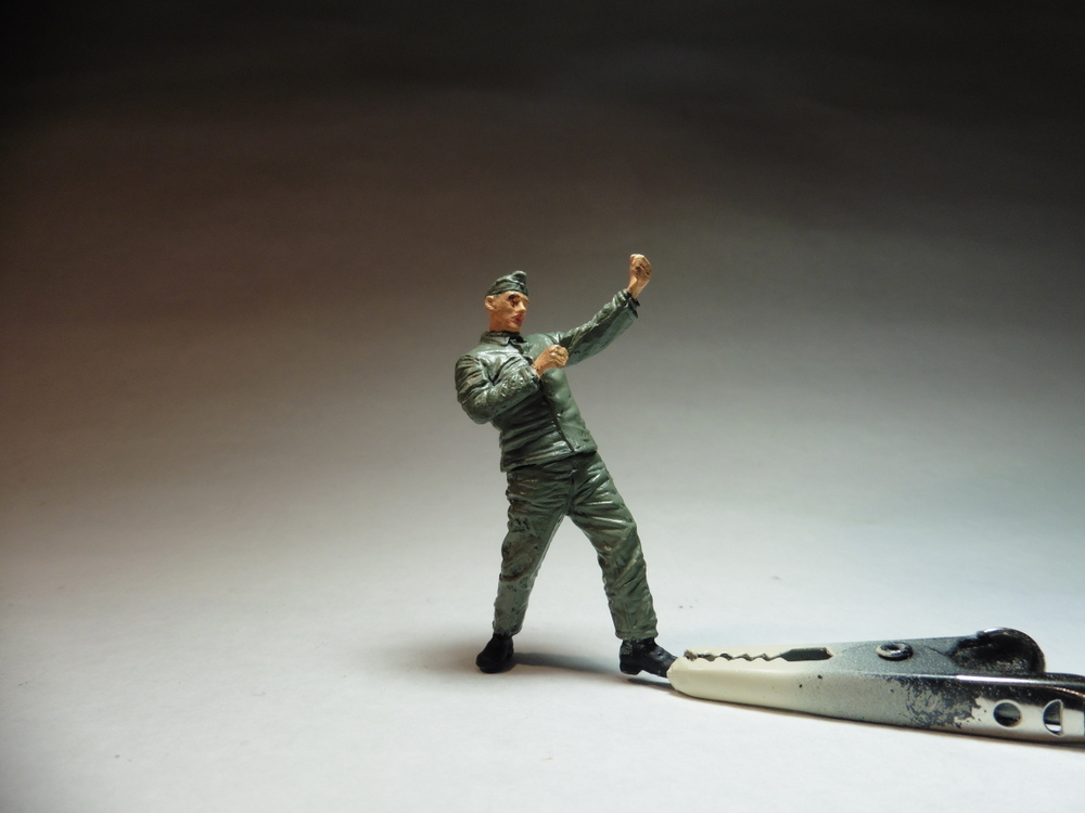 Die Ketten würde ich mit weniger Rostfarbe, dafür aber mit Erdfarbe, welcher der Grundfarbe des Diorama entspricht und Erdpigmenten (kann auch echter Staub vom Feldweg sein) behandeln.